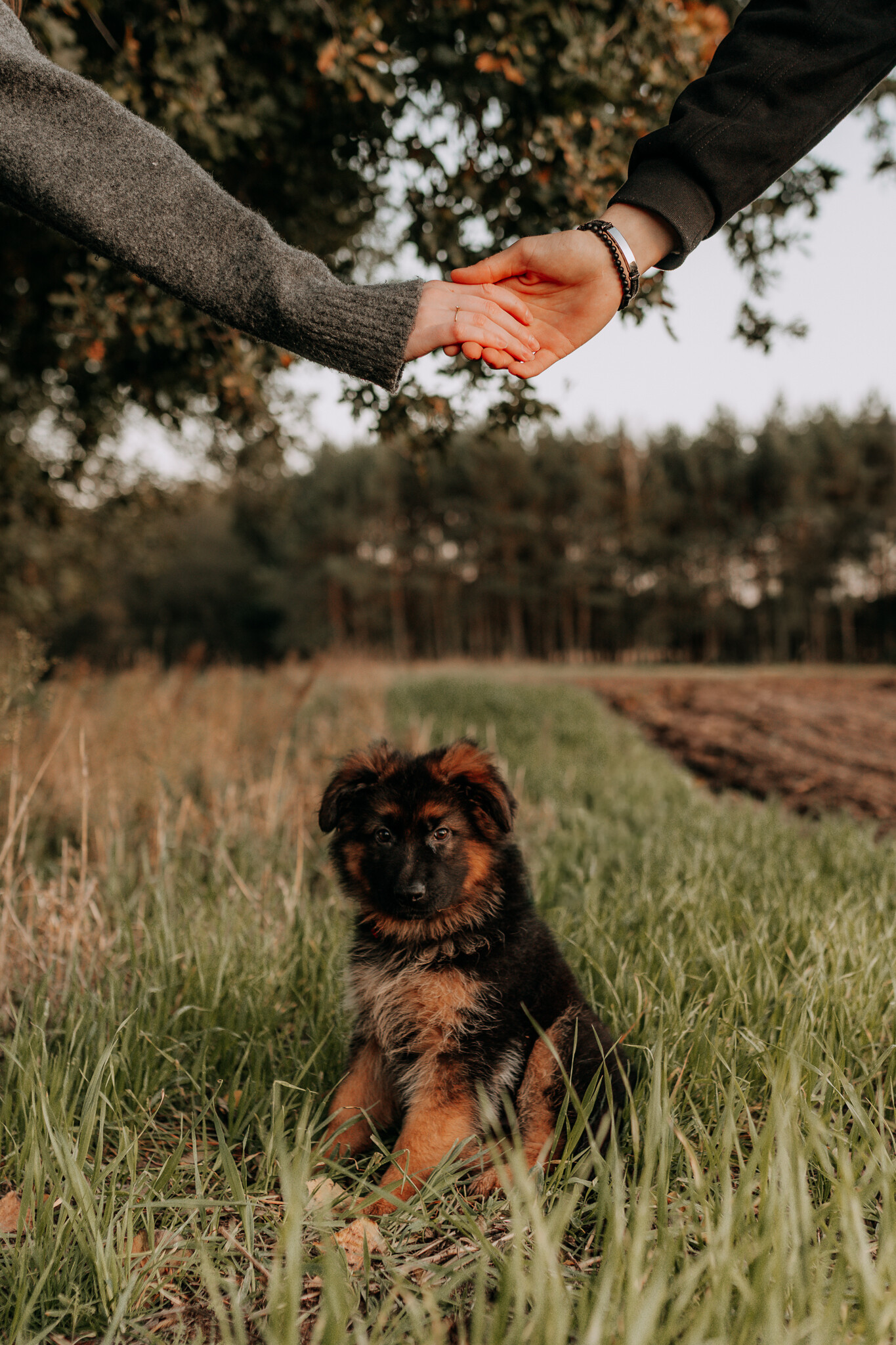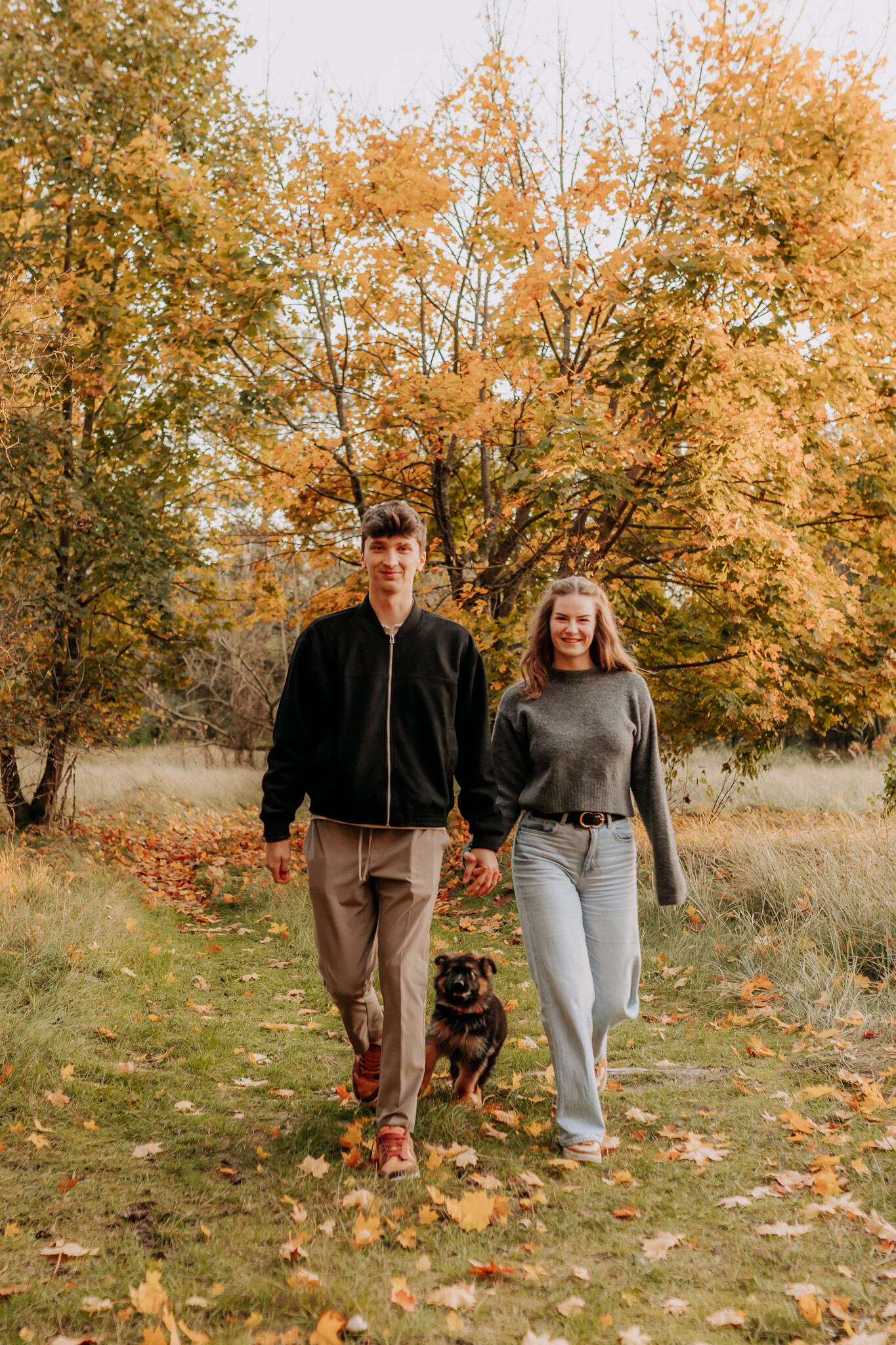 Pierwsza część sesji należała do szczeniaka. Było bieganie bez planu, nos w trawie, próby zjadania patyków i ramion Roksany na zmianę. Kadry powstawały same, bo nikt niczego nie udawał. Roksana śmiała się tym śmiechem, który pojawia się tylko wtedy, gdy nie ma kontroli. Błażej był dokładnie tam, gdzie trzeba. Obok. Aparat miał łatwe zadanie.