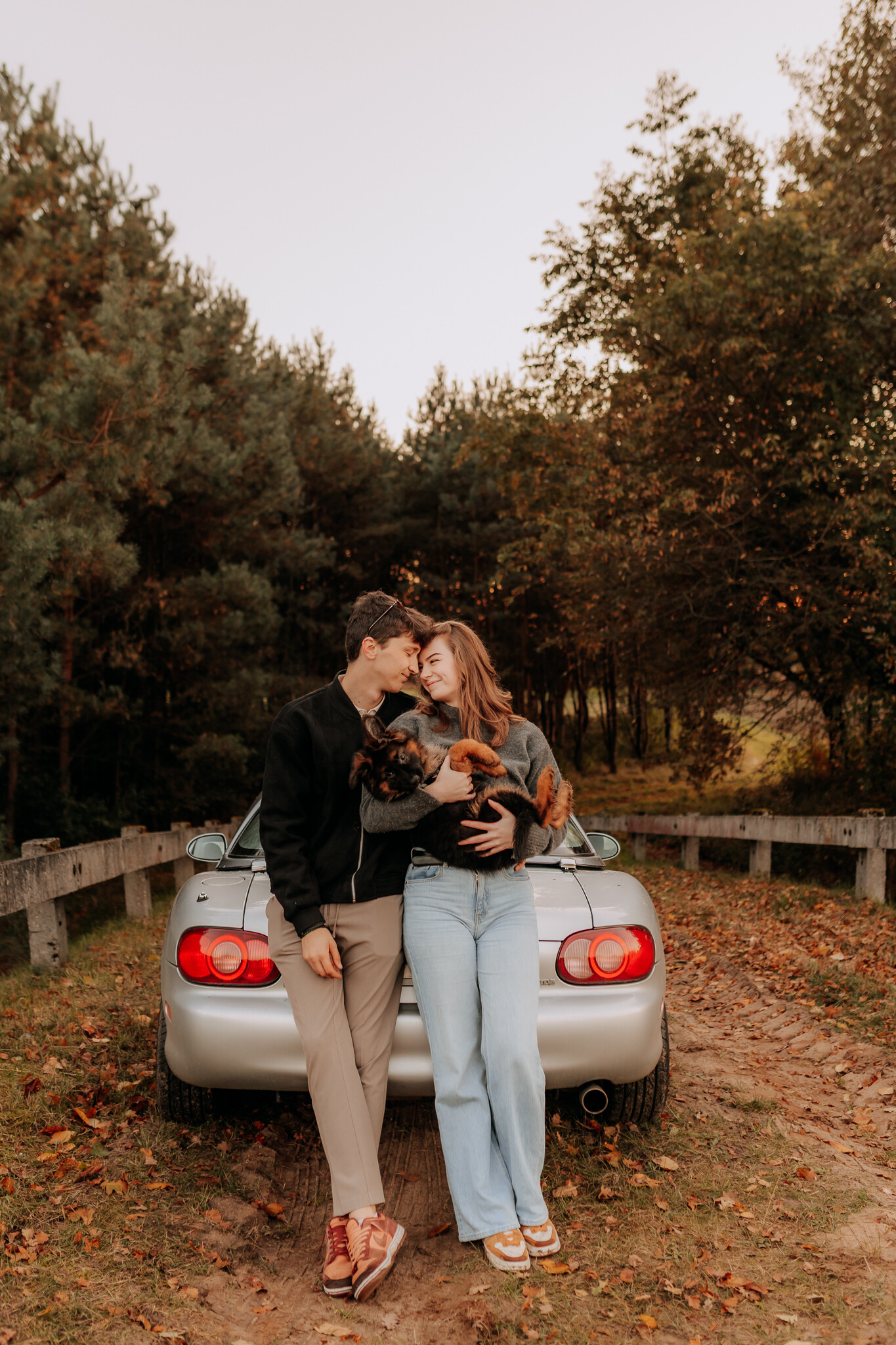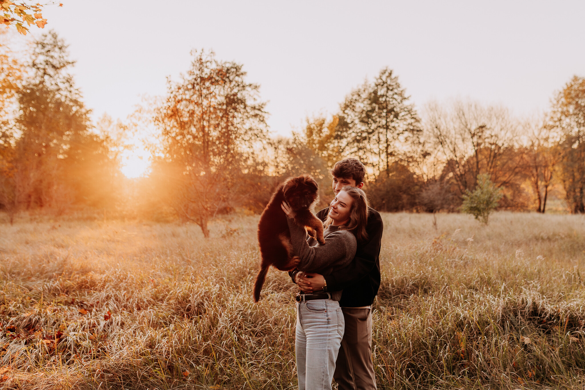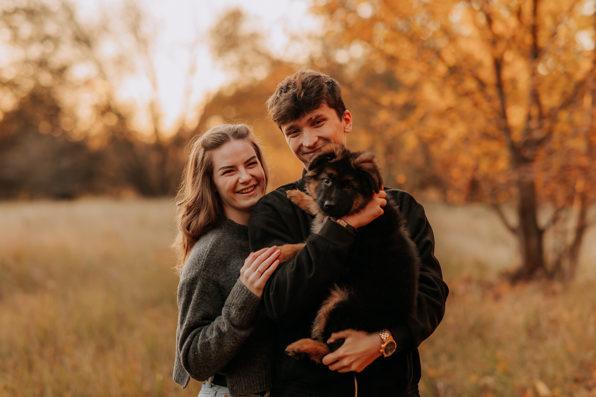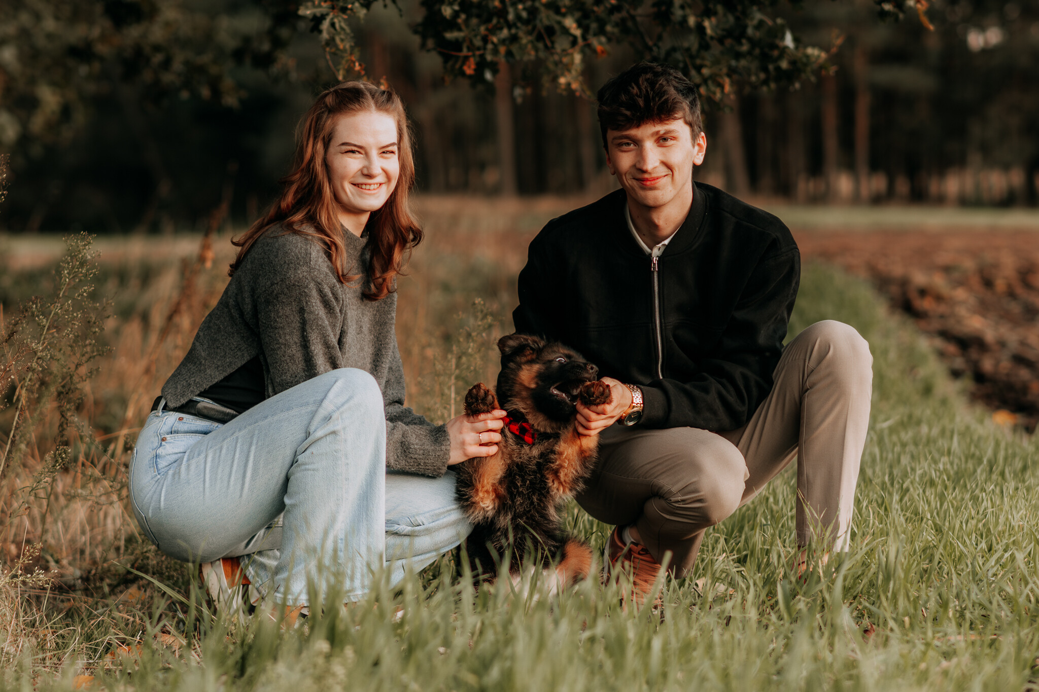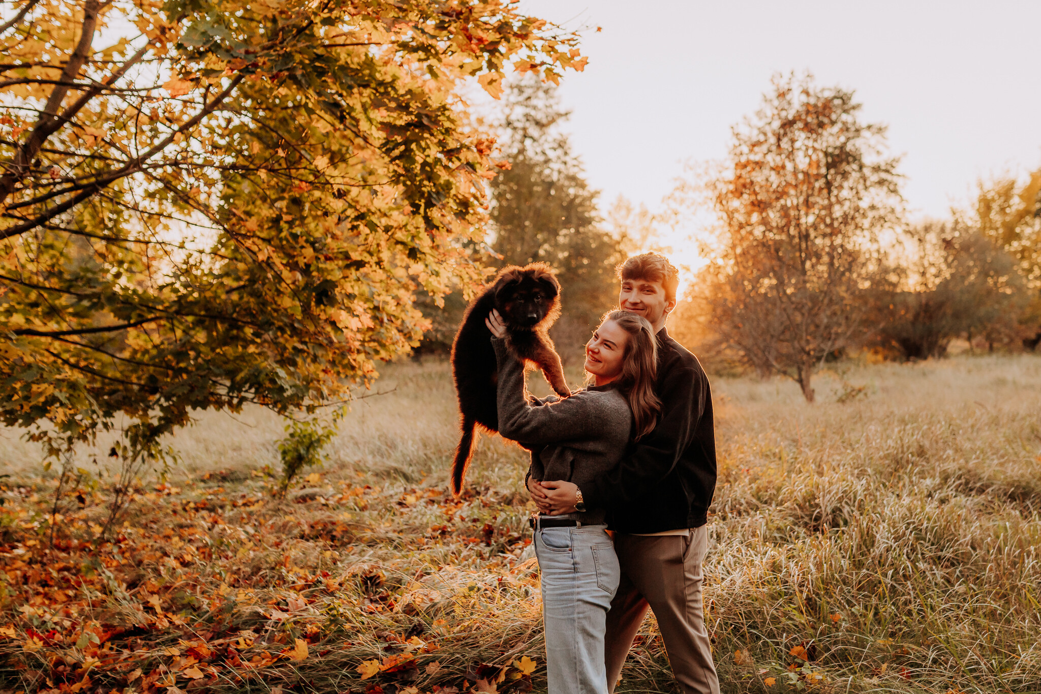 Ta historia zaczęła się dużo wcześniej niż klik migawki. Z Roksaną i Błażejem znamy się z Fundacji Funny Pets, więc od początku było wiadomo, że to nie będzie „zwykła” sesja narzeczeńska. Błażej rzucił kiedyś półżartem, półserio: zrobimy sesję, jak pojawi się szczeniak. I jak to w dobrych historiach bywa, słowo stało się ciałem. A raczej czterema łapami 🐾