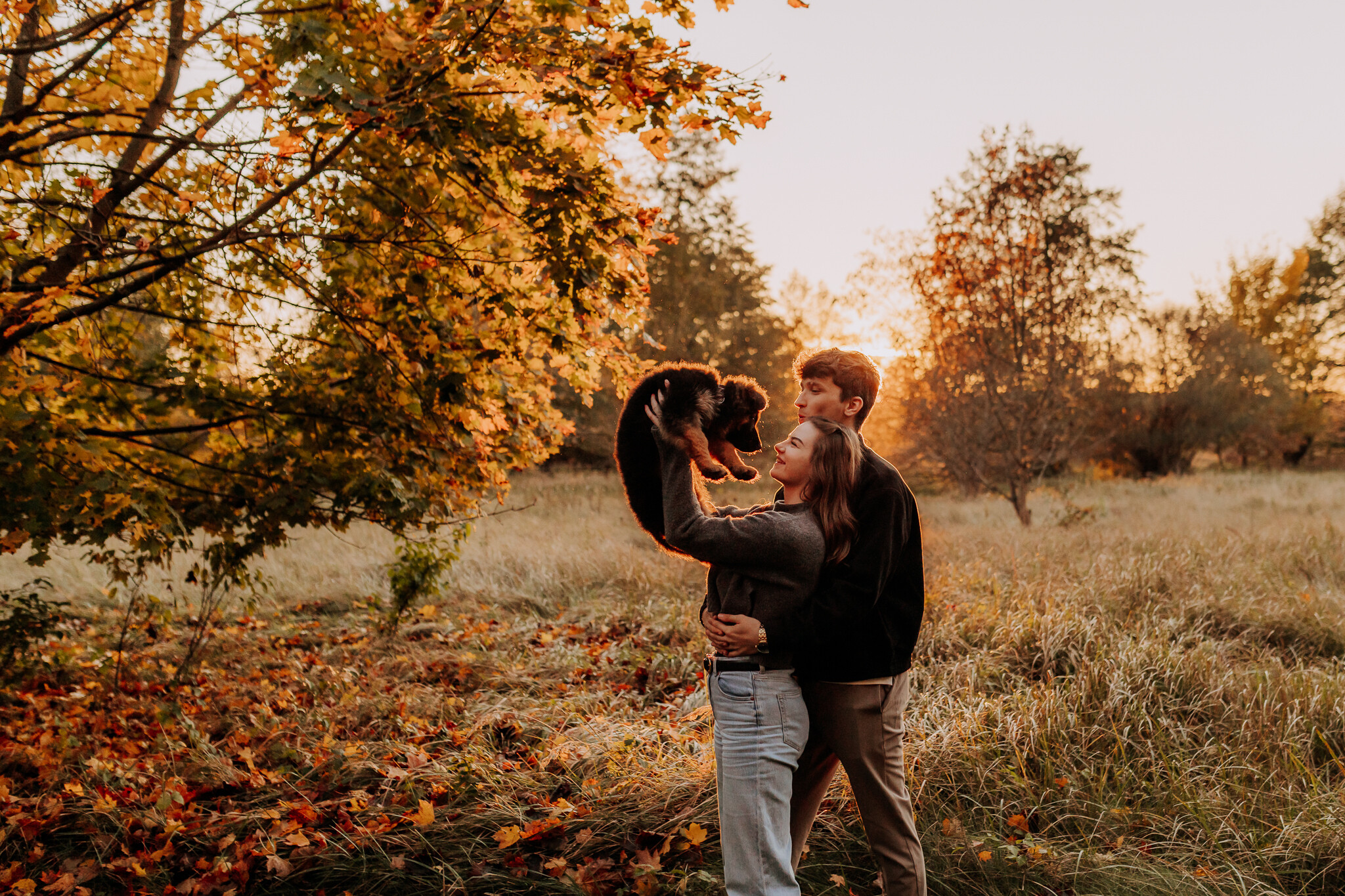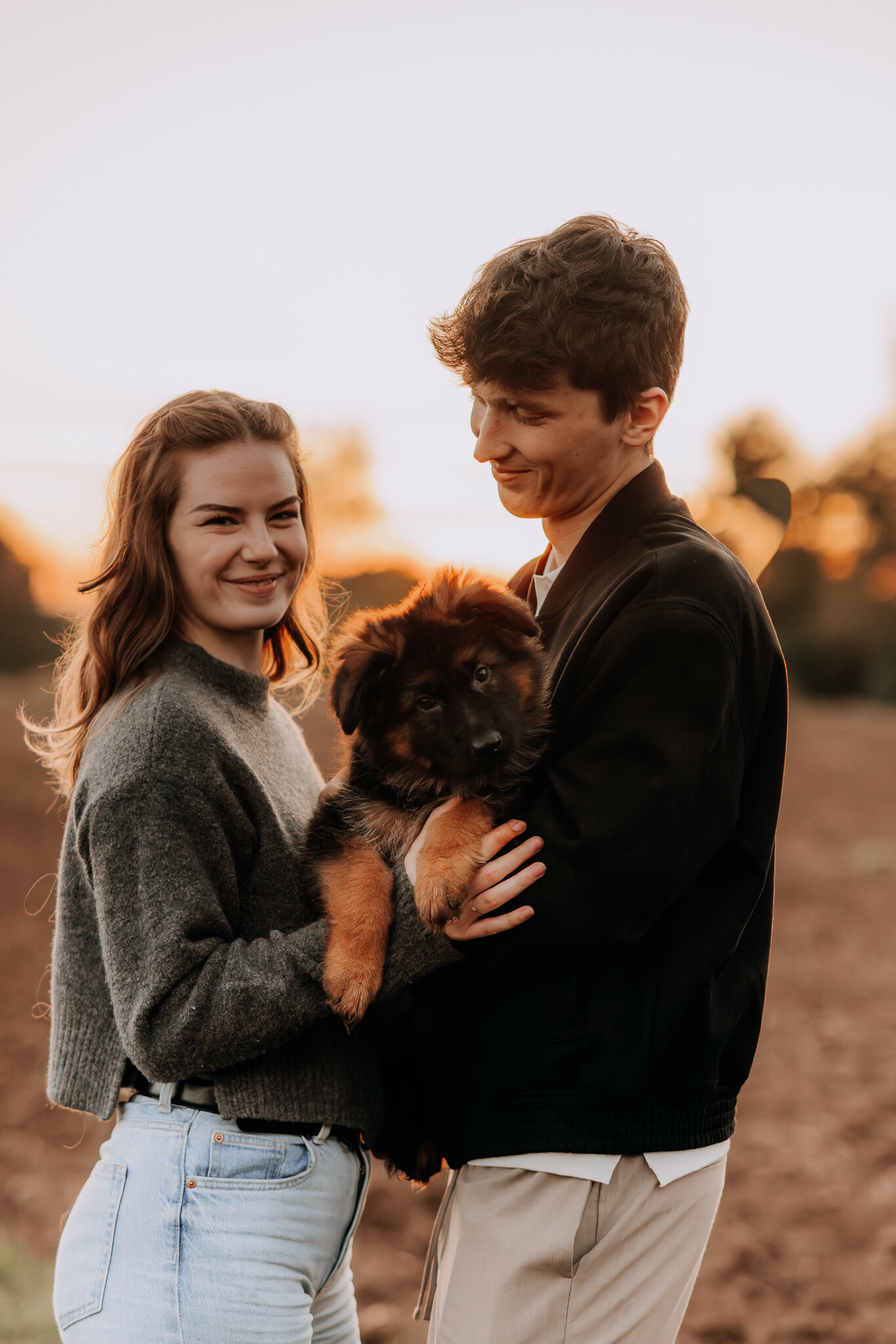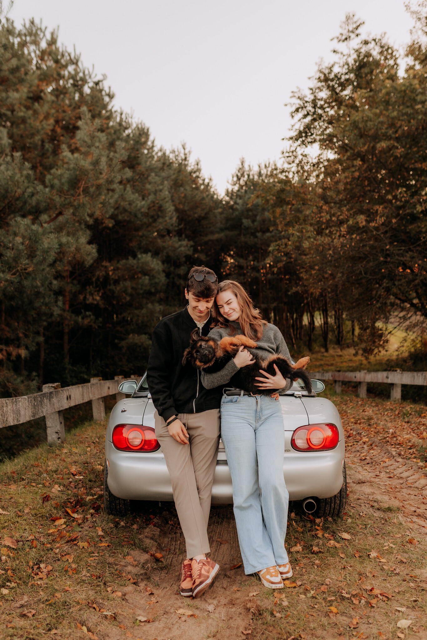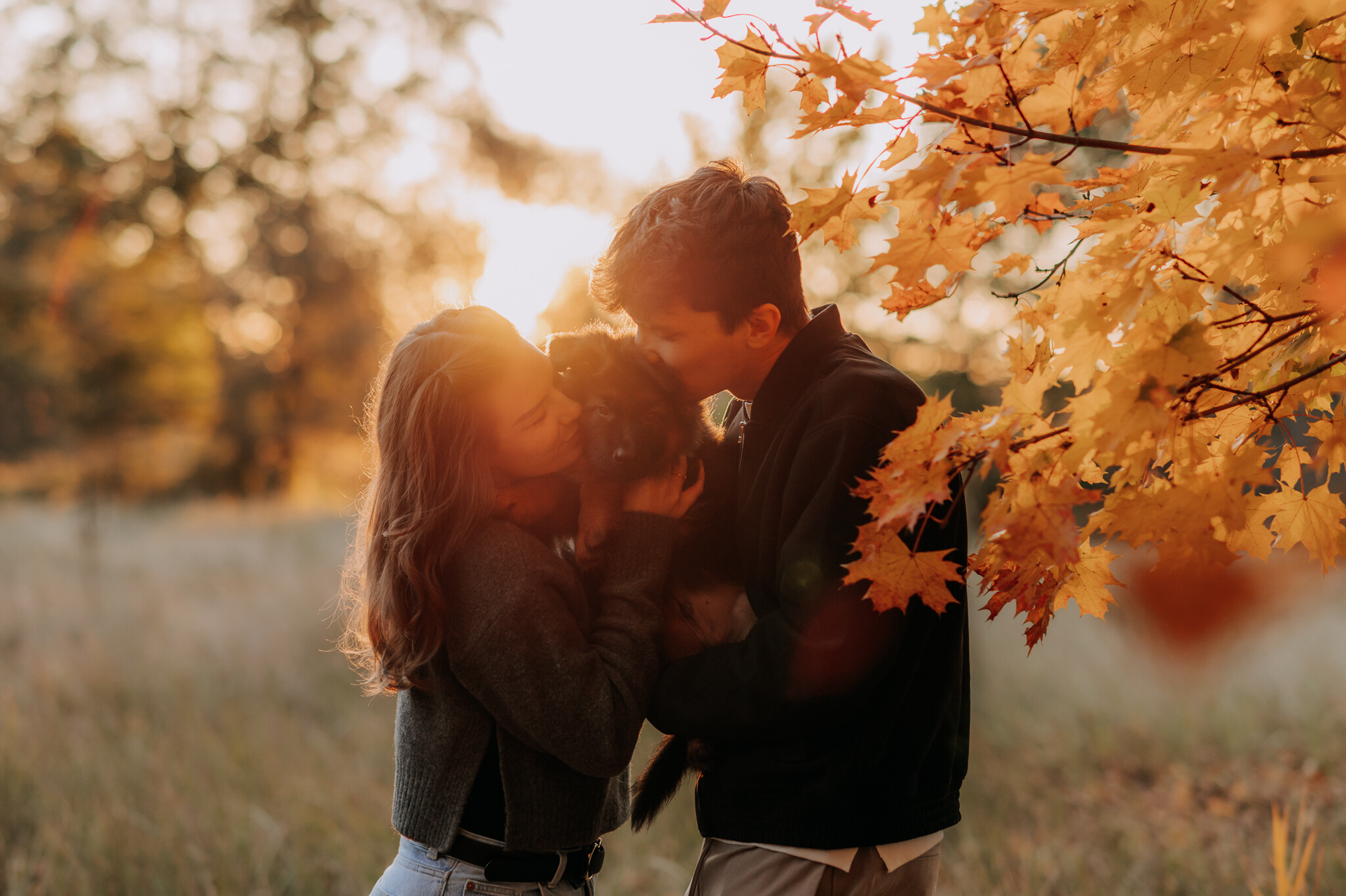 Ta historia zaczęła się dużo wcześniej niż klik migawki. Z Roksaną i Błażejem znamy się z Fundacji Funny Pets, więc od początku było wiadomo, że to nie będzie „zwykła” sesja narzeczeńska. Błażej rzucił kiedyś półżartem, półserio: zrobimy sesję, jak pojawi się szczeniak. I jak to w dobrych historiach bywa, słowo stało się ciałem. A raczej czterema łapami 🐾