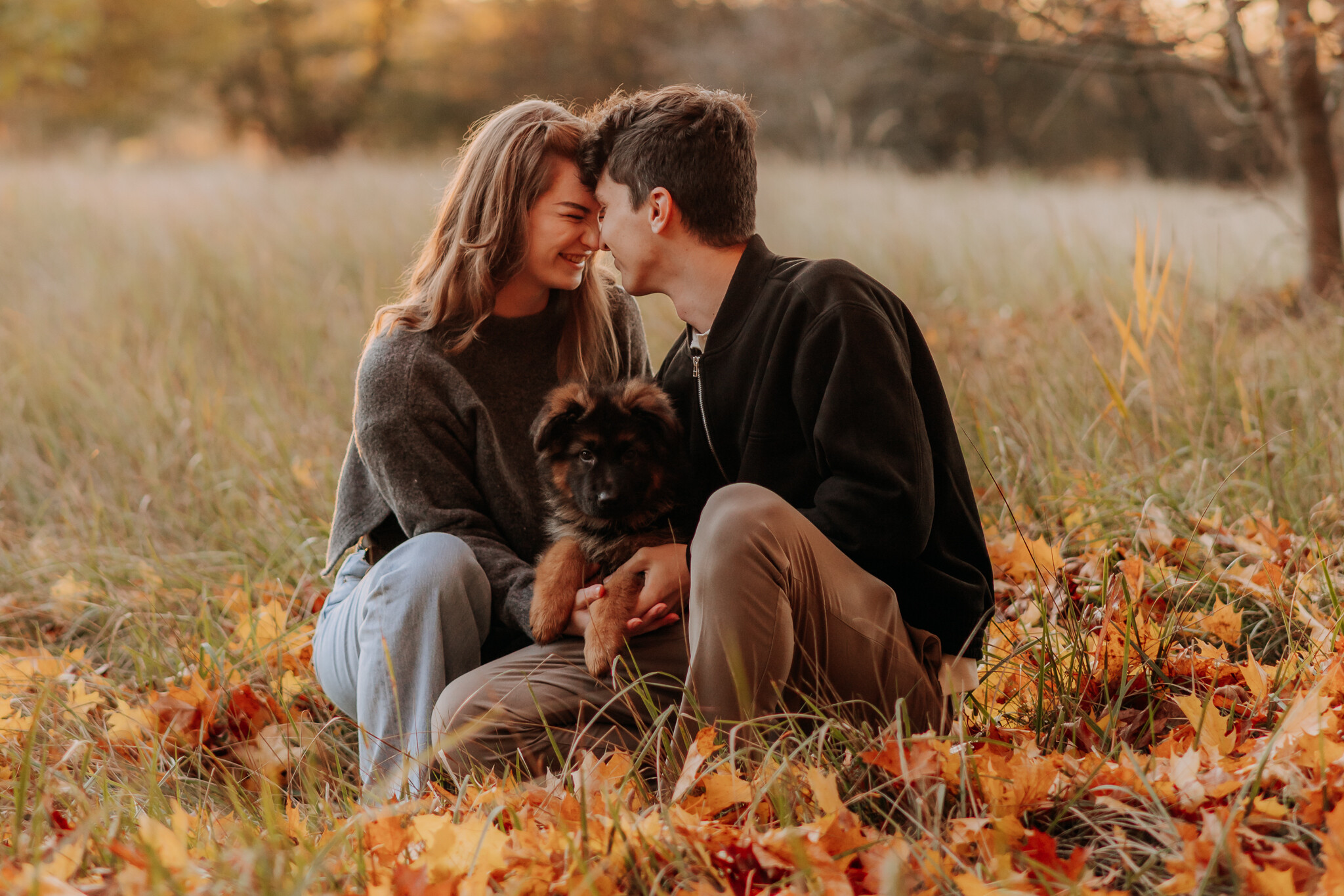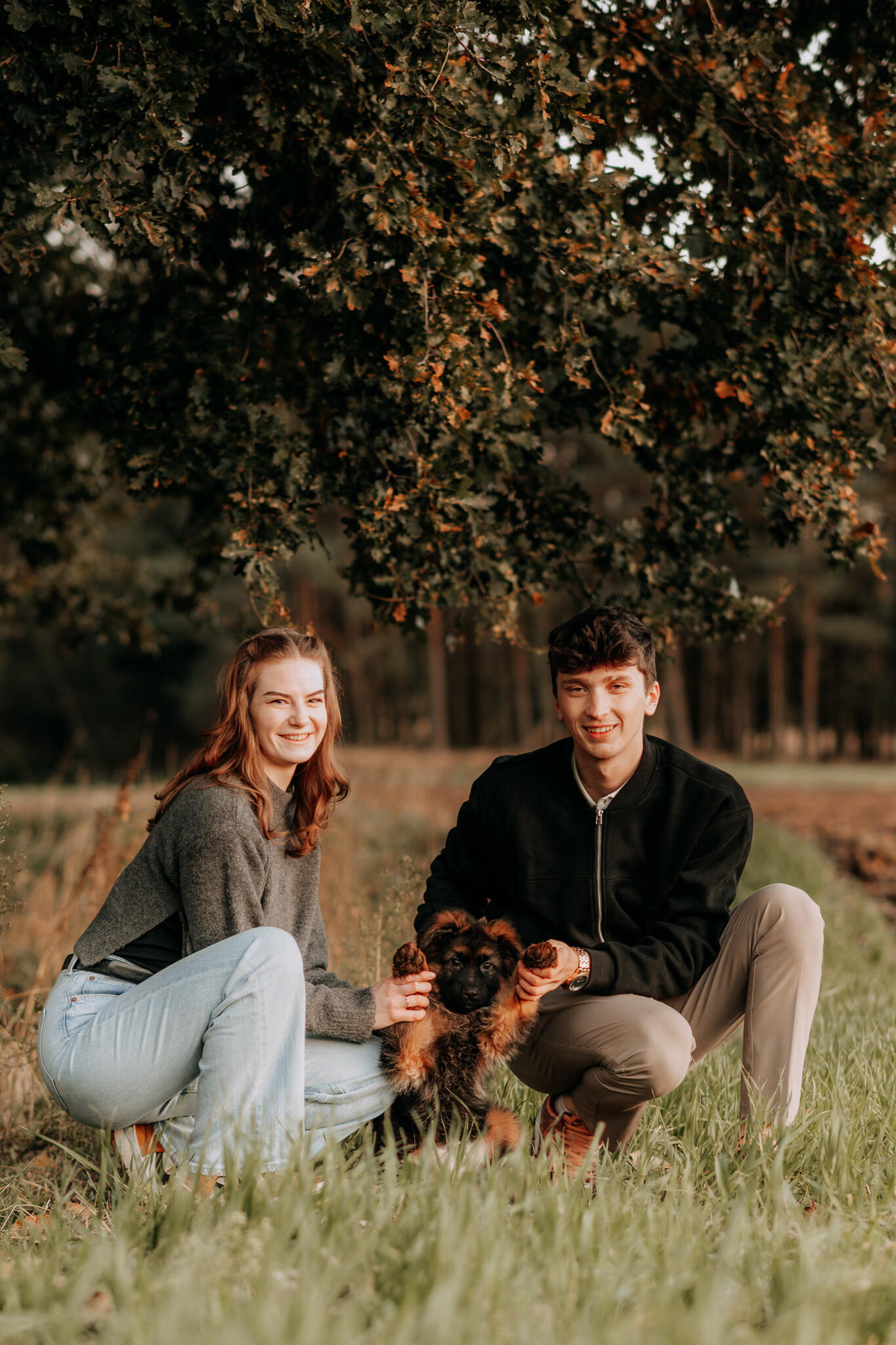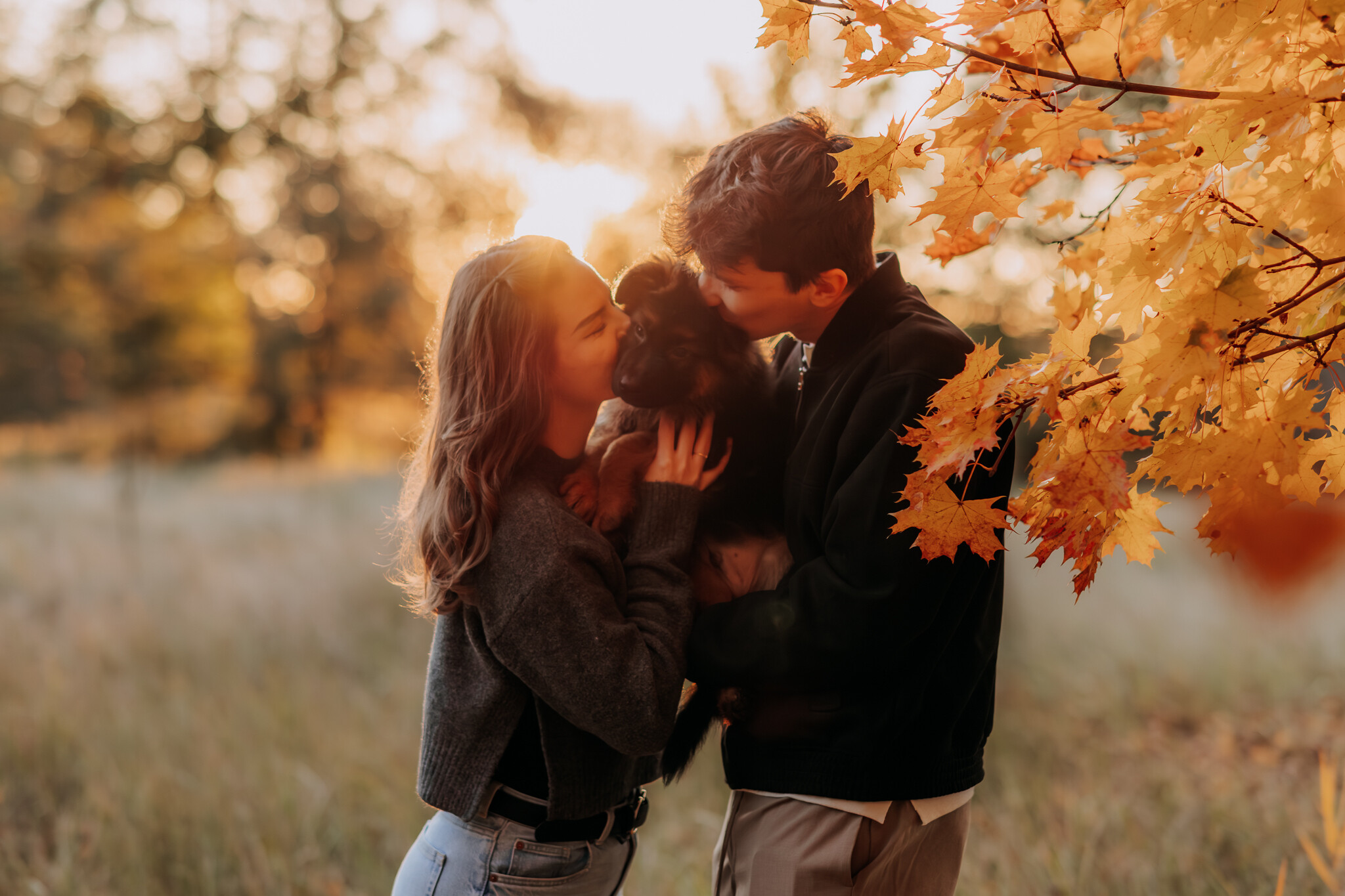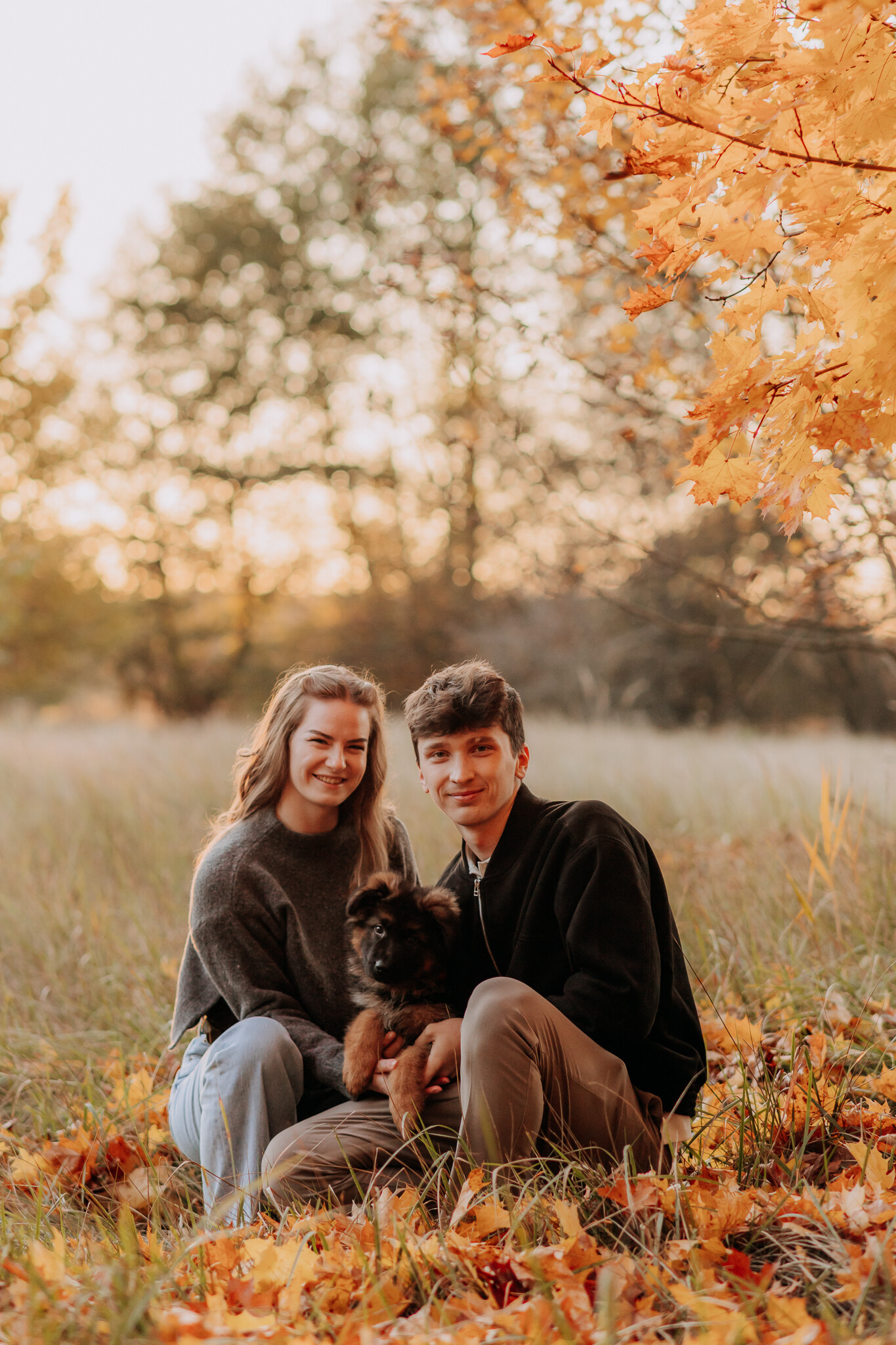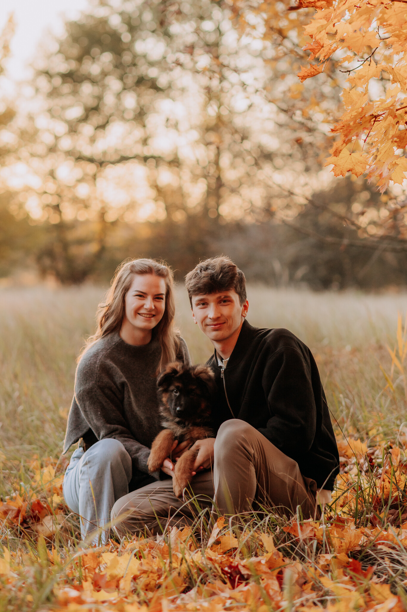 Ta historia zaczęła się dużo wcześniej niż klik migawki. Z Roksaną i Błażejem znamy się z Fundacji Funny Pets, więc od początku było wiadomo, że to nie będzie „zwykła” sesja narzeczeńska. Błażej rzucił kiedyś półżartem, półserio: zrobimy sesję, jak pojawi się szczeniak. I jak to w dobrych historiach bywa, słowo stało się ciałem. A raczej czterema łapami 🐾
