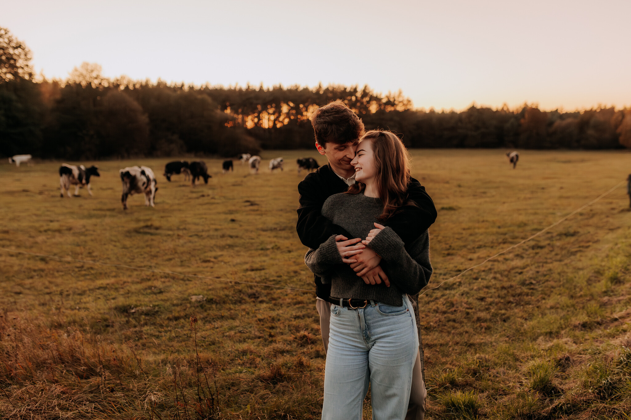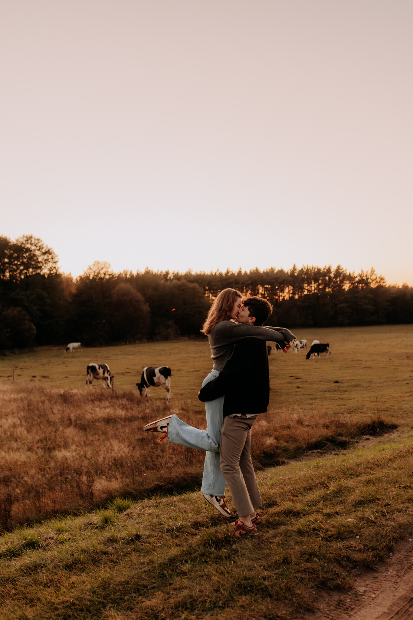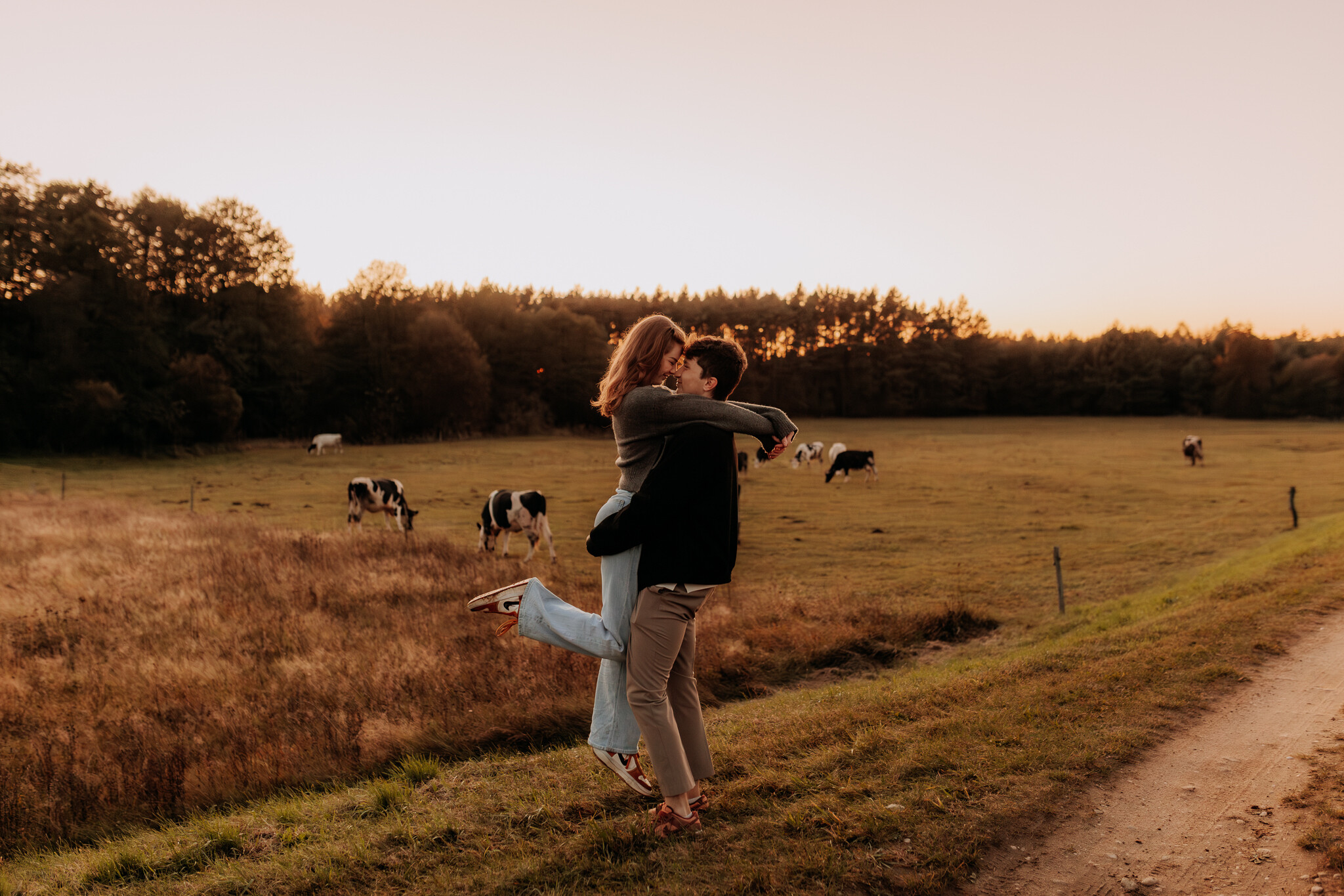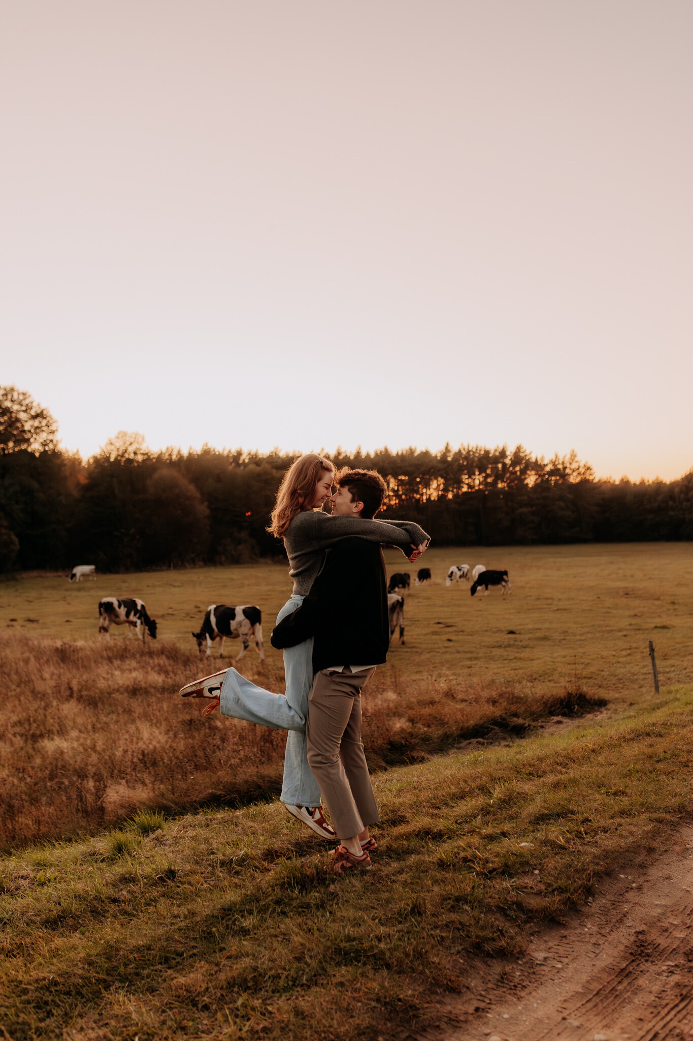 Gdy mały bohater zmęczył się światem, zrobiliśmy to, co w slow sesjach jest naturalne. Poszliśmy dalej. Zostawiliśmy szczeniaka na regenerację i ruszyliśmy w krajobraz, który otworzył się przed nami szeroko. Trafiliśmy na krowy, zupełnie nieprzejęte faktem, że ktoś właśnie tworzy narzeczeńskie kadry. Kilka zdjęć z nimi w tle ma w sobie ten rodzaj spokoju, którego nie da się zaplanować 🐄