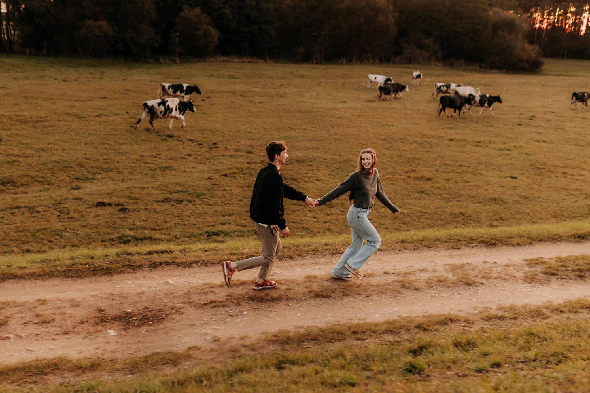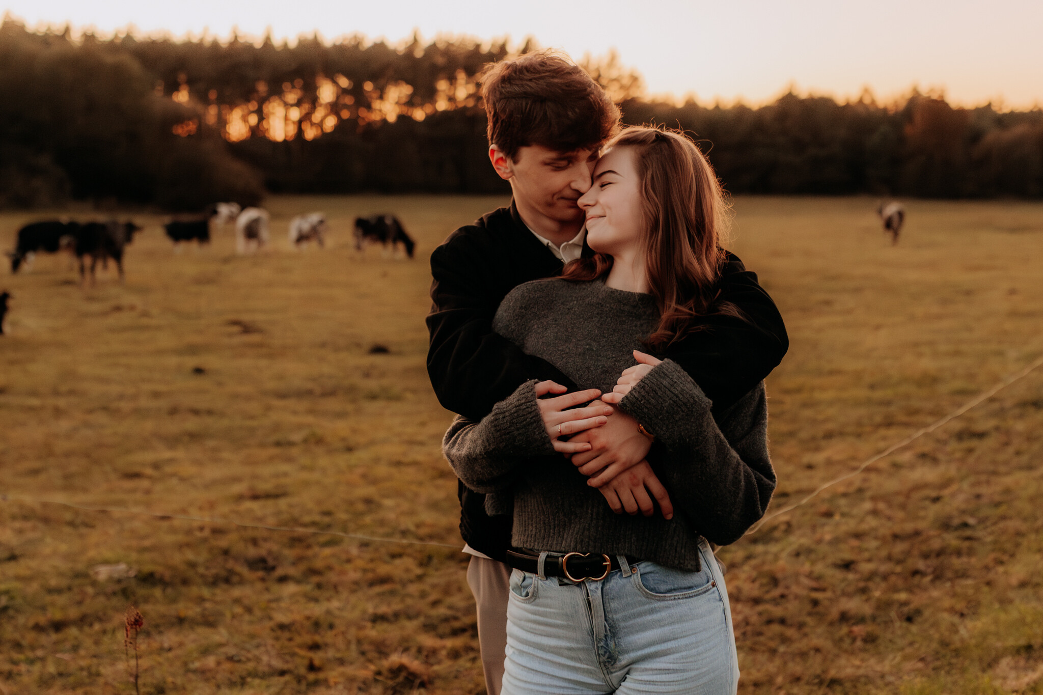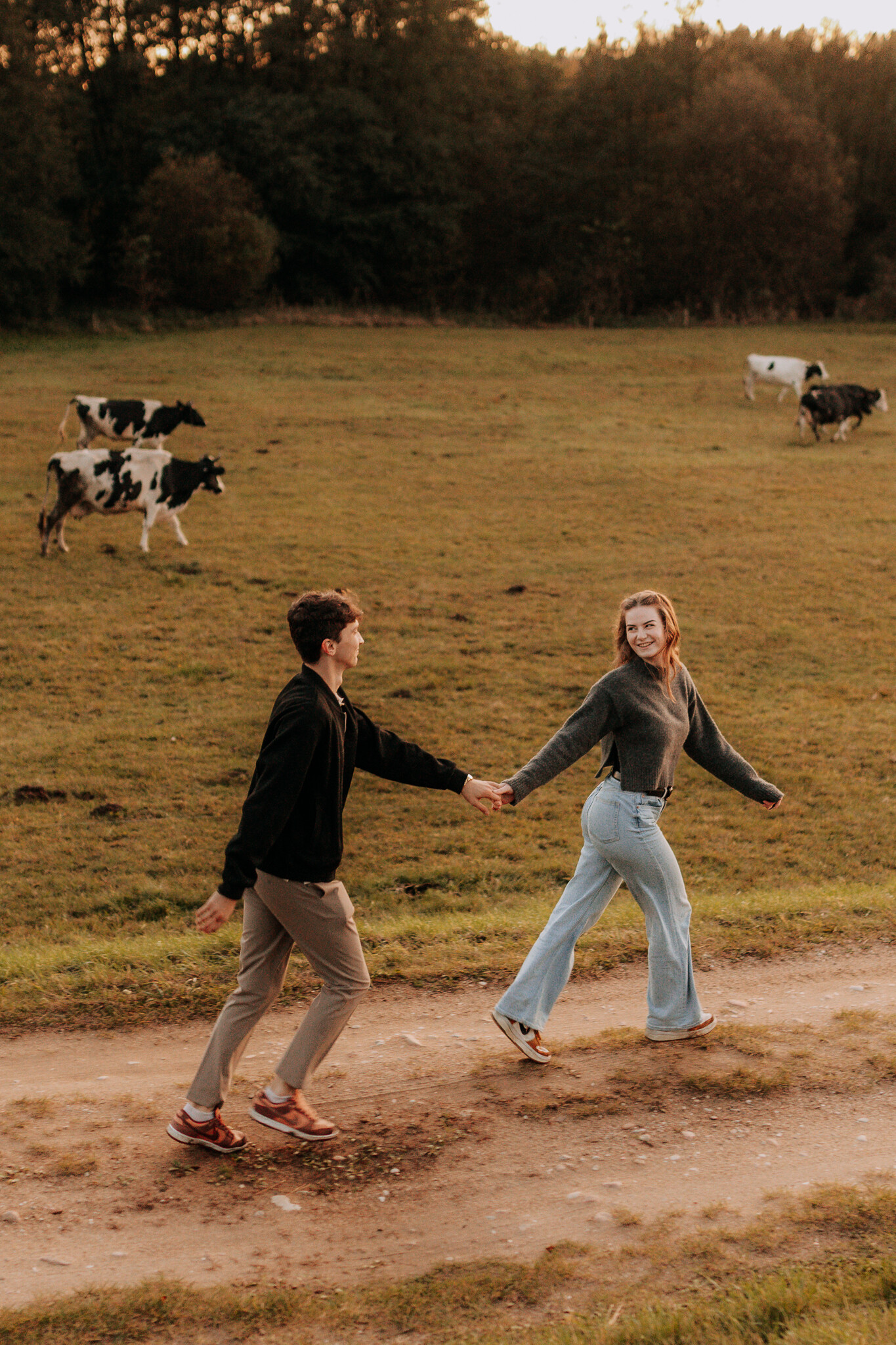 Gdy mały bohater zmęczył się światem, zrobiliśmy to, co w slow sesjach jest naturalne. Poszliśmy dalej. Zostawiliśmy szczeniaka na regenerację i ruszyliśmy w krajobraz, który otworzył się przed nami szeroko. Trafiliśmy na krowy, zupełnie nieprzejęte faktem, że ktoś właśnie tworzy narzeczeńskie kadry. Kilka zdjęć z nimi w tle ma w sobie ten rodzaj spokoju, którego nie da się zaplanować 🐄