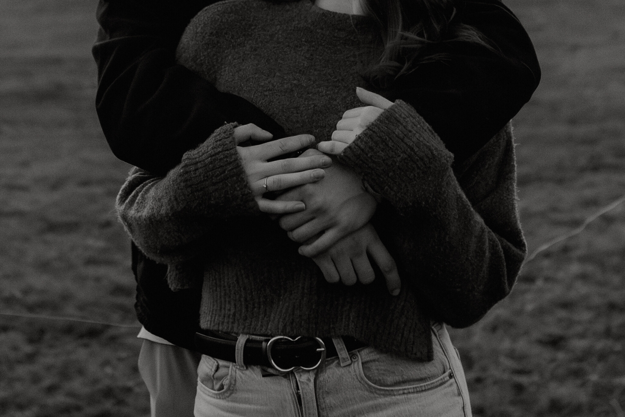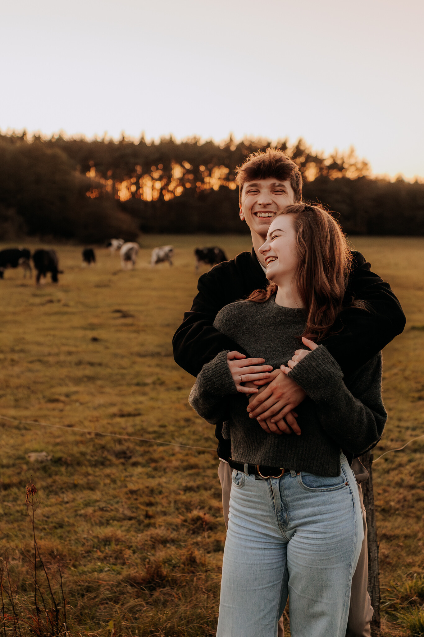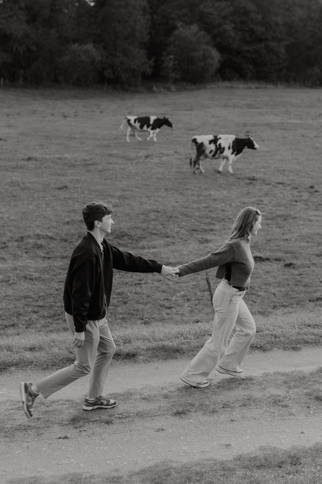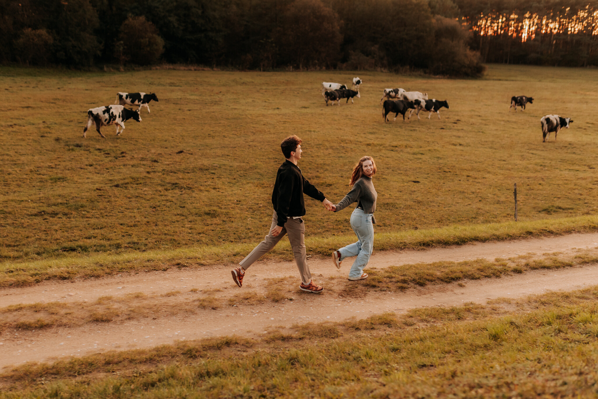 Gdy mały bohater zmęczył się światem, zrobiliśmy to, co w slow sesjach jest naturalne. Poszliśmy dalej. Zostawiliśmy szczeniaka na regenerację i ruszyliśmy w krajobraz, który otworzył się przed nami szeroko. Trafiliśmy na krowy, zupełnie nieprzejęte faktem, że ktoś właśnie tworzy narzeczeńskie kadry. Kilka zdjęć z nimi w tle ma w sobie ten rodzaj spokoju, którego nie da się zaplanować 🐄