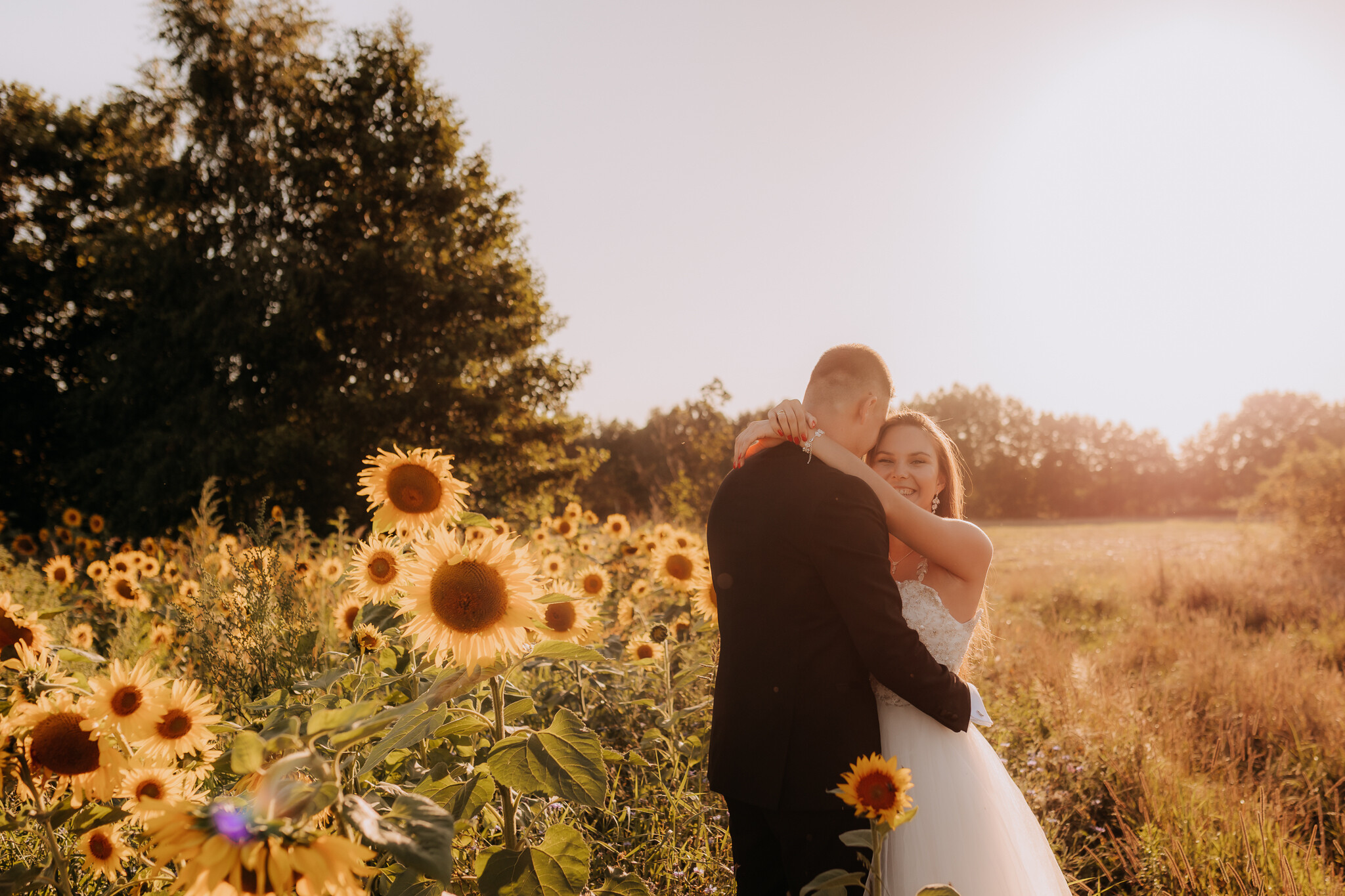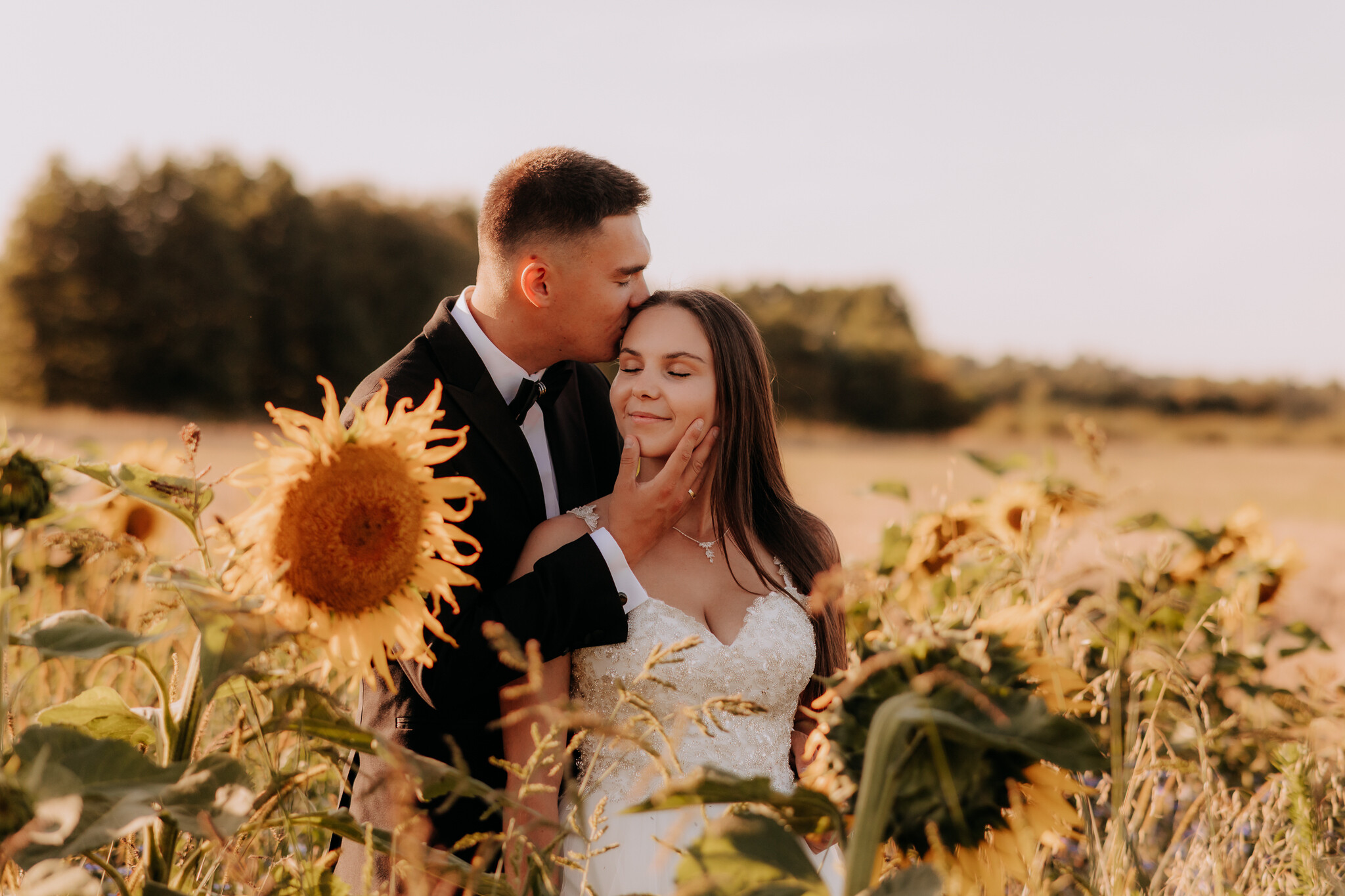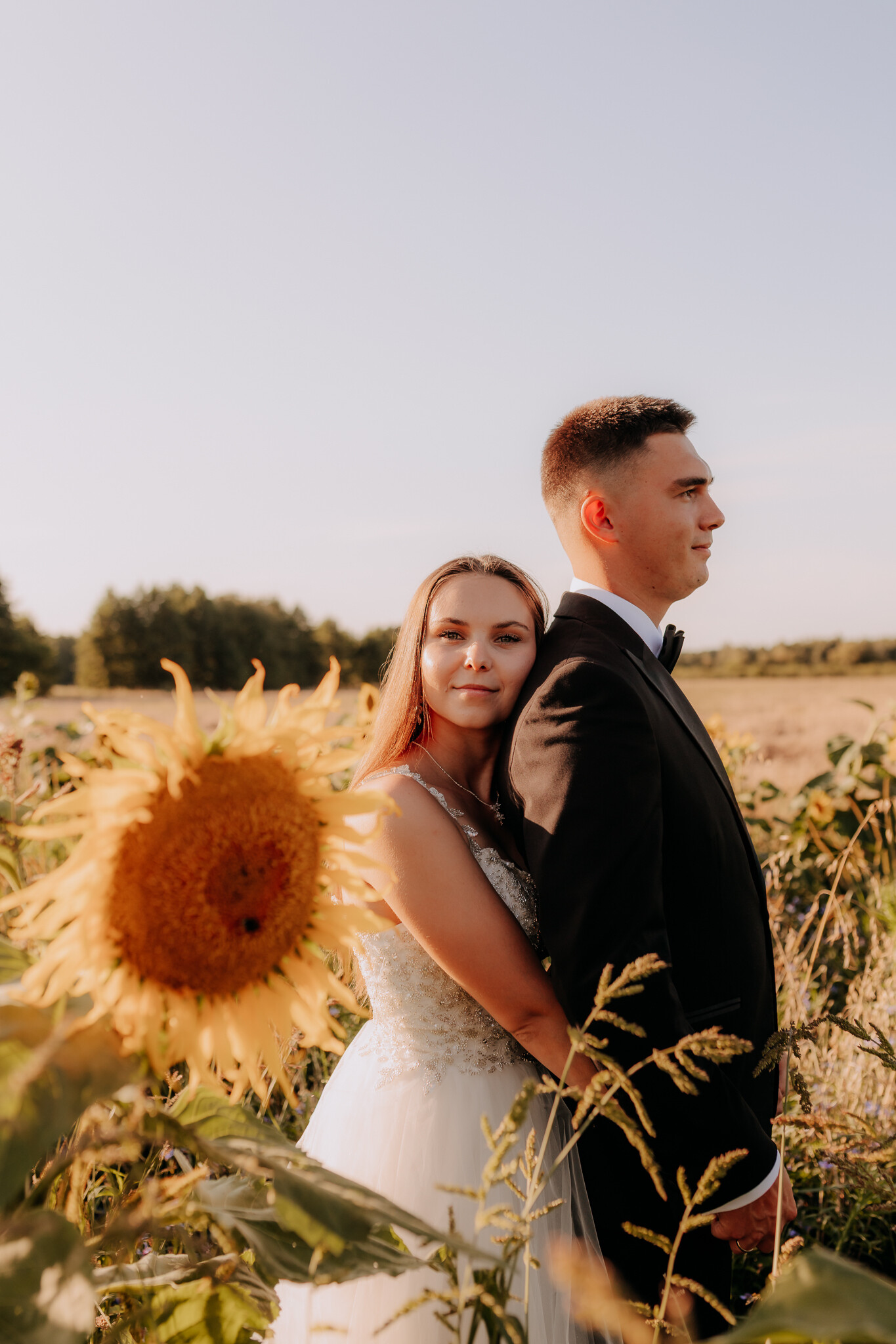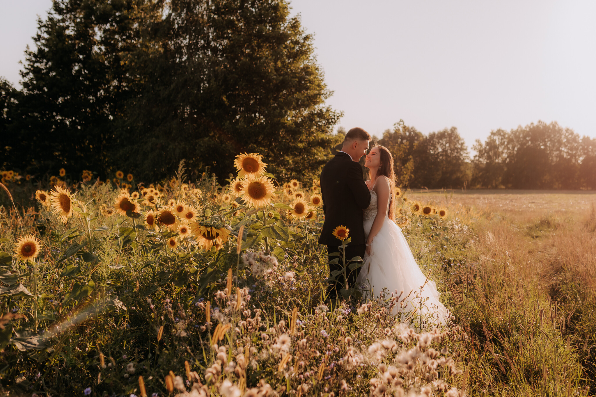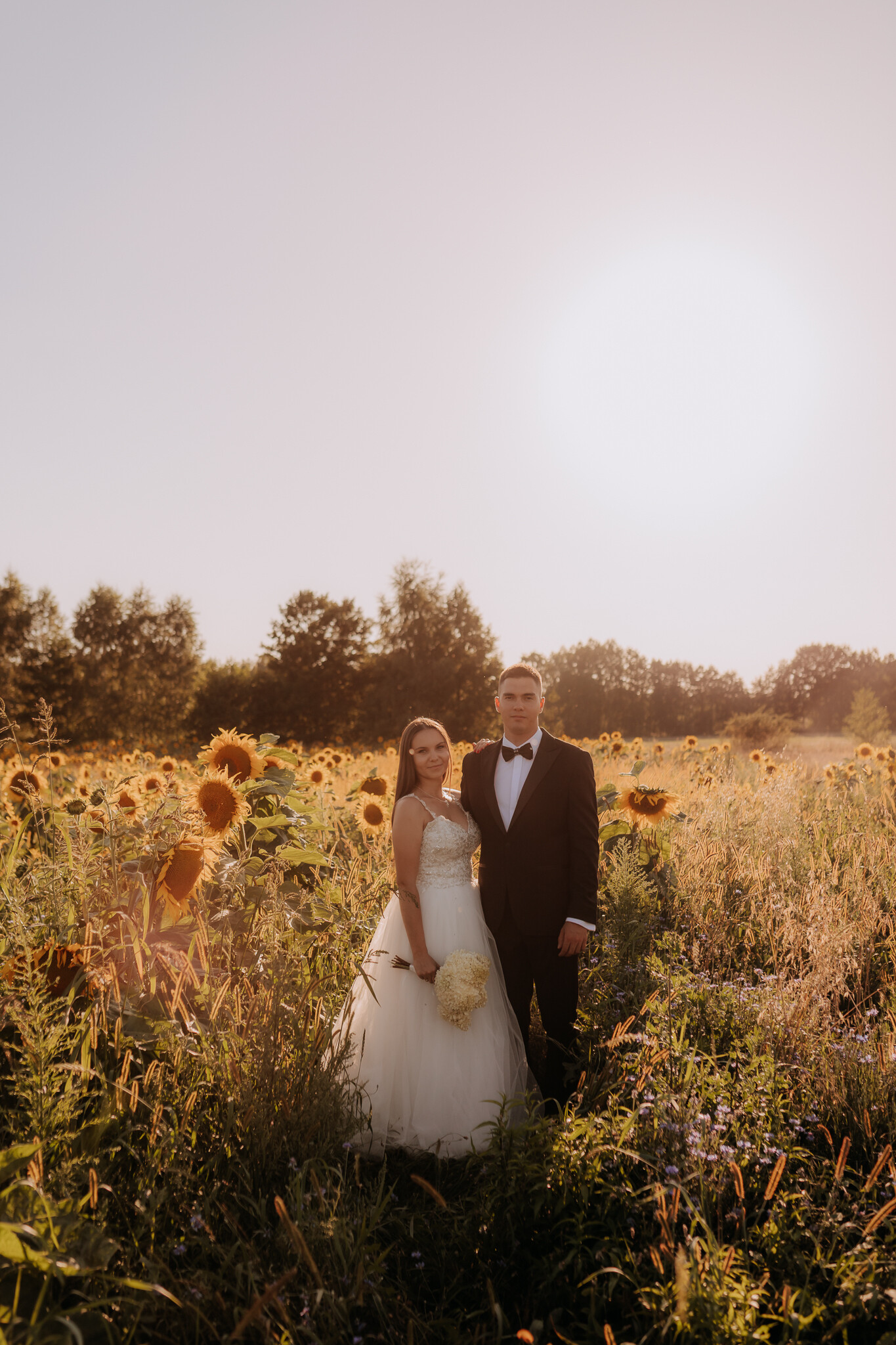 Zaczęliśmy przy słonecznikach posadzonych przez mojego tatę. Wysokie, zwrócone w stronę słońca, wyglądały jak naturalna scenografia stworzona dokładnie na ten wieczór. Kasia i Patryk weszli w ten kadr bardzo naturalnie, bez pozowania, bez napięcia. Światło było idealne. Taki zachód słońca, który nie krzyczy, tylko powoli otula wszystko dookoła 🌻