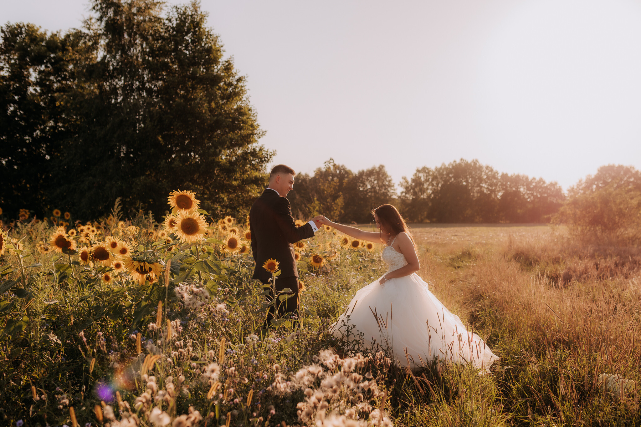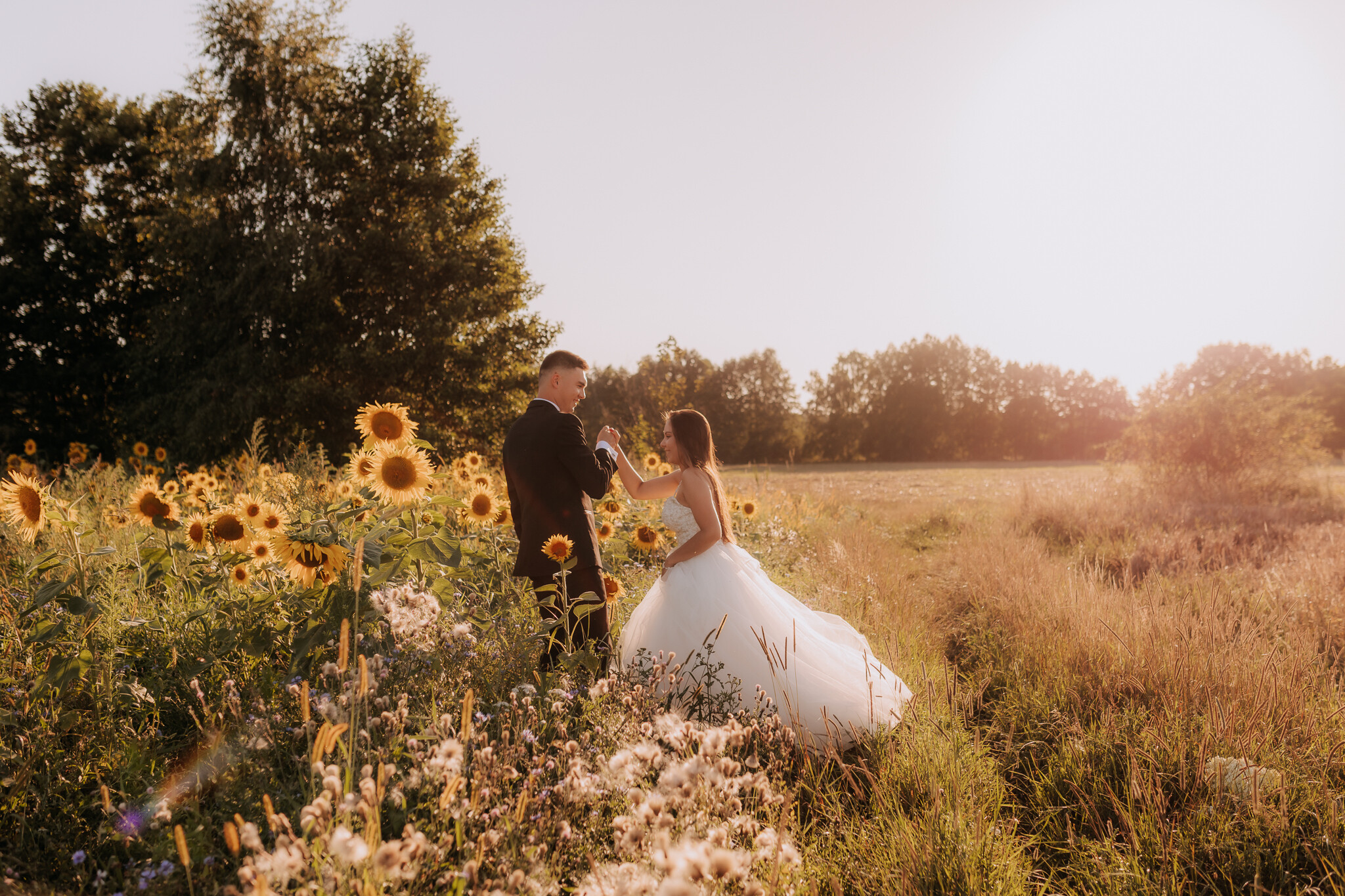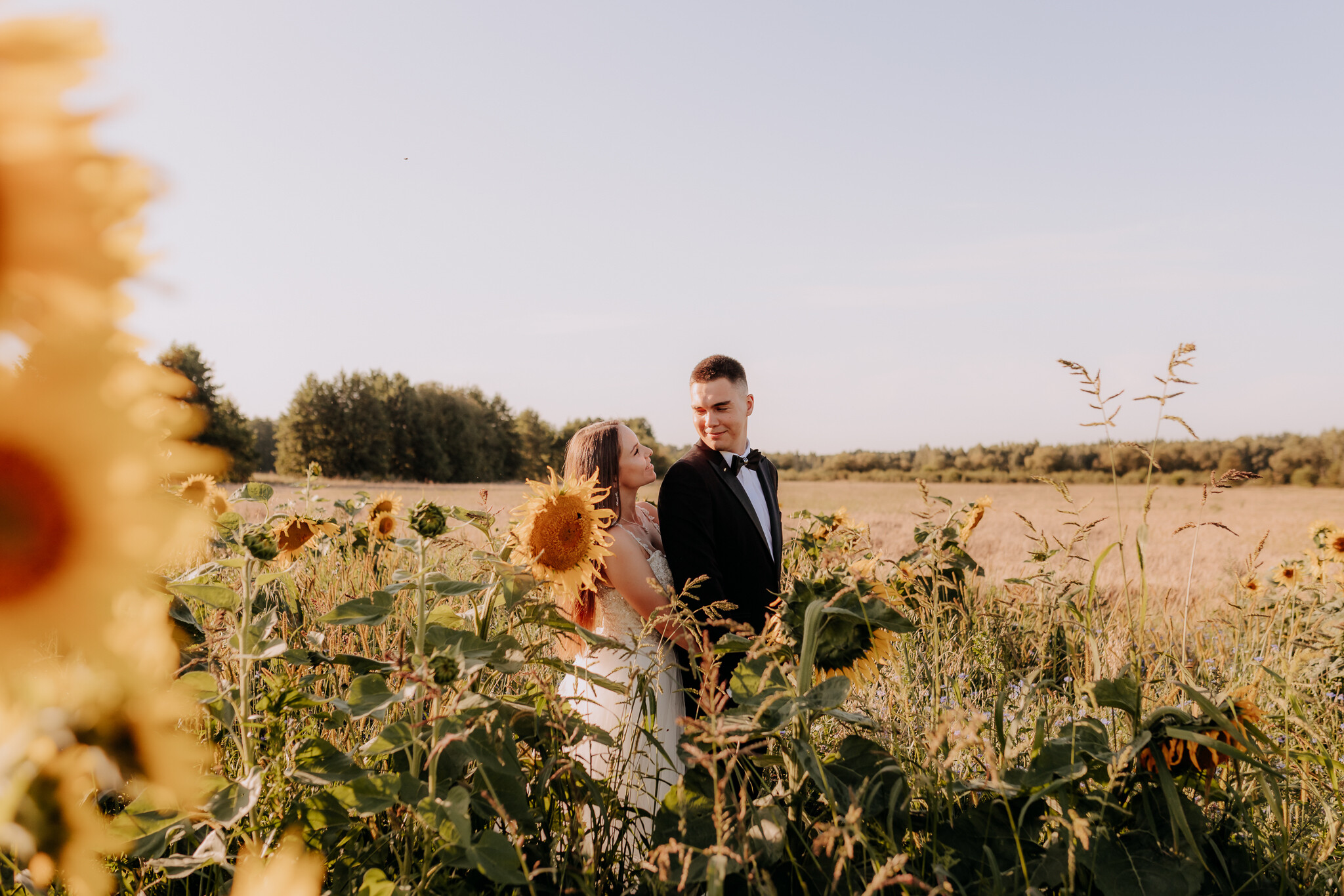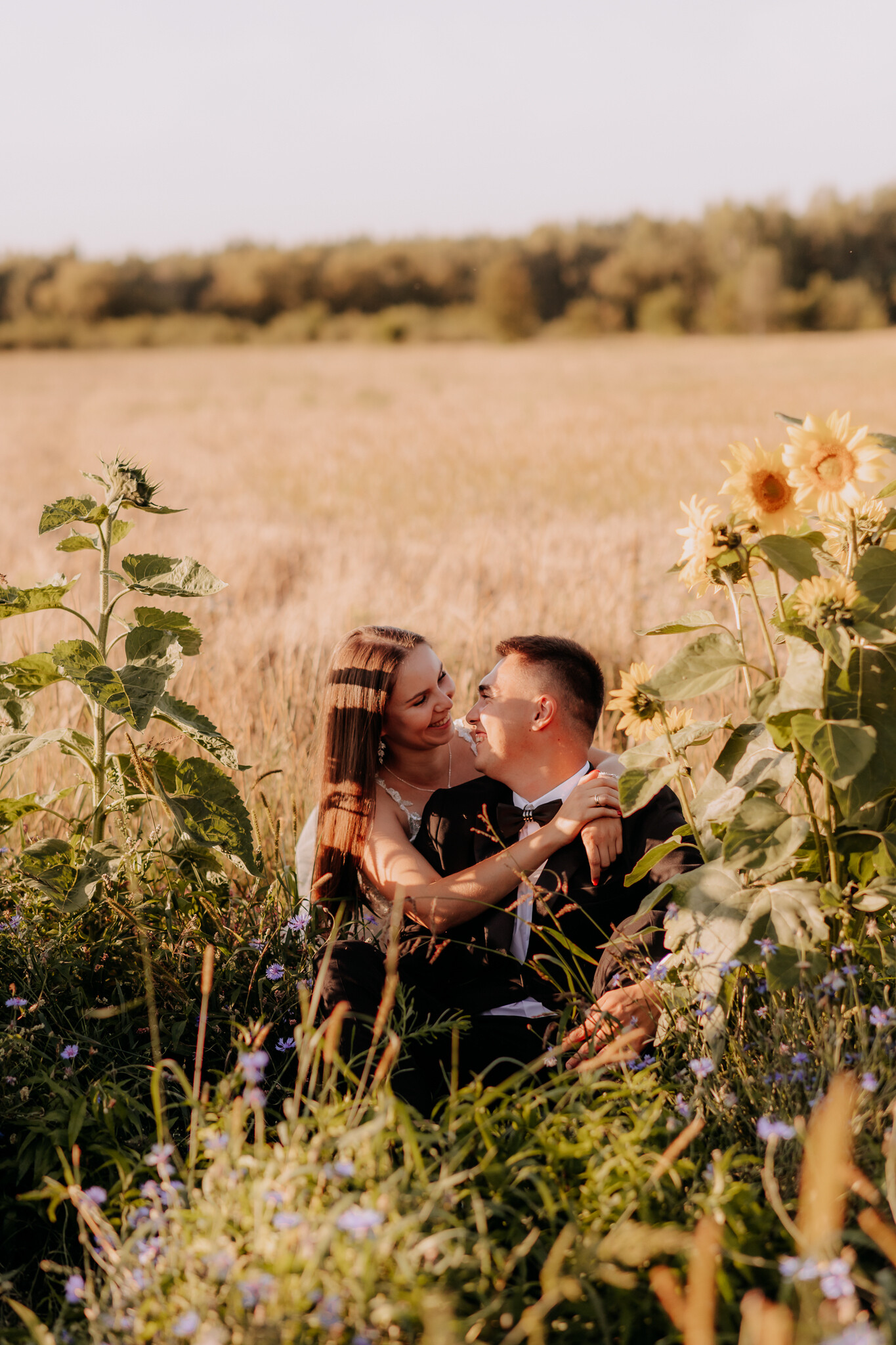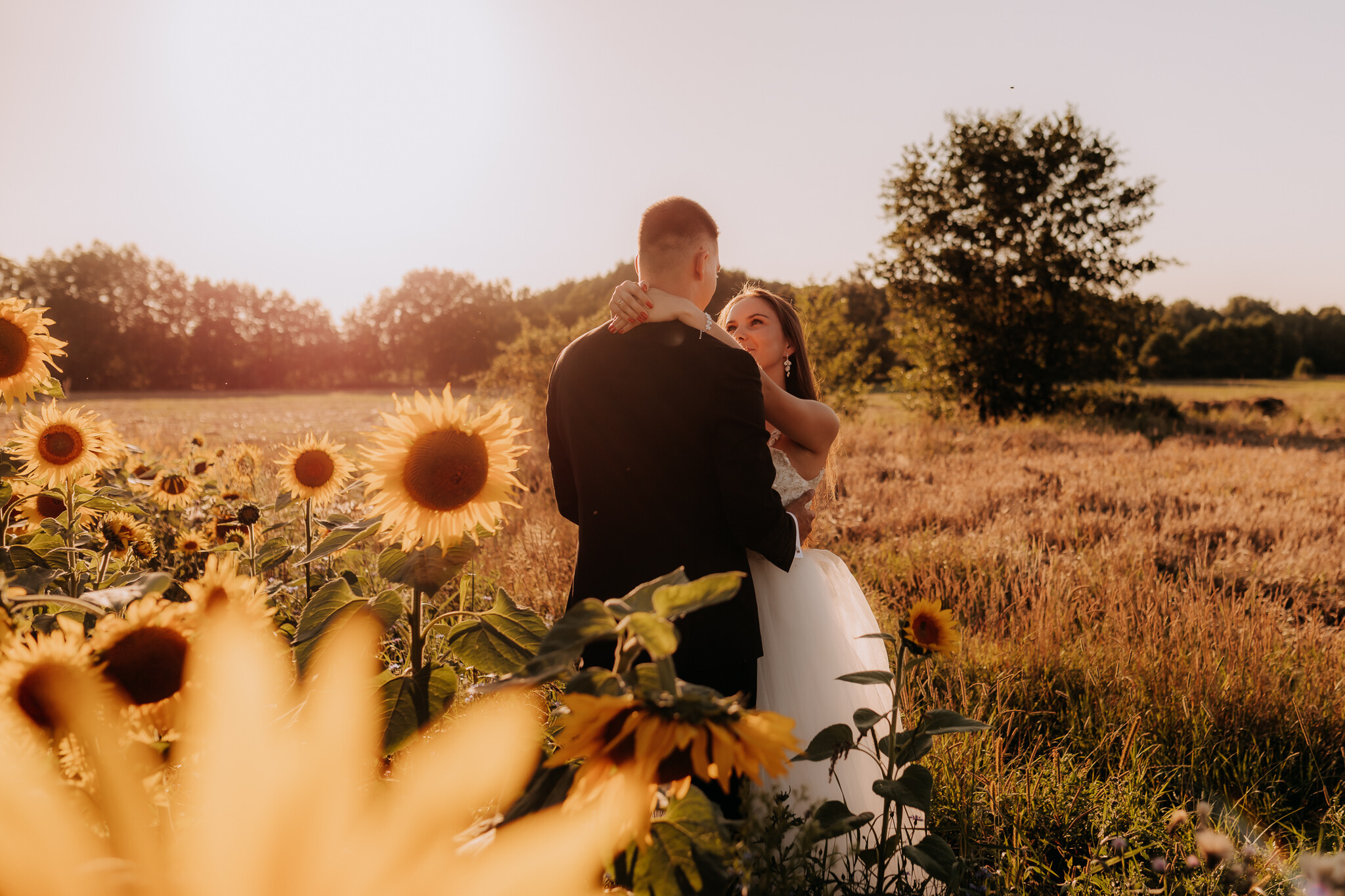 Zaczęliśmy przy słonecznikach posadzonych przez mojego tatę. Wysokie, zwrócone w stronę słońca, wyglądały jak naturalna scenografia stworzona dokładnie na ten wieczór. Kasia i Patryk weszli w ten kadr bardzo naturalnie, bez pozowania, bez napięcia. Światło było idealne. Taki zachód słońca, który nie krzyczy, tylko powoli otula wszystko dookoła 🌻
