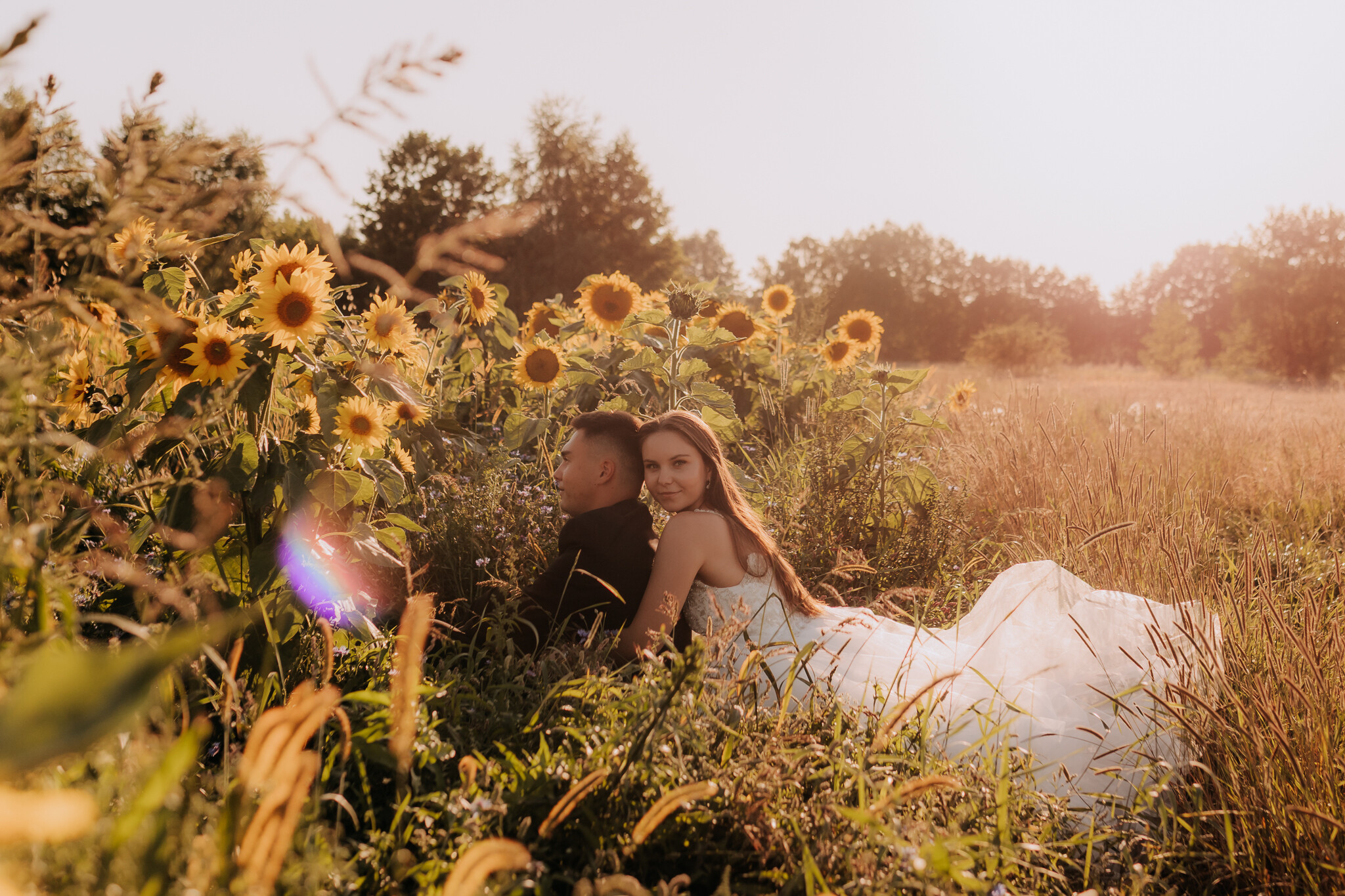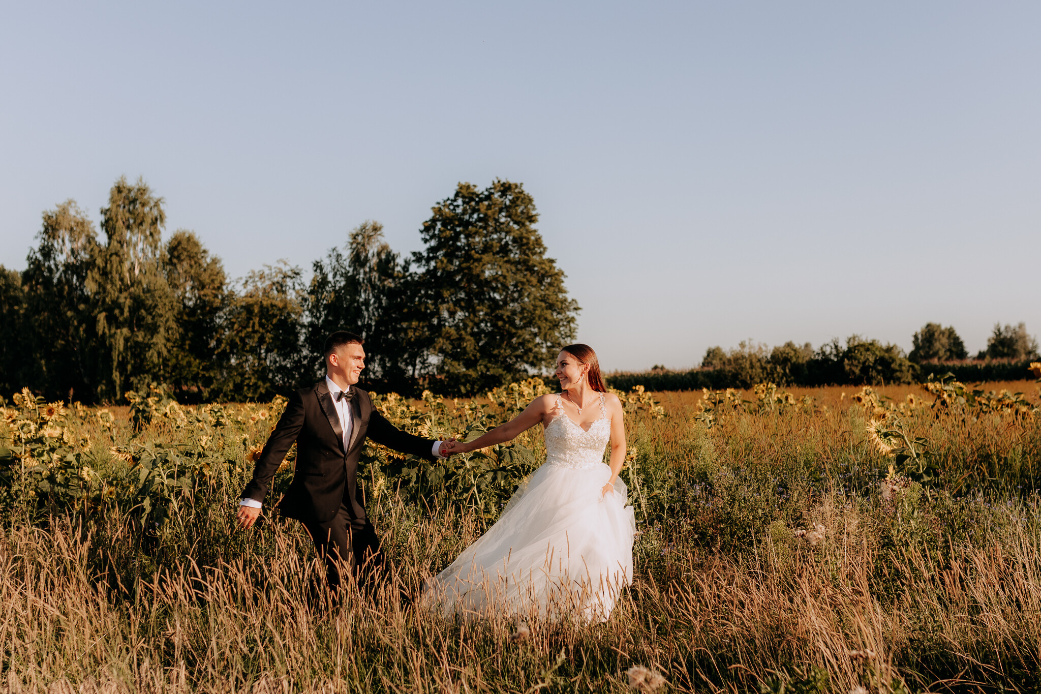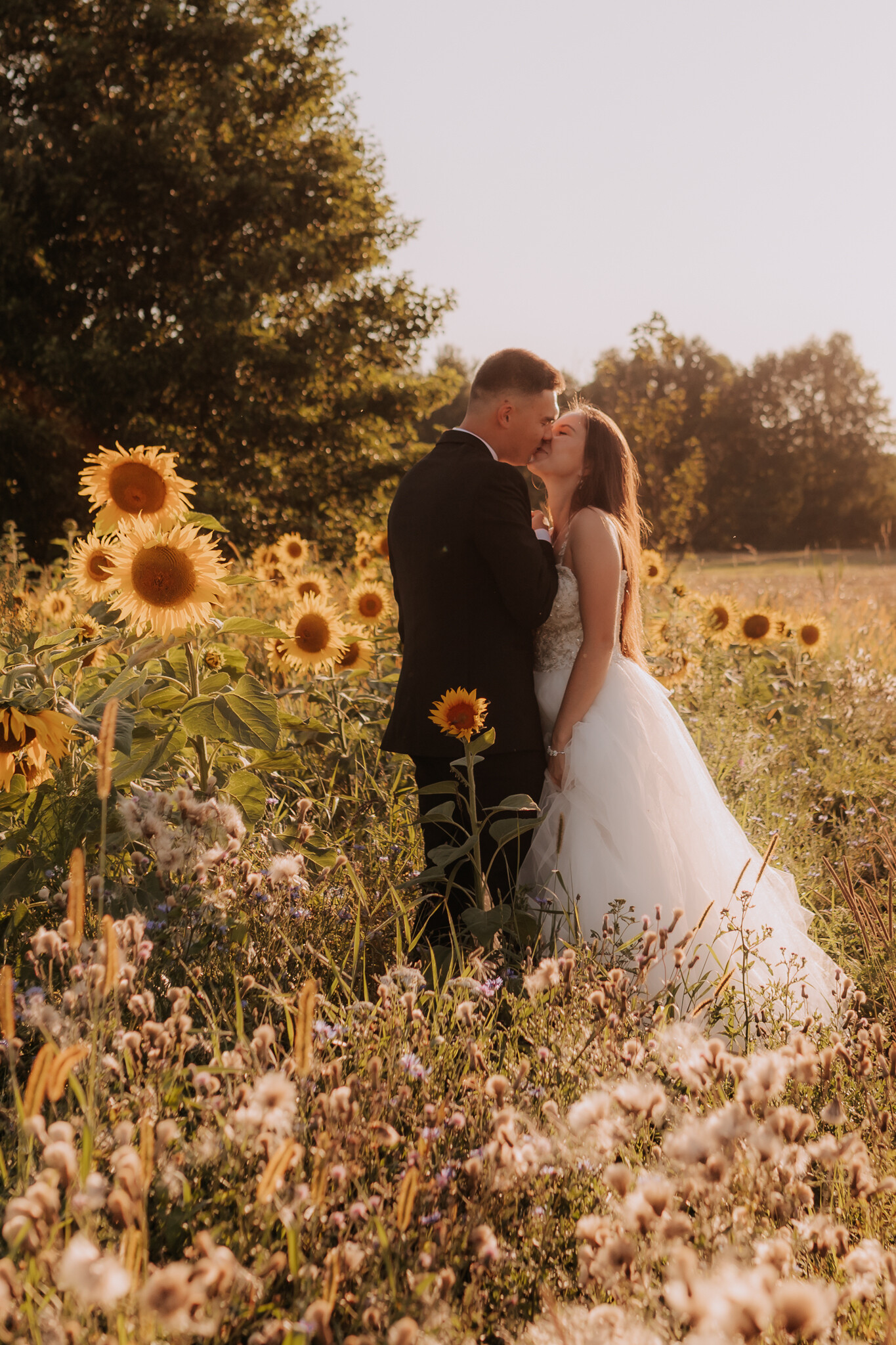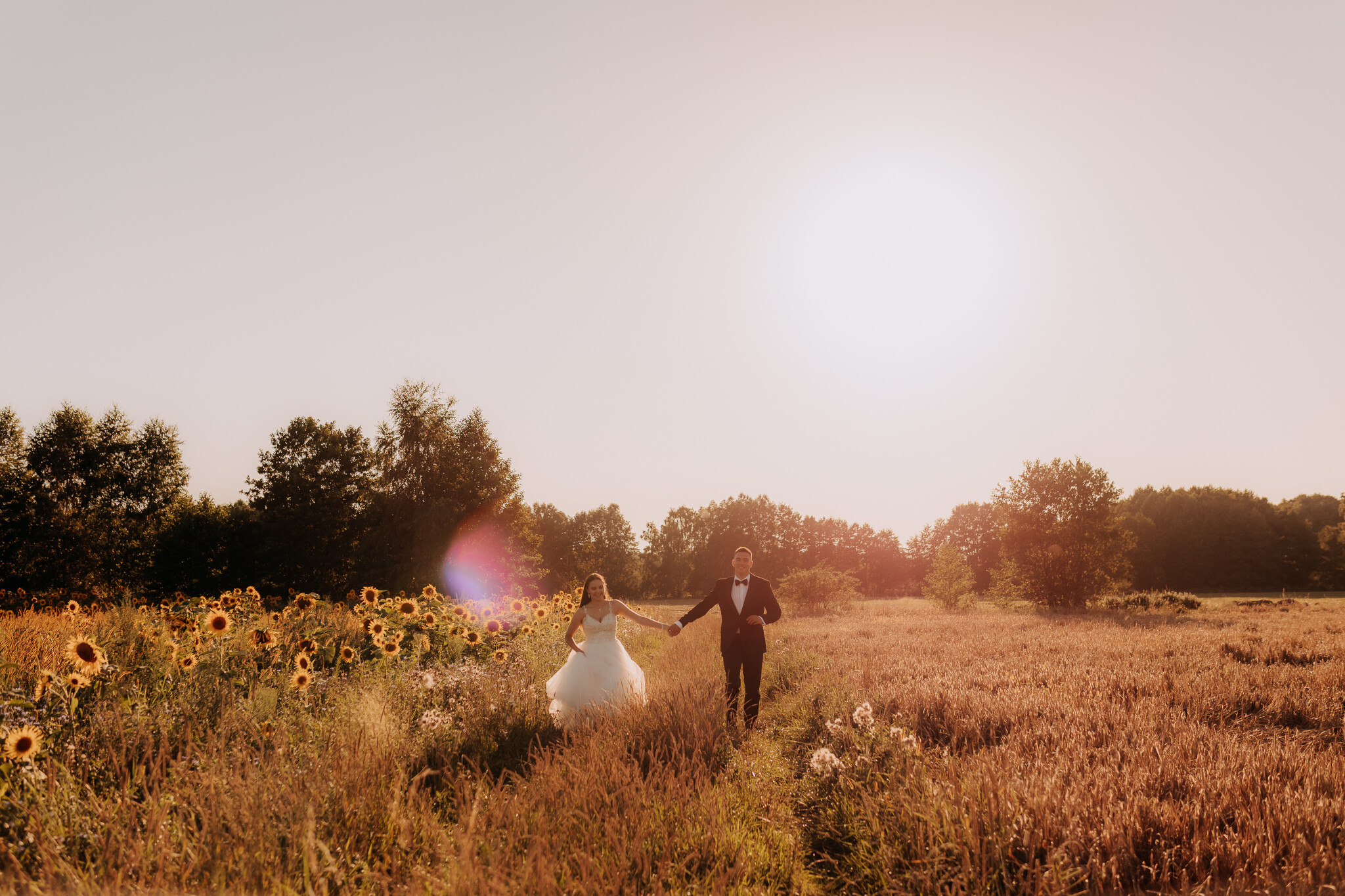 Zaczęliśmy przy słonecznikach posadzonych przez mojego tatę. Wysokie, zwrócone w stronę słońca, wyglądały jak naturalna scenografia stworzona dokładnie na ten wieczór. Kasia i Patryk weszli w ten kadr bardzo naturalnie, bez pozowania, bez napięcia. Światło było idealne. Taki zachód słońca, który nie krzyczy, tylko powoli otula wszystko dookoła 🌻