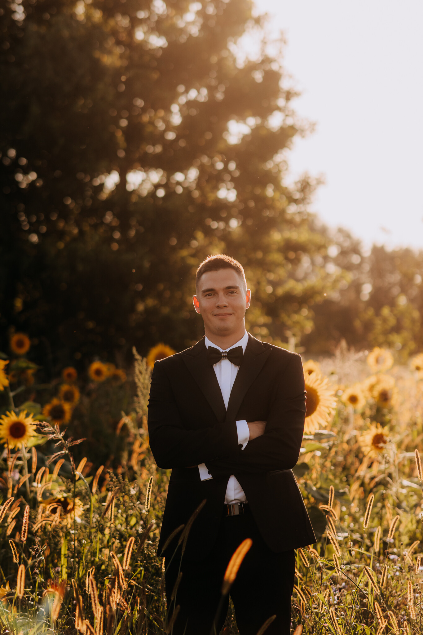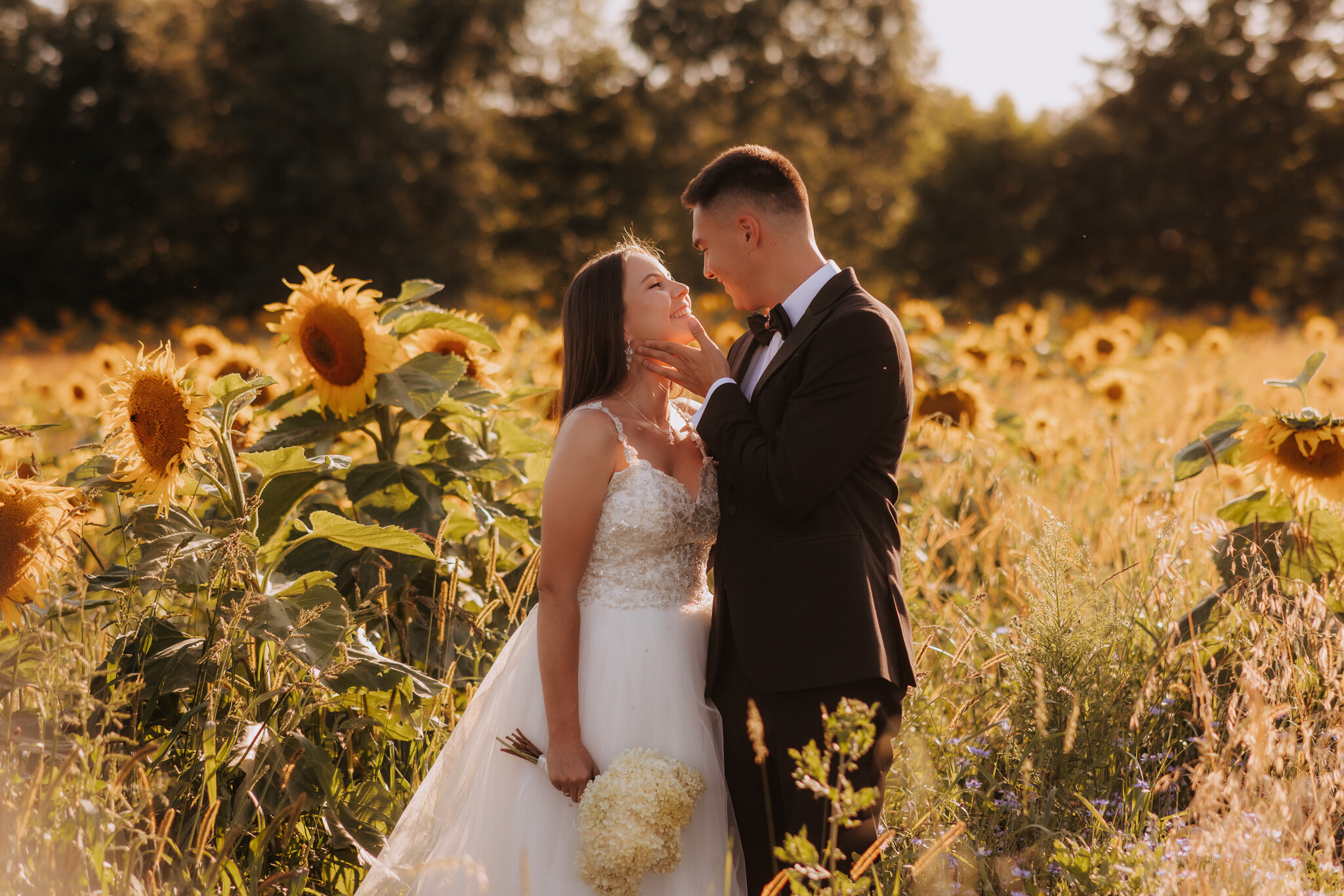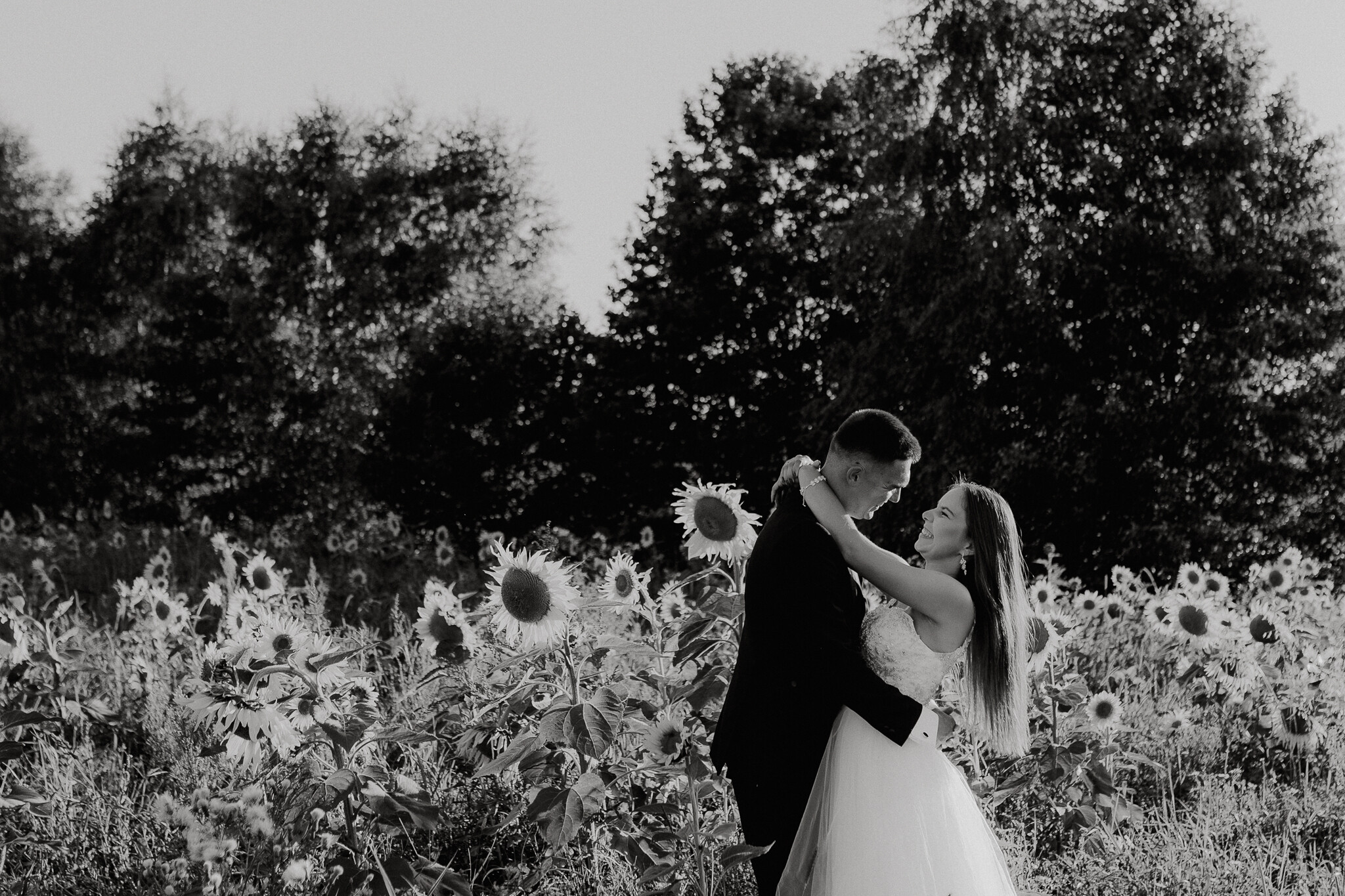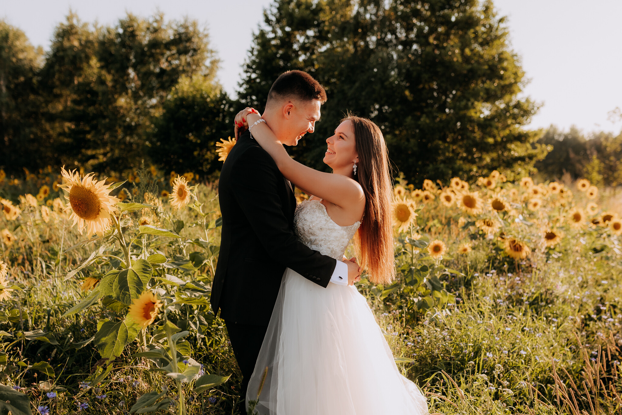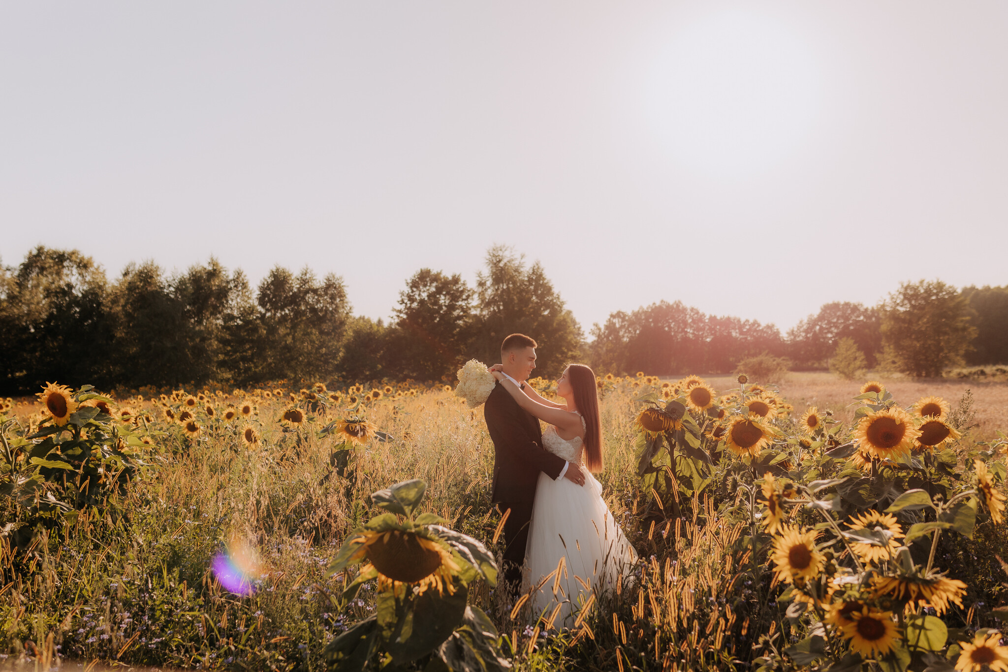 Zaczęliśmy przy słonecznikach posadzonych przez mojego tatę. Wysokie, zwrócone w stronę słońca, wyglądały jak naturalna scenografia stworzona dokładnie na ten wieczór. Kasia i Patryk weszli w ten kadr bardzo naturalnie, bez pozowania, bez napięcia. Światło było idealne. Taki zachód słońca, który nie krzyczy, tylko powoli otula wszystko dookoła 🌻