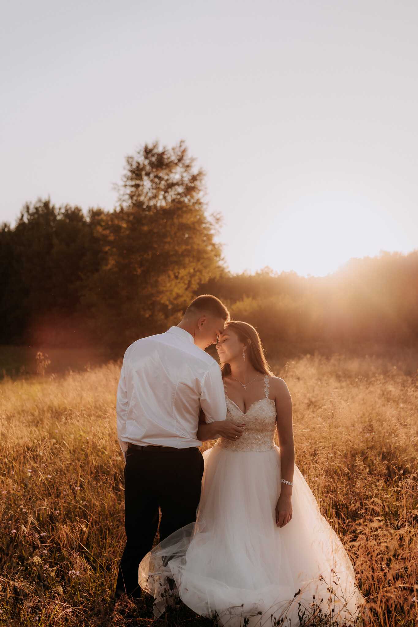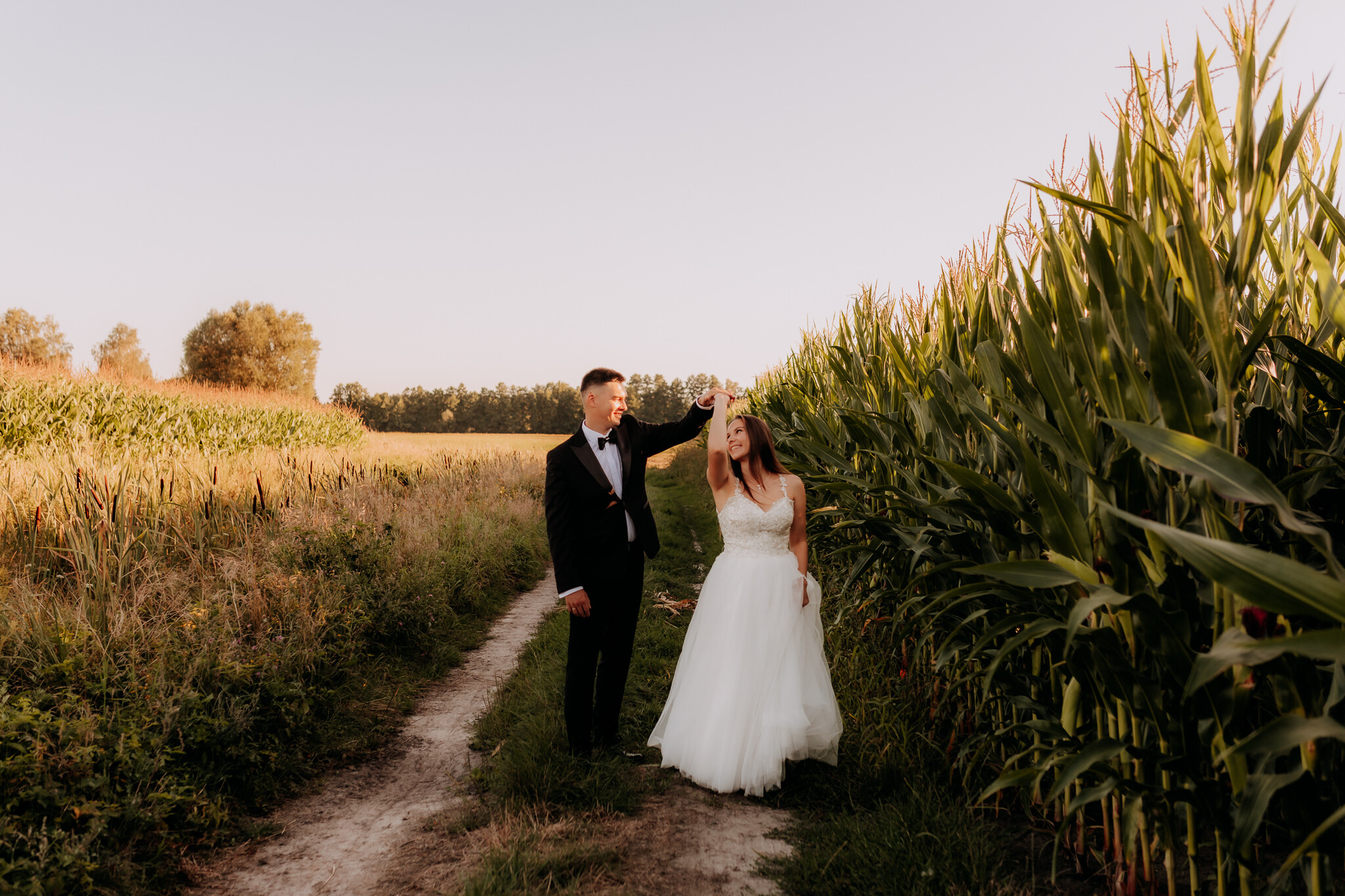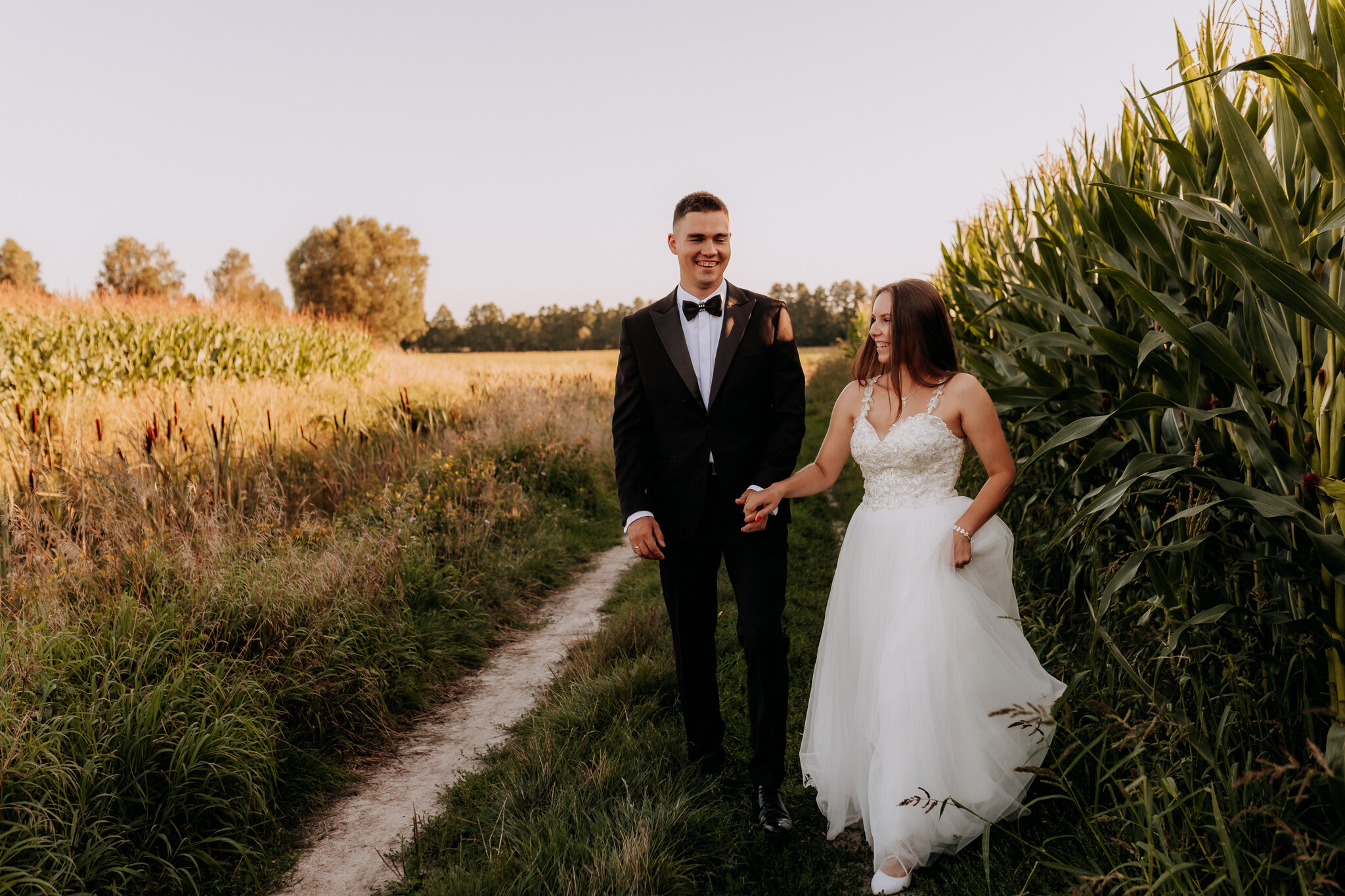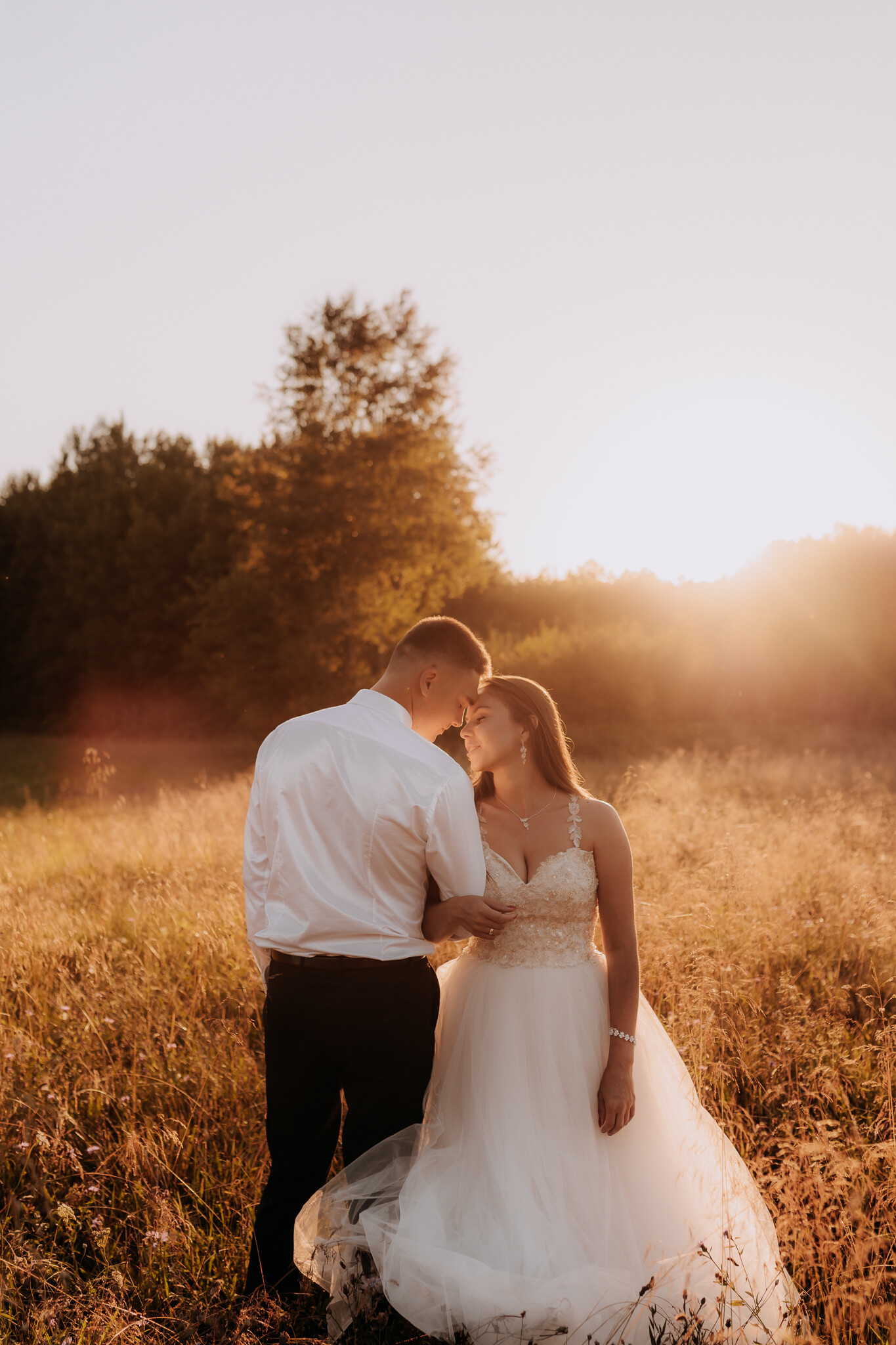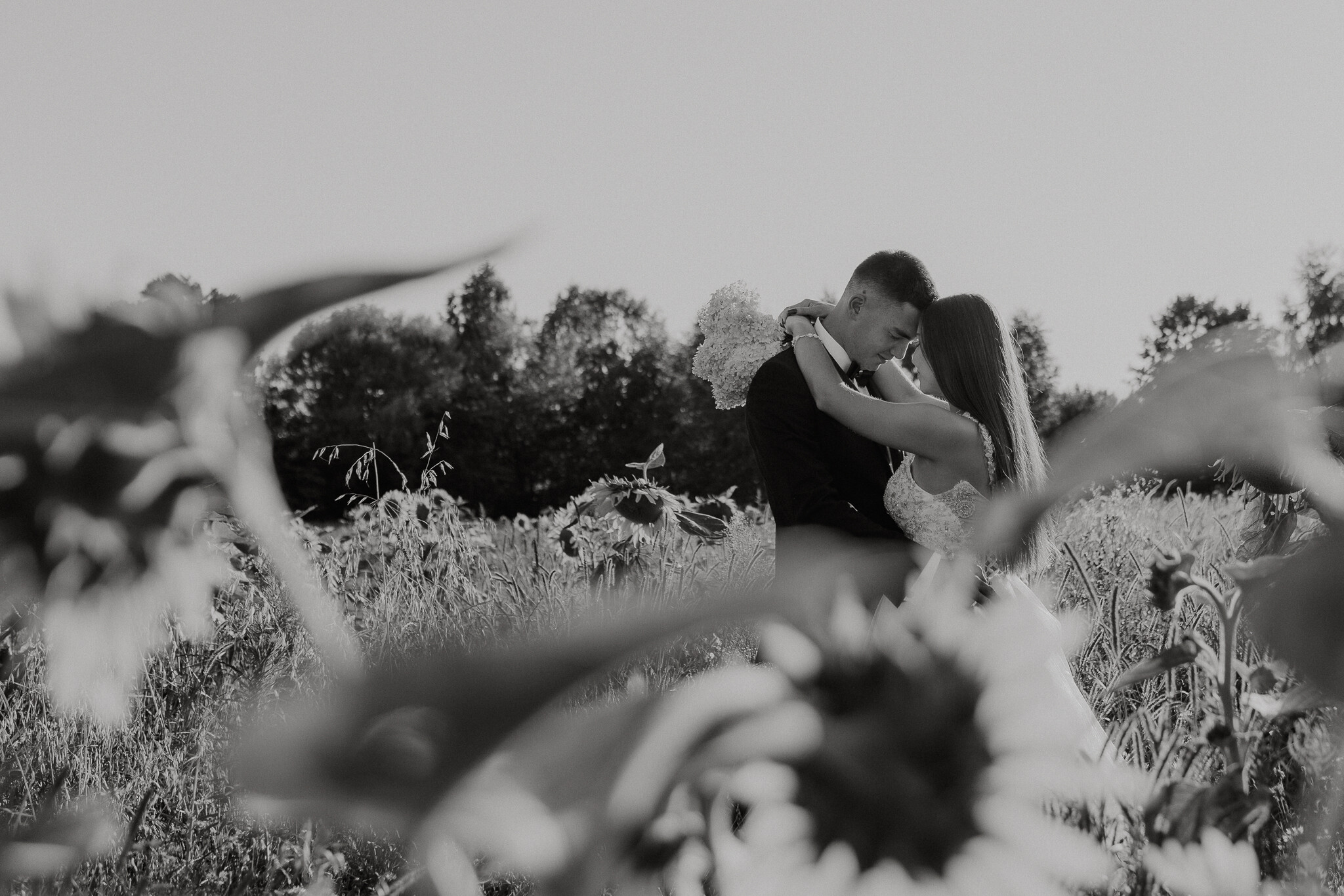 Zaczęliśmy przy słonecznikach posadzonych przez mojego tatę. Wysokie, zwrócone w stronę słońca, wyglądały jak naturalna scenografia stworzona dokładnie na ten wieczór. Kasia i Patryk weszli w ten kadr bardzo naturalnie, bez pozowania, bez napięcia. Światło było idealne. Taki zachód słońca, który nie krzyczy, tylko powoli otula wszystko dookoła 🌻
