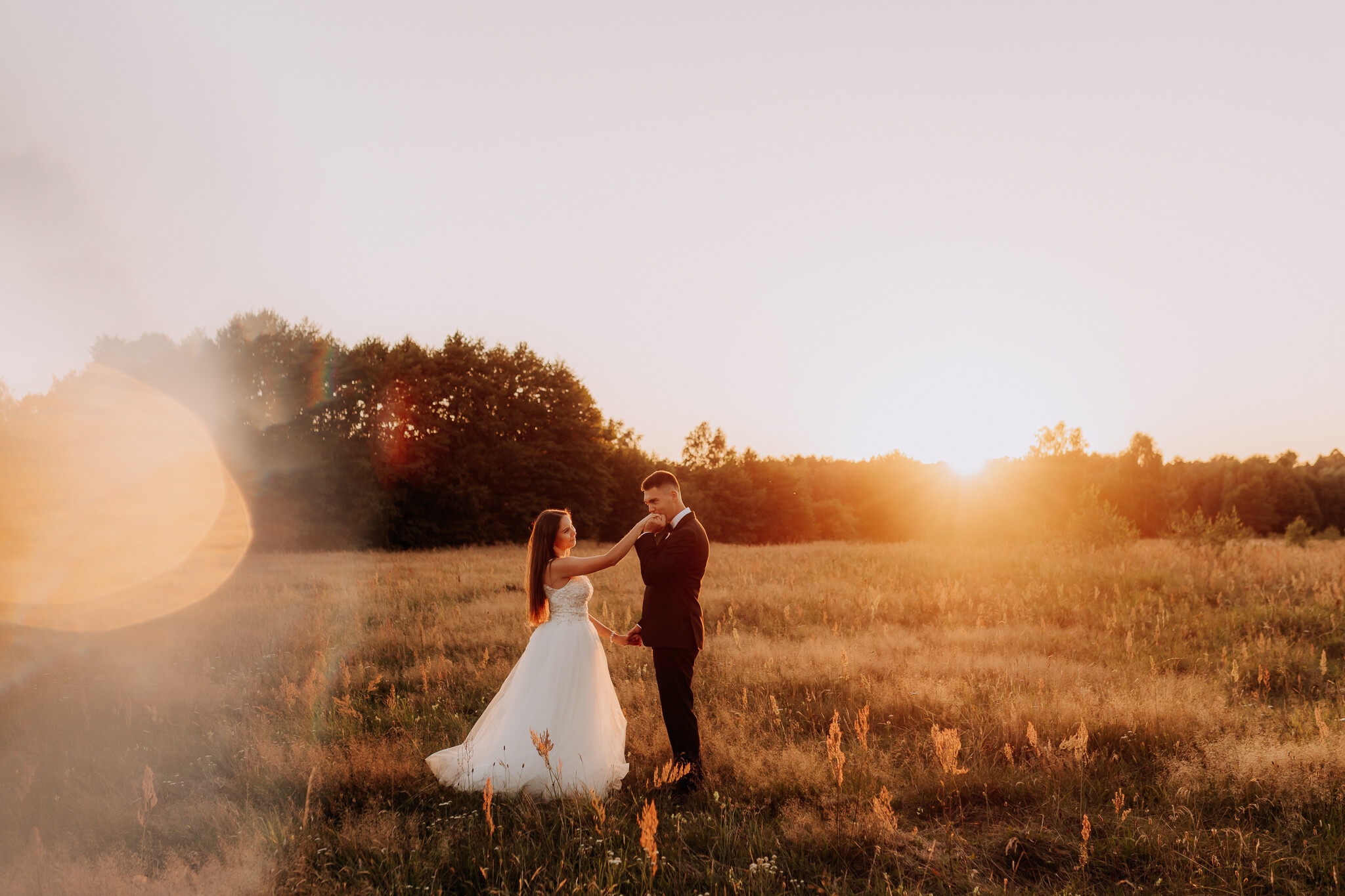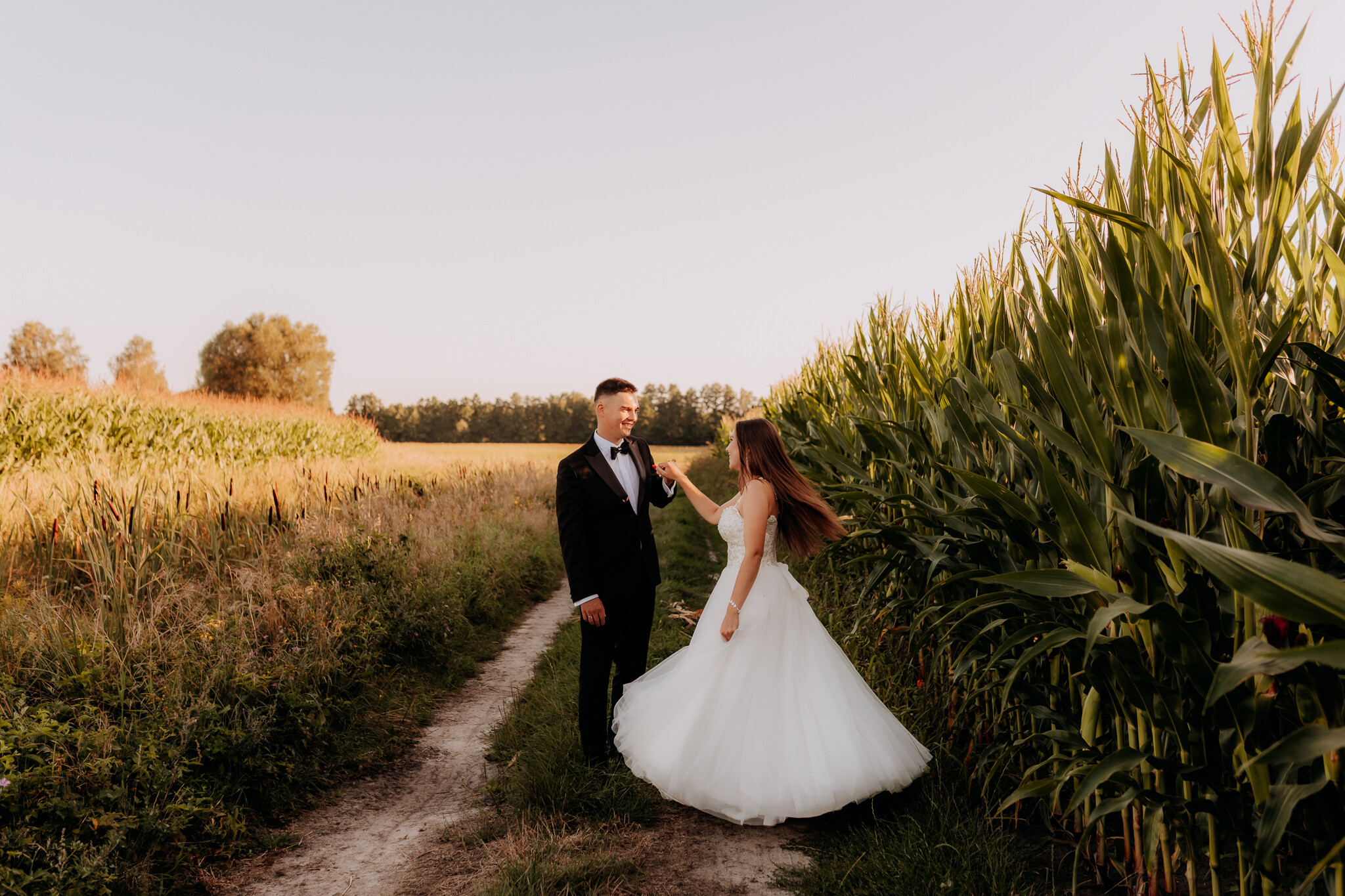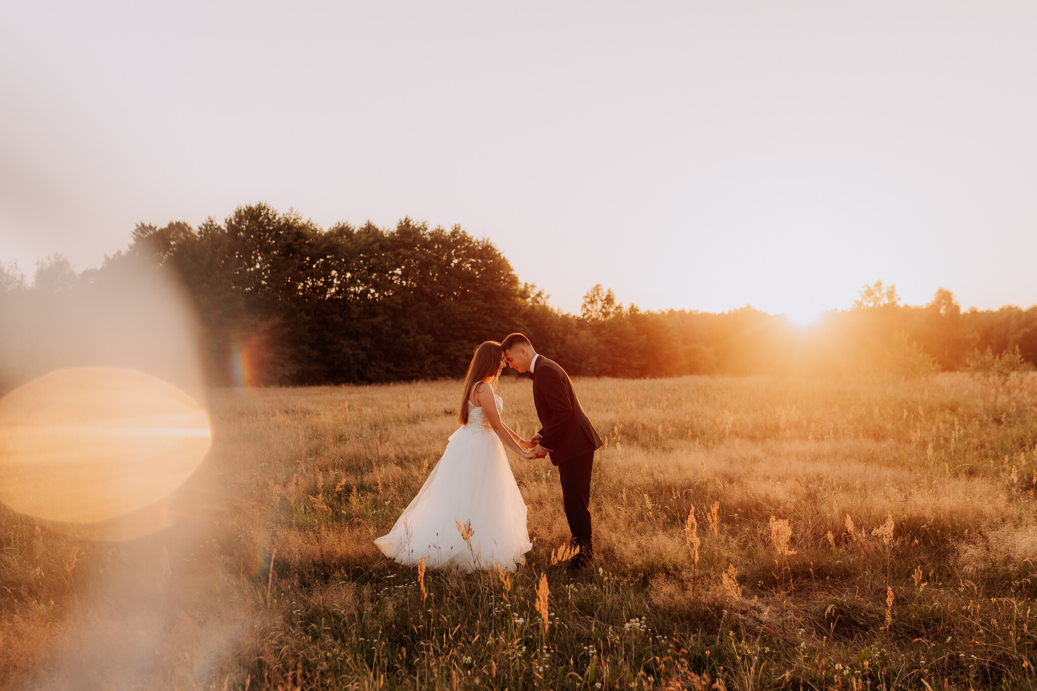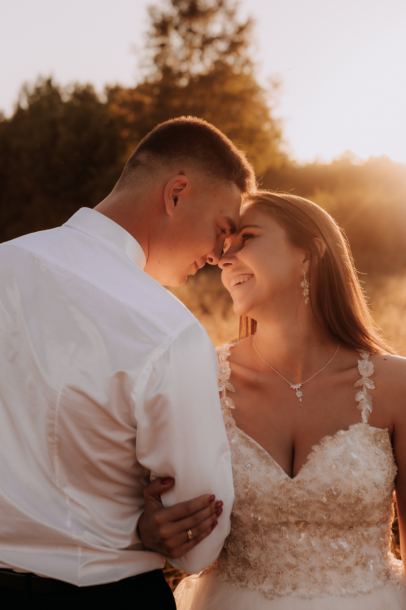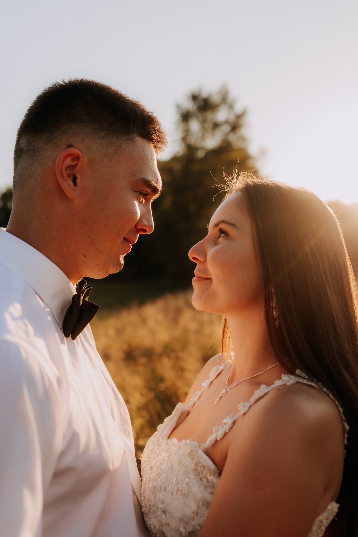 Zaczęliśmy przy słonecznikach posadzonych przez mojego tatę. Wysokie, zwrócone w stronę słońca, wyglądały jak naturalna scenografia stworzona dokładnie na ten wieczór. Kasia i Patryk weszli w ten kadr bardzo naturalnie, bez pozowania, bez napięcia. Światło było idealne. Taki zachód słońca, który nie krzyczy, tylko powoli otula wszystko dookoła 🌻