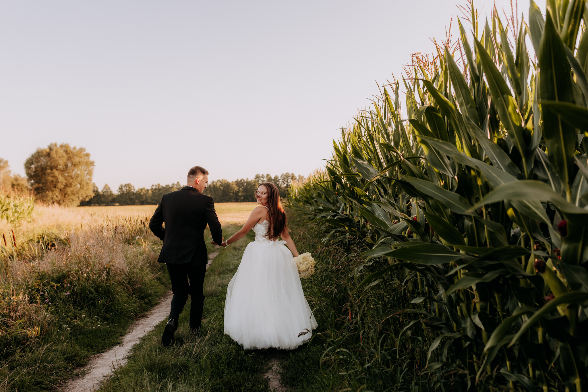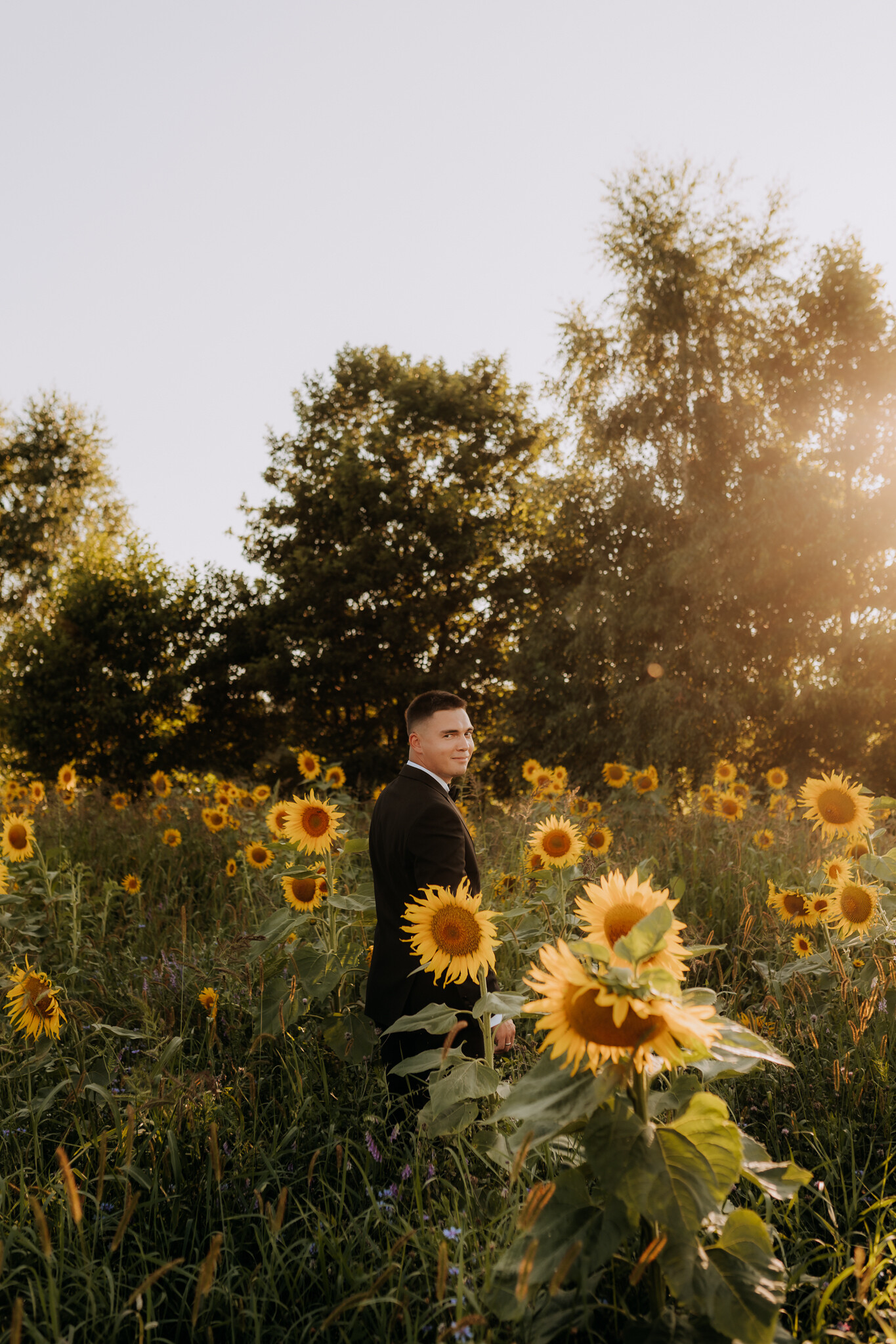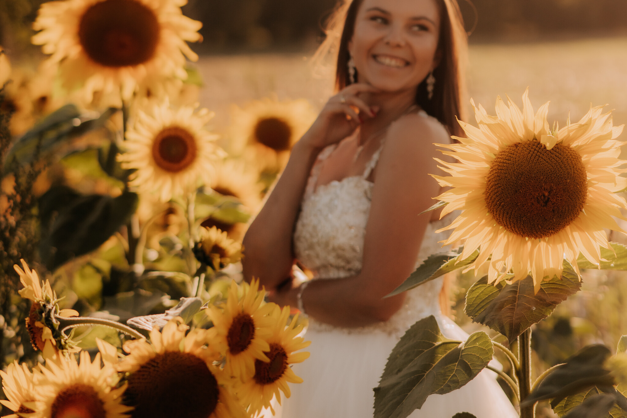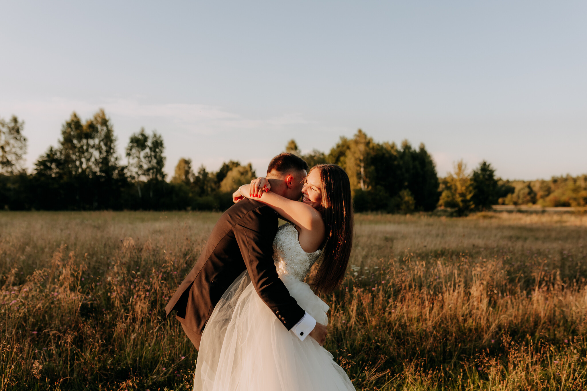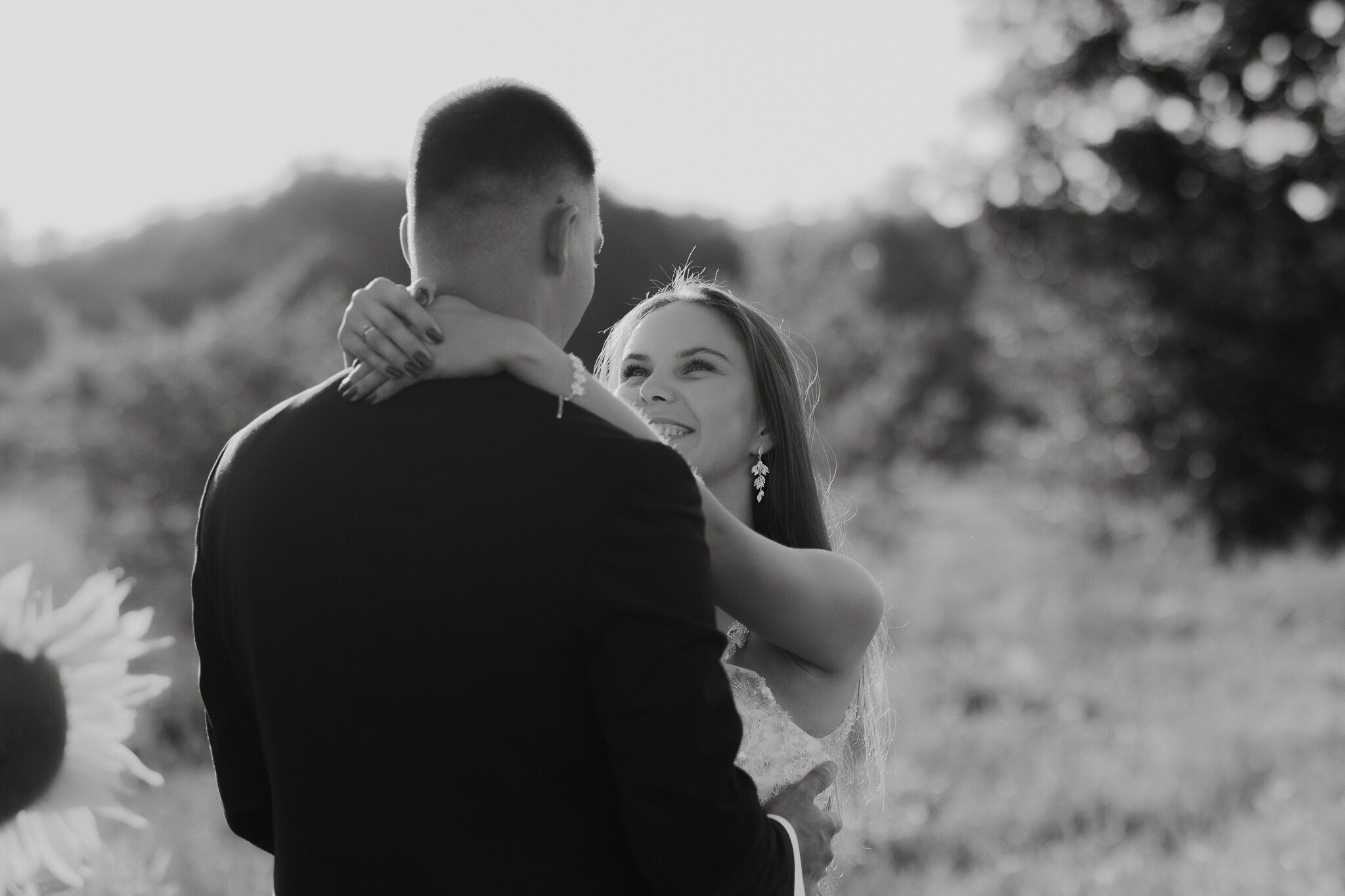 Zaczęliśmy przy słonecznikach posadzonych przez mojego tatę. Wysokie, zwrócone w stronę słońca, wyglądały jak naturalna scenografia stworzona dokładnie na ten wieczór. Kasia i Patryk weszli w ten kadr bardzo naturalnie, bez pozowania, bez napięcia. Światło było idealne. Taki zachód słońca, który nie krzyczy, tylko powoli otula wszystko dookoła 🌻