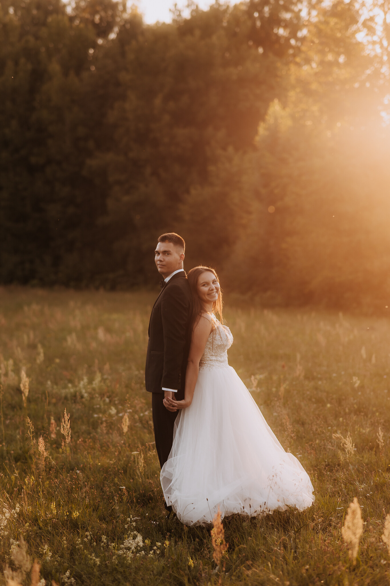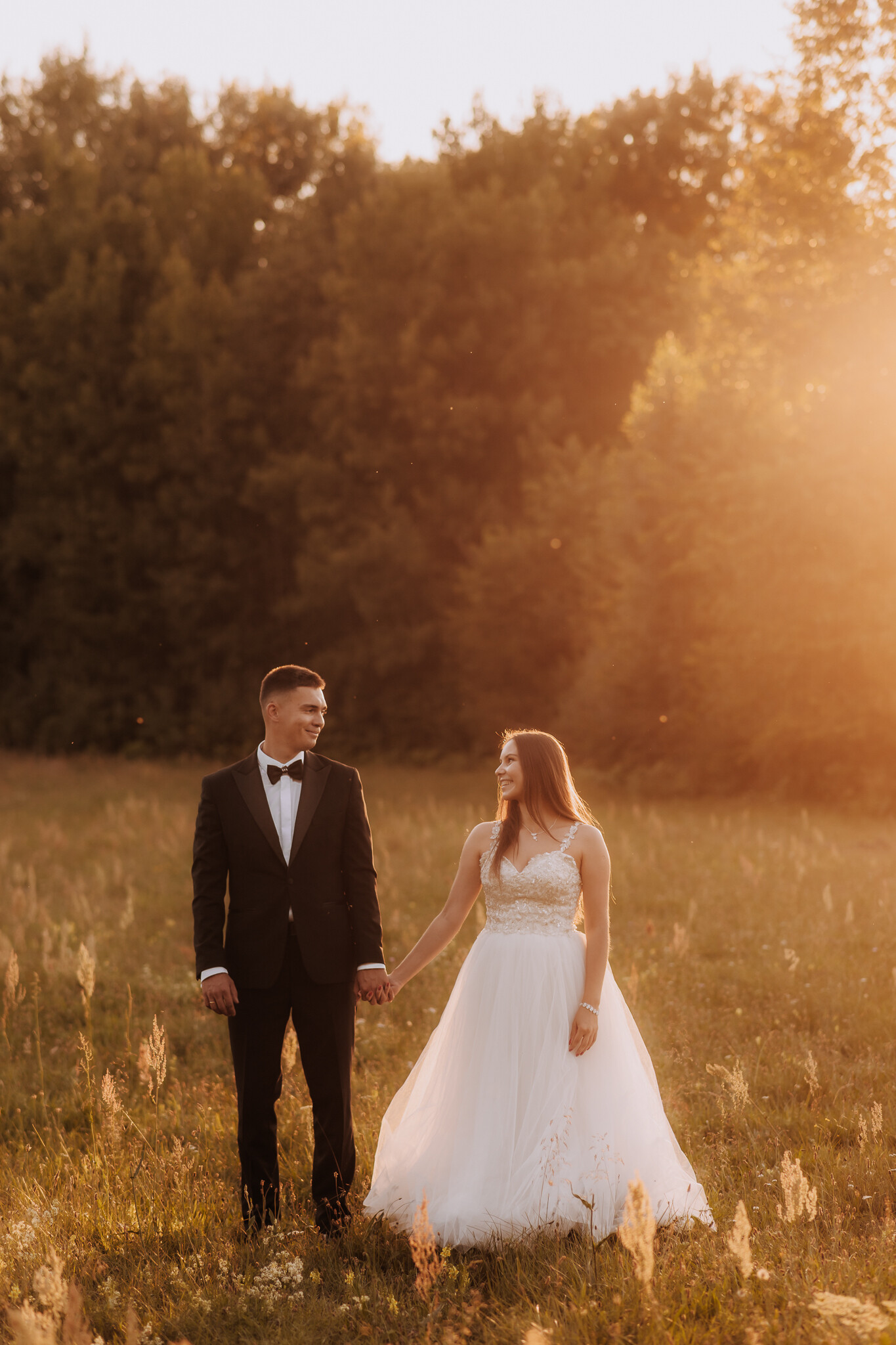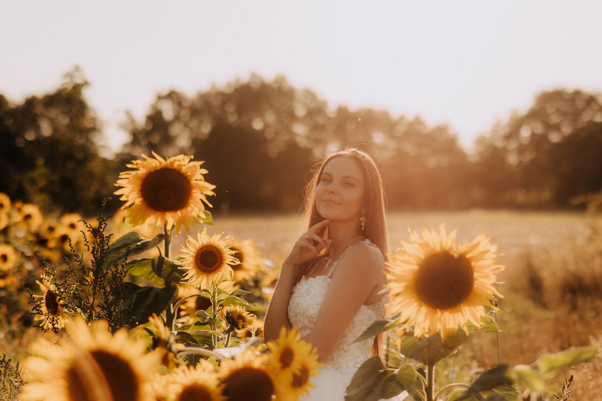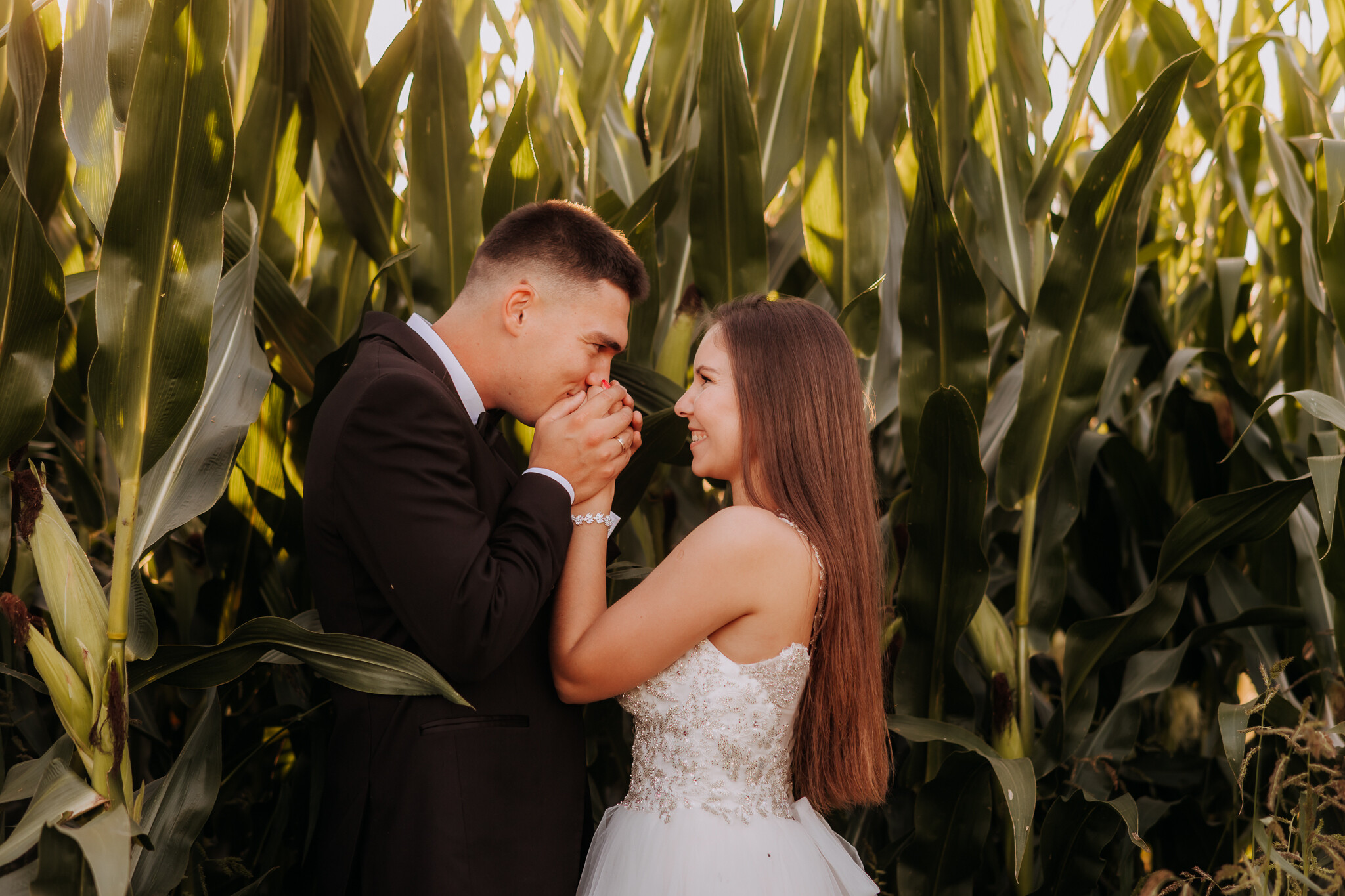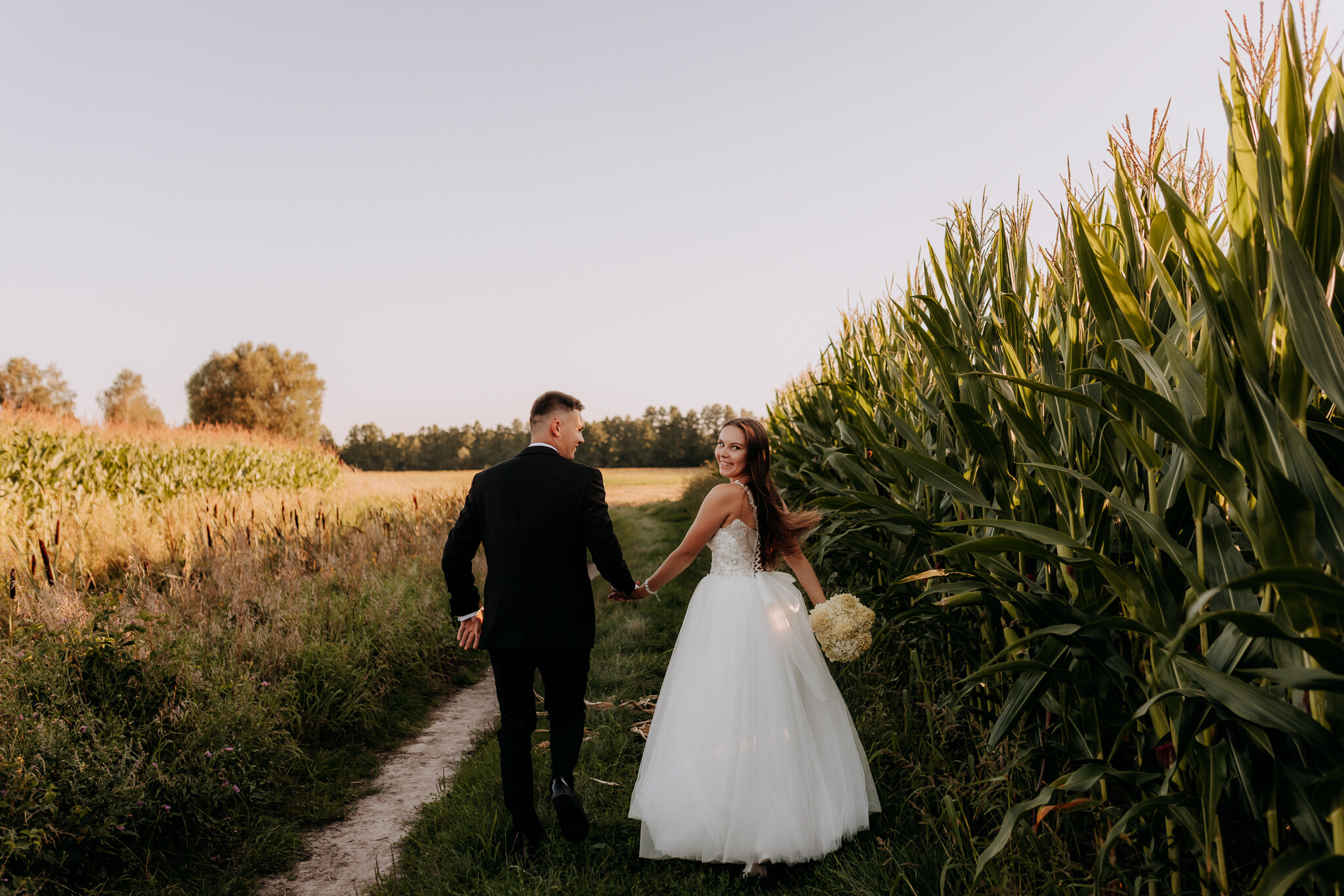 Zaczęliśmy przy słonecznikach posadzonych przez mojego tatę. Wysokie, zwrócone w stronę słońca, wyglądały jak naturalna scenografia stworzona dokładnie na ten wieczór. Kasia i Patryk weszli w ten kadr bardzo naturalnie, bez pozowania, bez napięcia. Światło było idealne. Taki zachód słońca, który nie krzyczy, tylko powoli otula wszystko dookoła 🌻