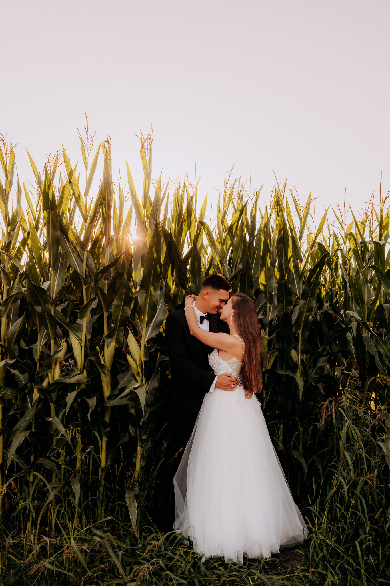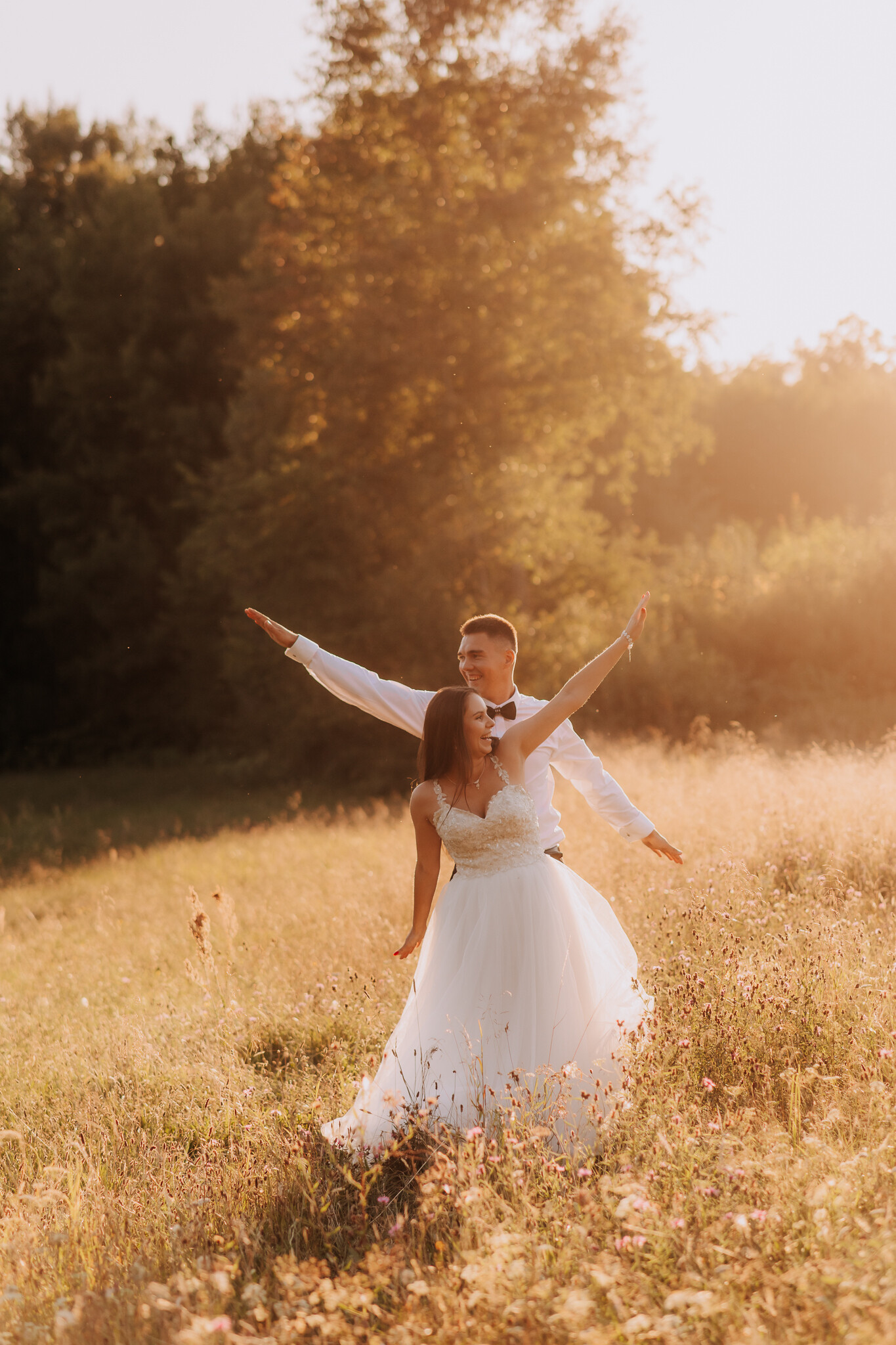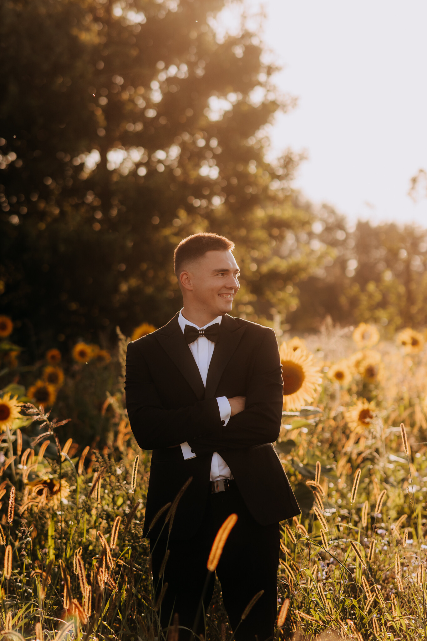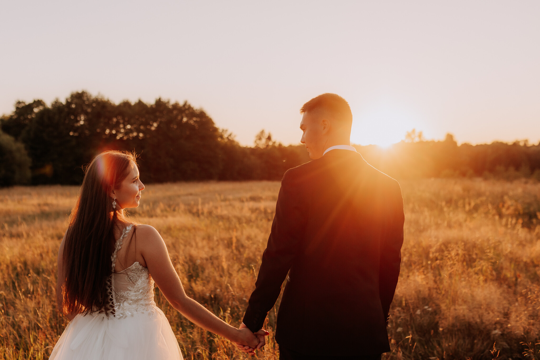 Zaczęliśmy przy słonecznikach posadzonych przez mojego tatę. Wysokie, zwrócone w stronę słońca, wyglądały jak naturalna scenografia stworzona dokładnie na ten wieczór. Kasia i Patryk weszli w ten kadr bardzo naturalnie, bez pozowania, bez napięcia. Światło było idealne. Taki zachód słońca, który nie krzyczy, tylko powoli otula wszystko dookoła 🌻