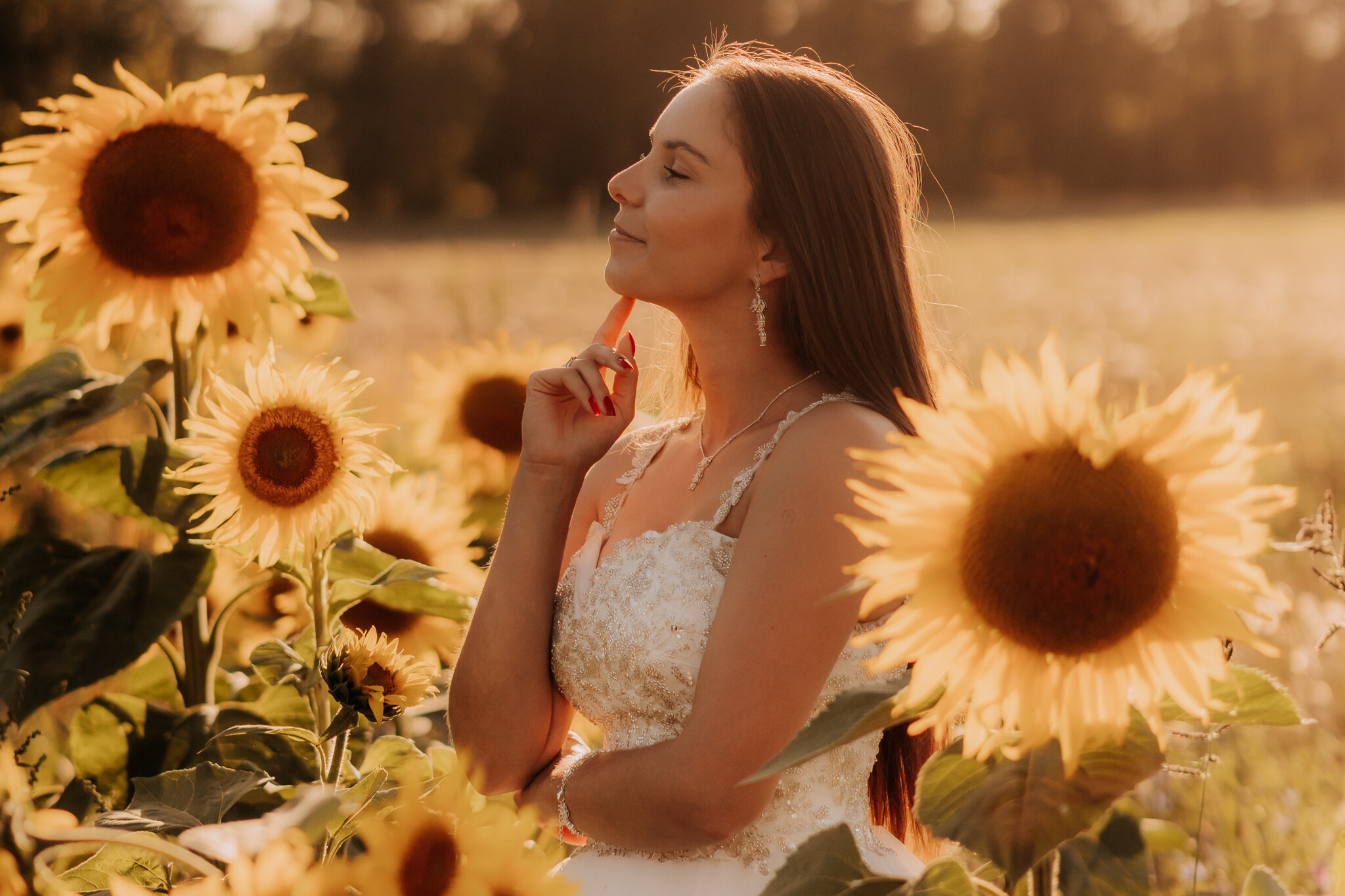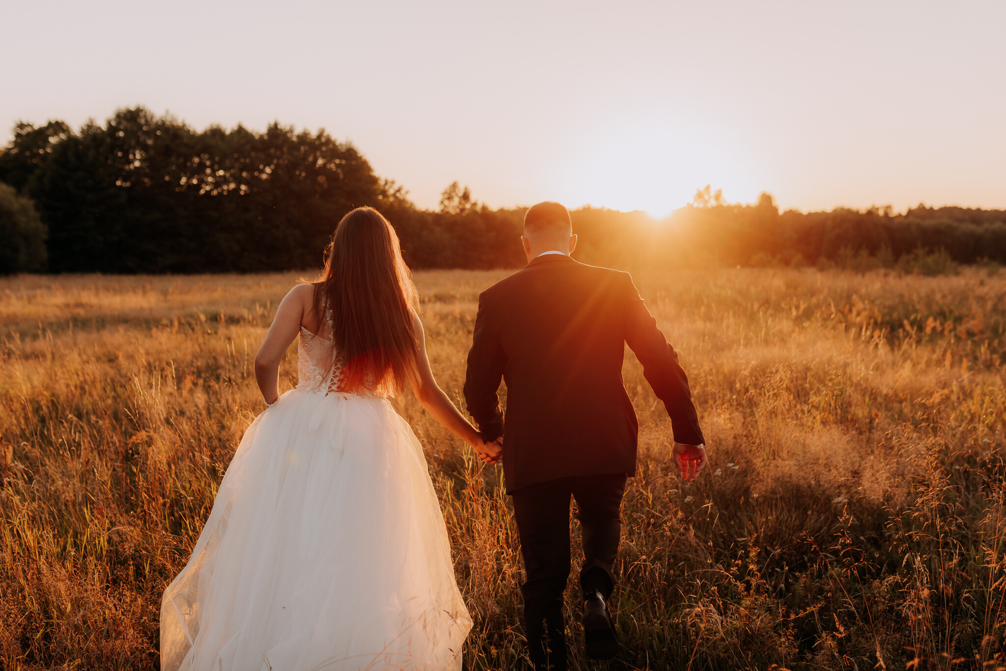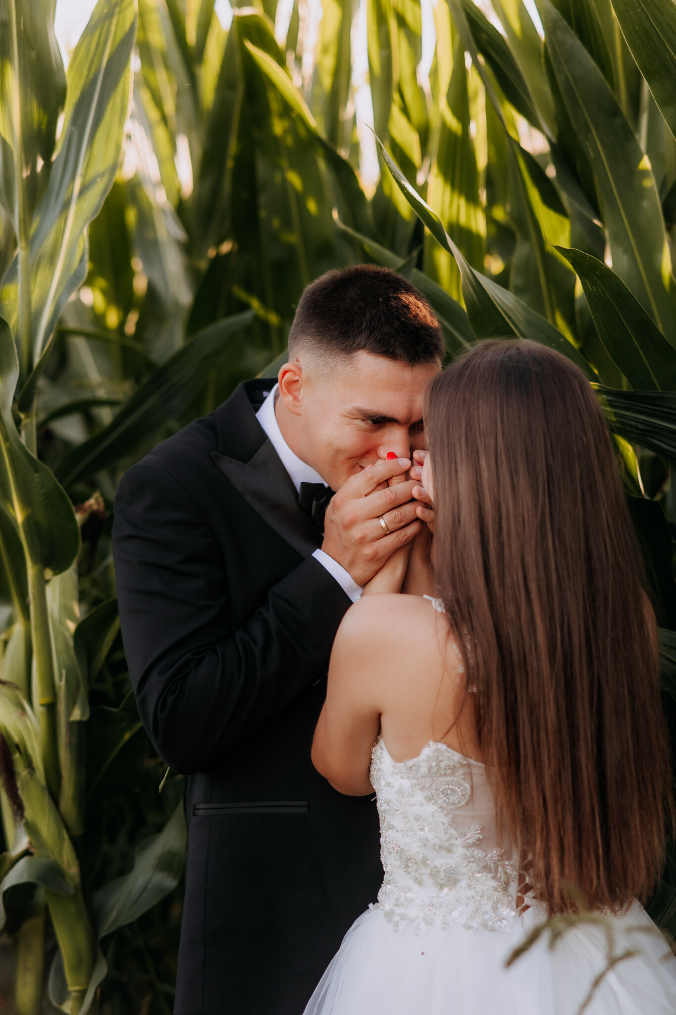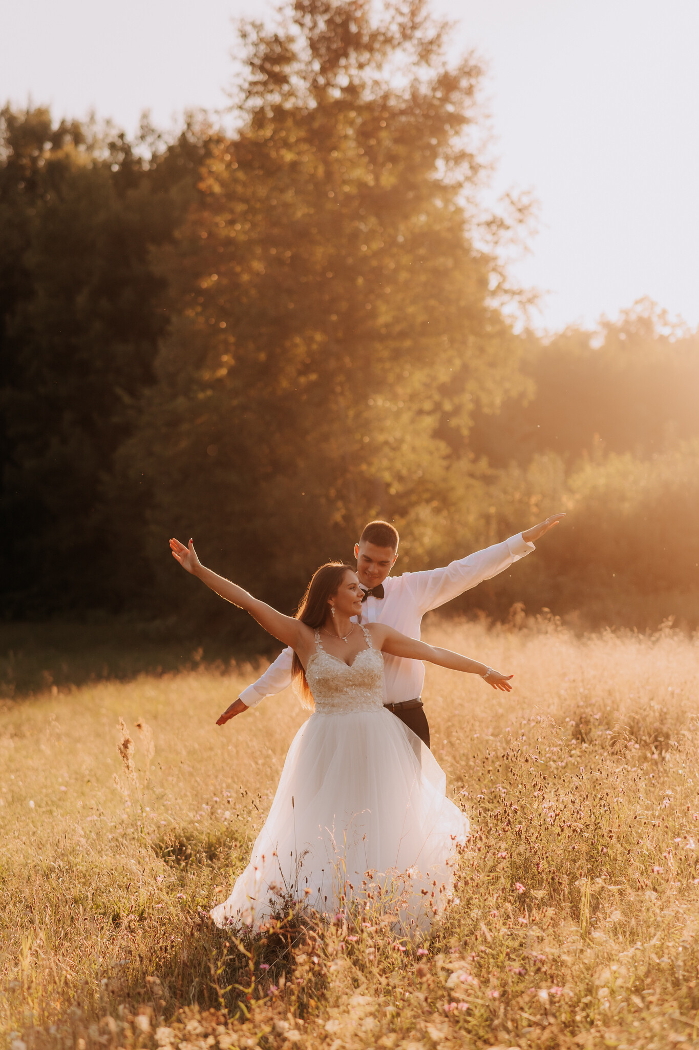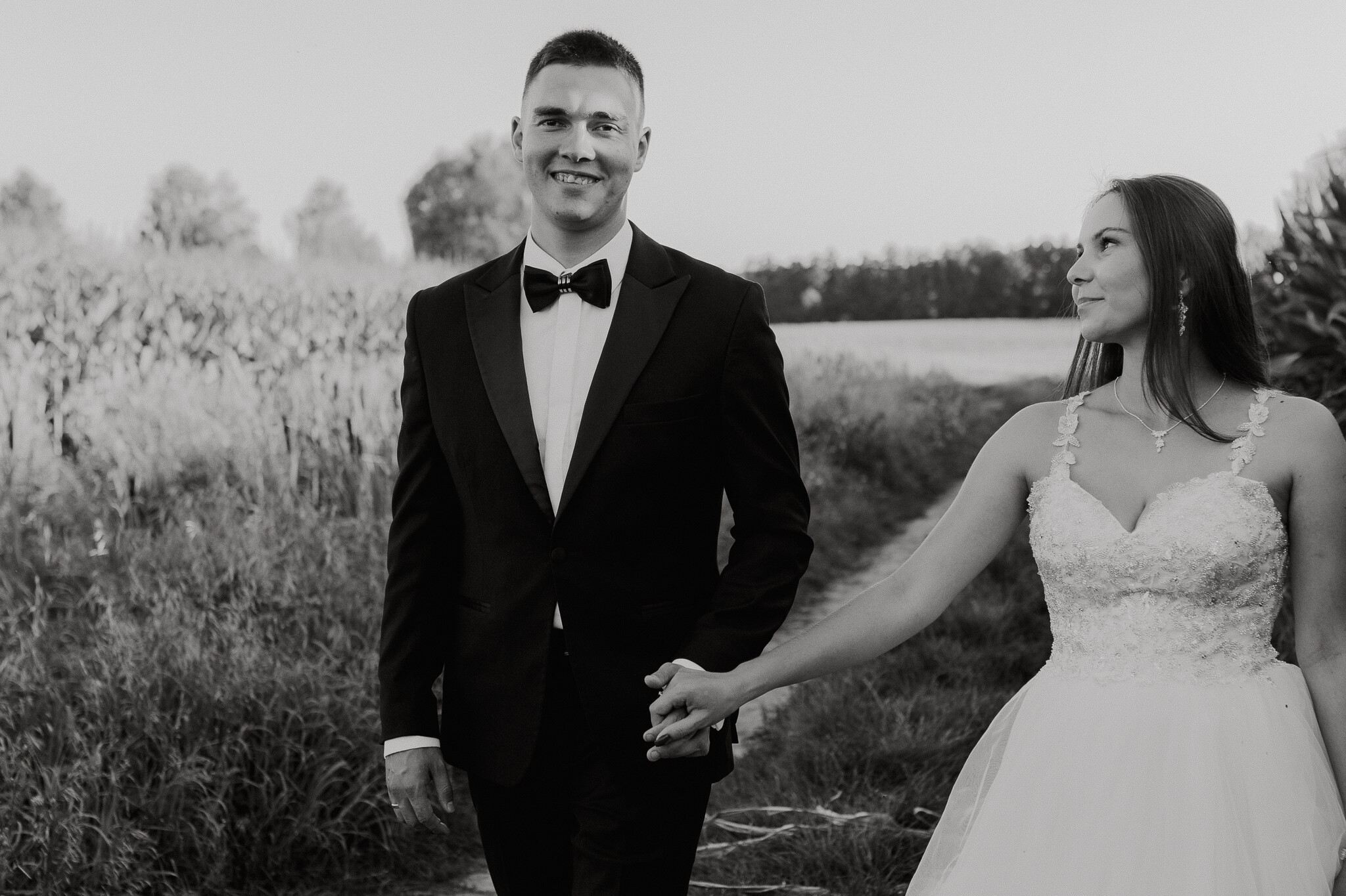 Zaczęliśmy przy słonecznikach posadzonych przez mojego tatę. Wysokie, zwrócone w stronę słońca, wyglądały jak naturalna scenografia stworzona dokładnie na ten wieczór. Kasia i Patryk weszli w ten kadr bardzo naturalnie, bez pozowania, bez napięcia. Światło było idealne. Taki zachód słońca, który nie krzyczy, tylko powoli otula wszystko dookoła 🌻