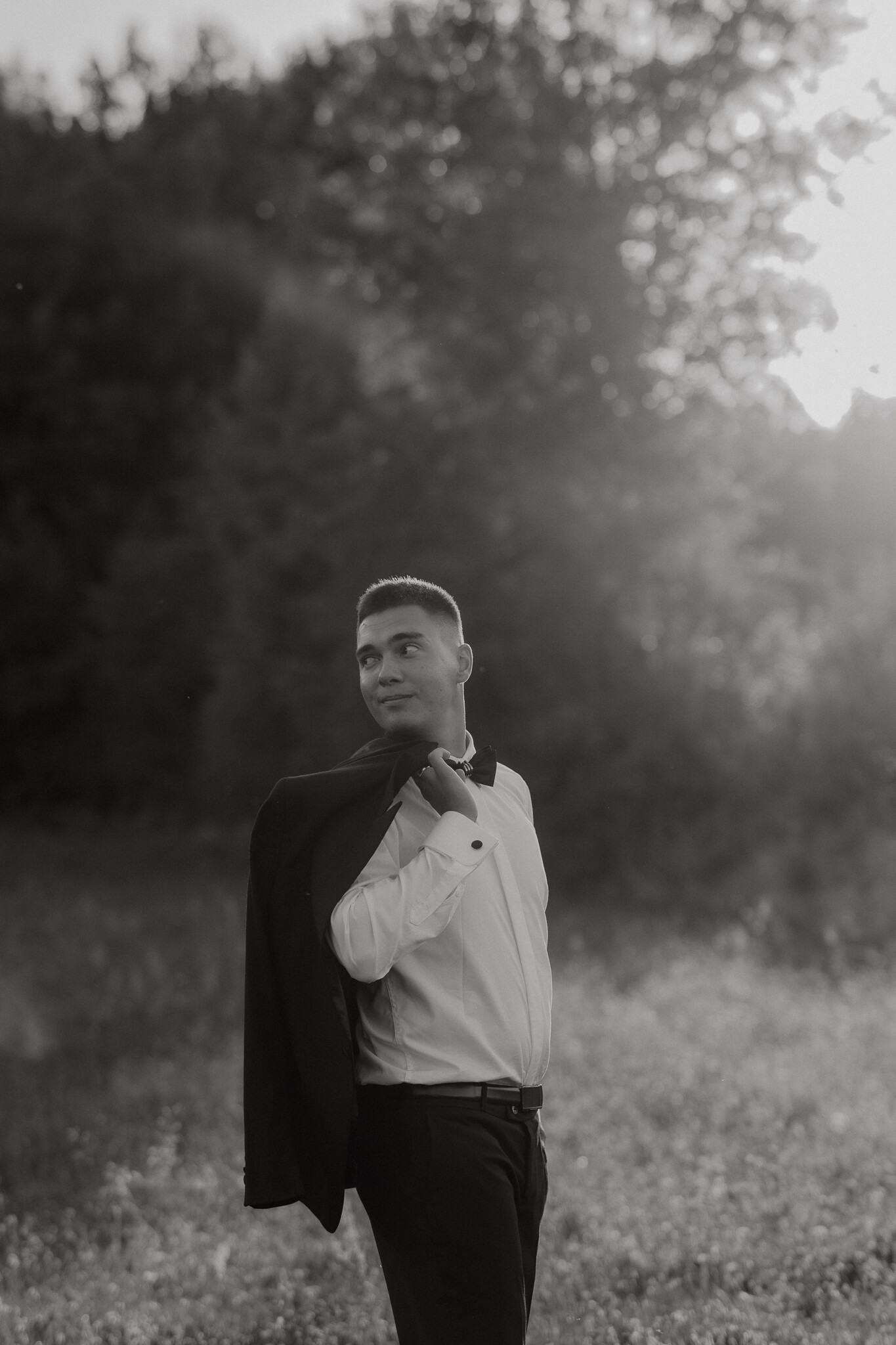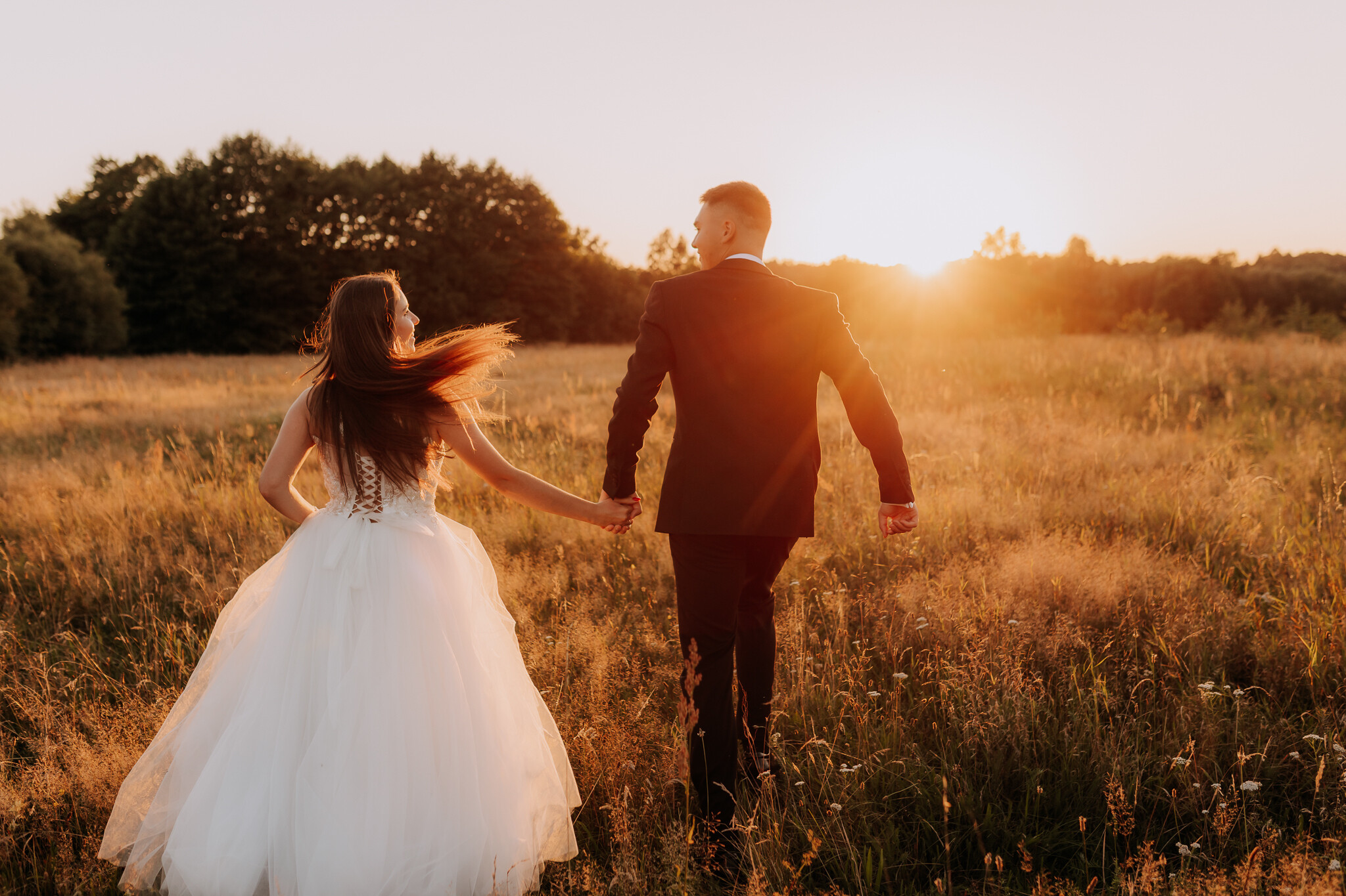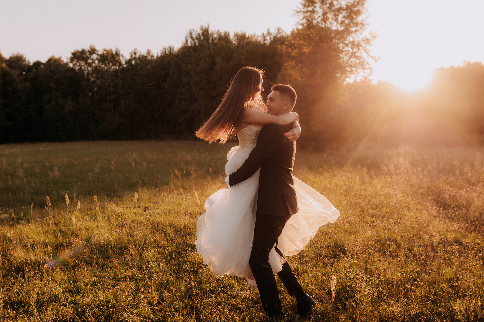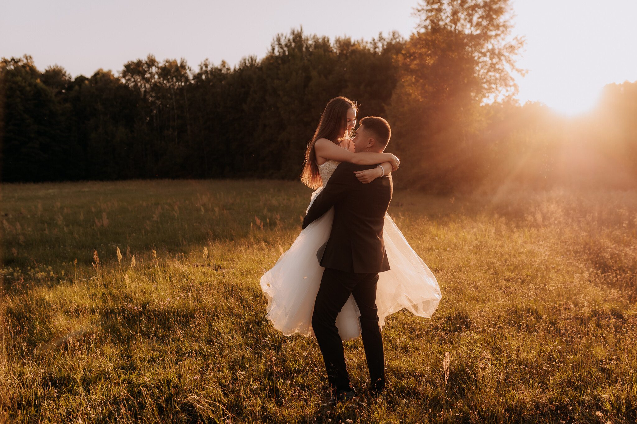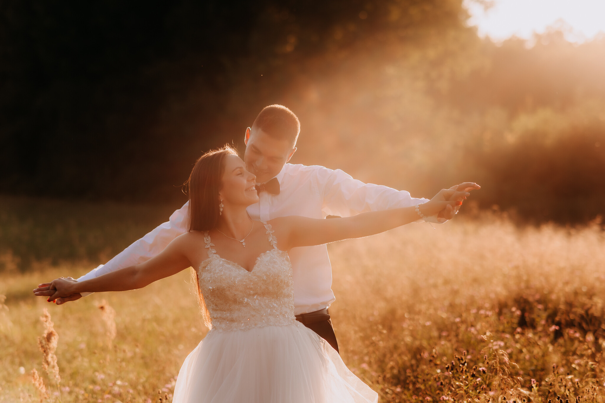 Zaczęliśmy przy słonecznikach posadzonych przez mojego tatę. Wysokie, zwrócone w stronę słońca, wyglądały jak naturalna scenografia stworzona dokładnie na ten wieczór. Kasia i Patryk weszli w ten kadr bardzo naturalnie, bez pozowania, bez napięcia. Światło było idealne. Taki zachód słońca, który nie krzyczy, tylko powoli otula wszystko dookoła 🌻