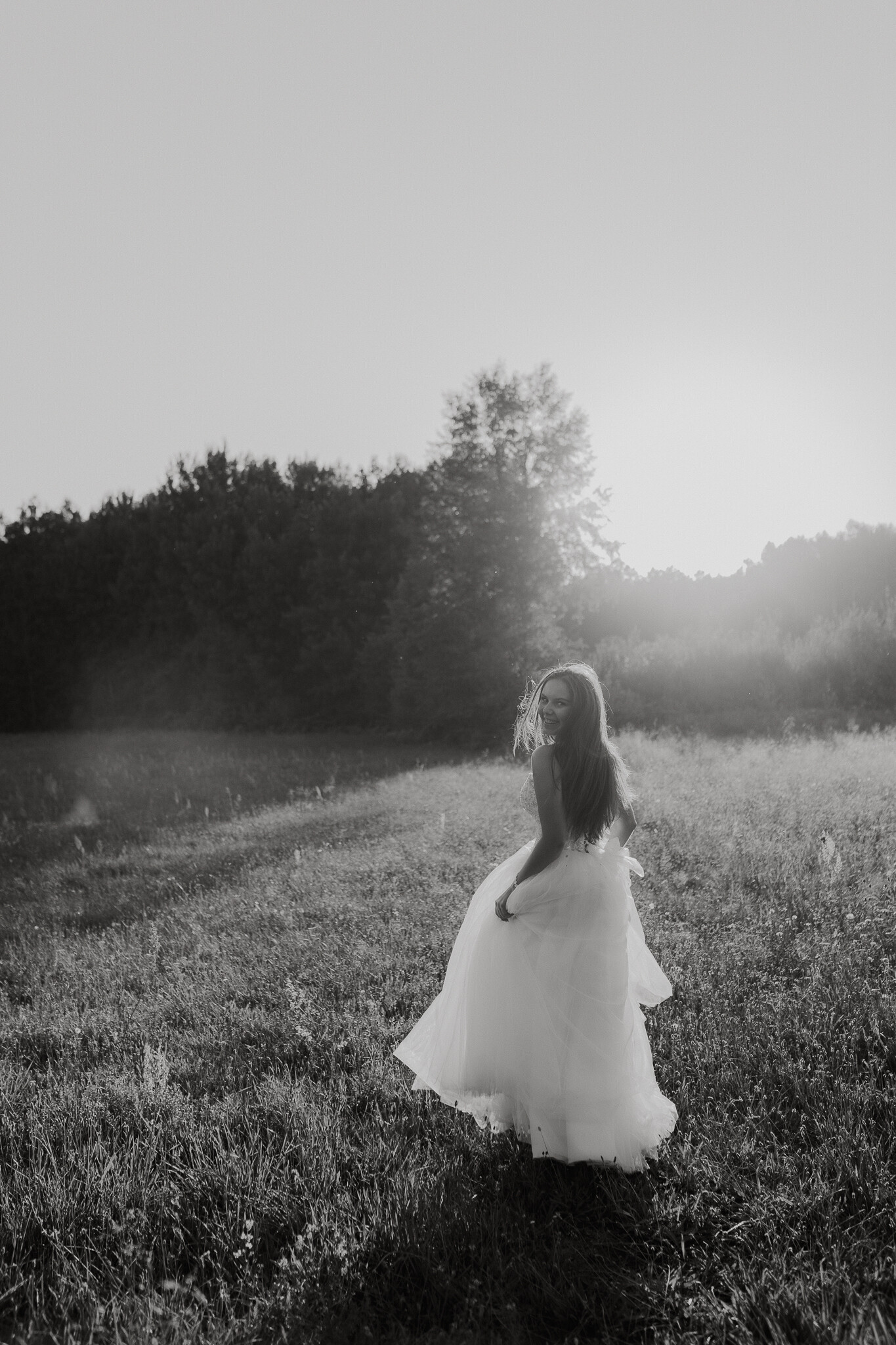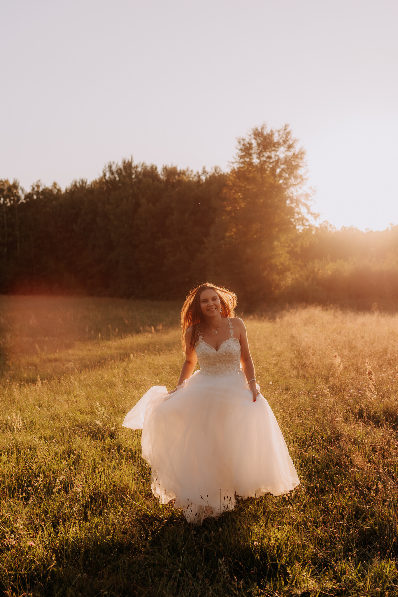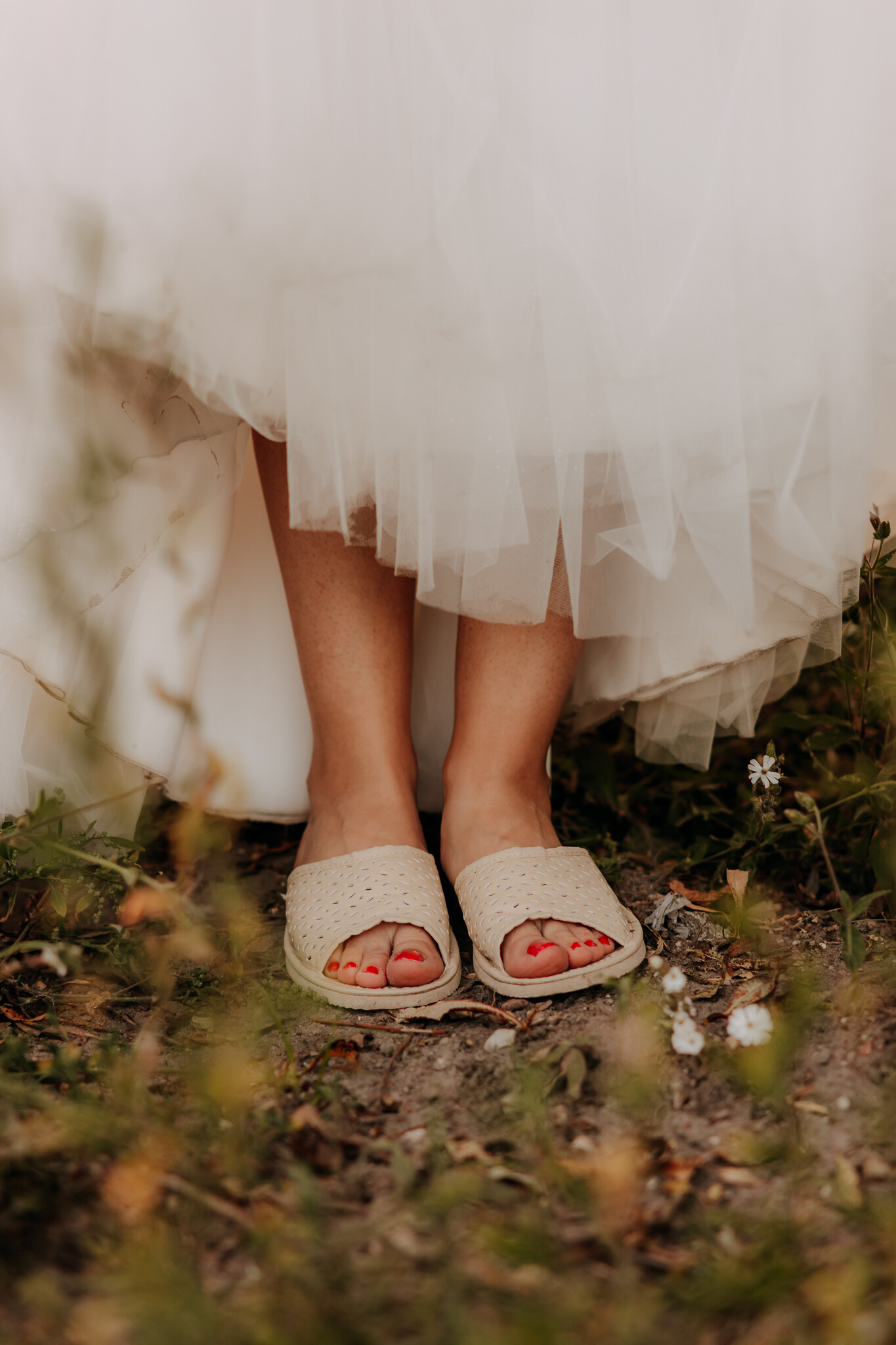 Na koniec, gdy słońce było już nisko, Kasia zrobiła coś absolutnie właściwego. Zmieniła buty na wygodne klapki. Bo ta sesja od początku była o swobodzie. O byciu tu i teraz. O chodzeniu po łące bez zastanawiania się, czy wypada.