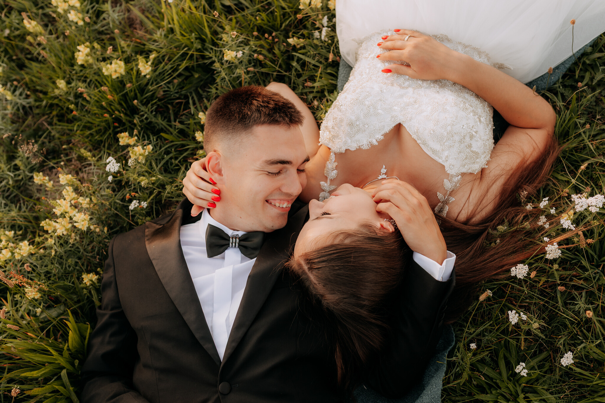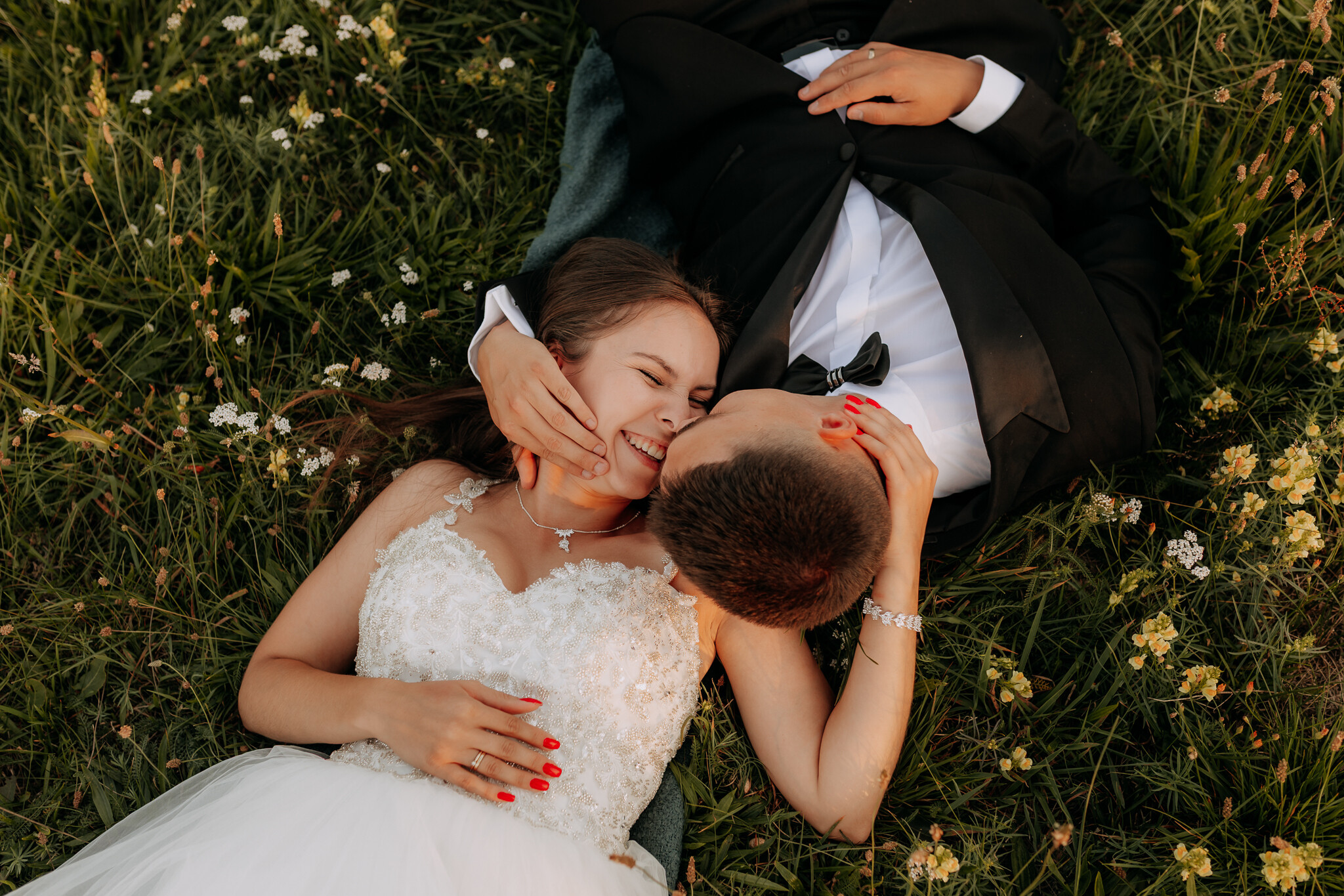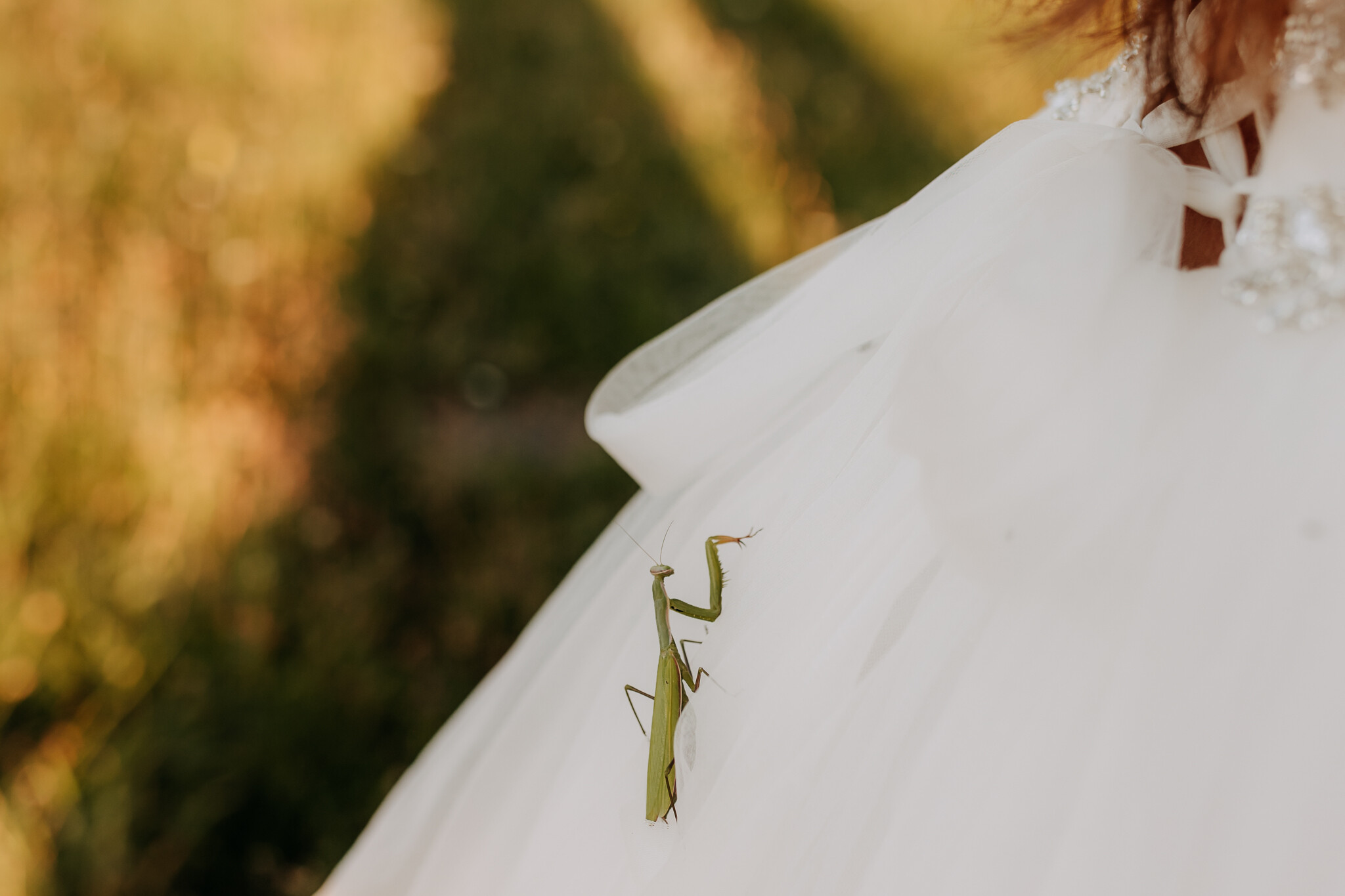 Potem była kukurydza. Gęsta, wysoka, dająca poczucie intymności. Kilka kadrów powstało niemal szeptem, między liśćmi, w półcieniu, gdzie spojrzenia mówią więcej niż gesty. Następnie łąka kwietna. Miękka, kolorowa, pachnąca latem. Właśnie tam wydarzył się jeden z tych momentów, których nie da się zaplanować. Na Kasi usiadła modliszka. Zamiast paniki był śmiech, ciekawość i chwila, która została nie tylko na zdjęciach, ale i w pamięci 🦗
